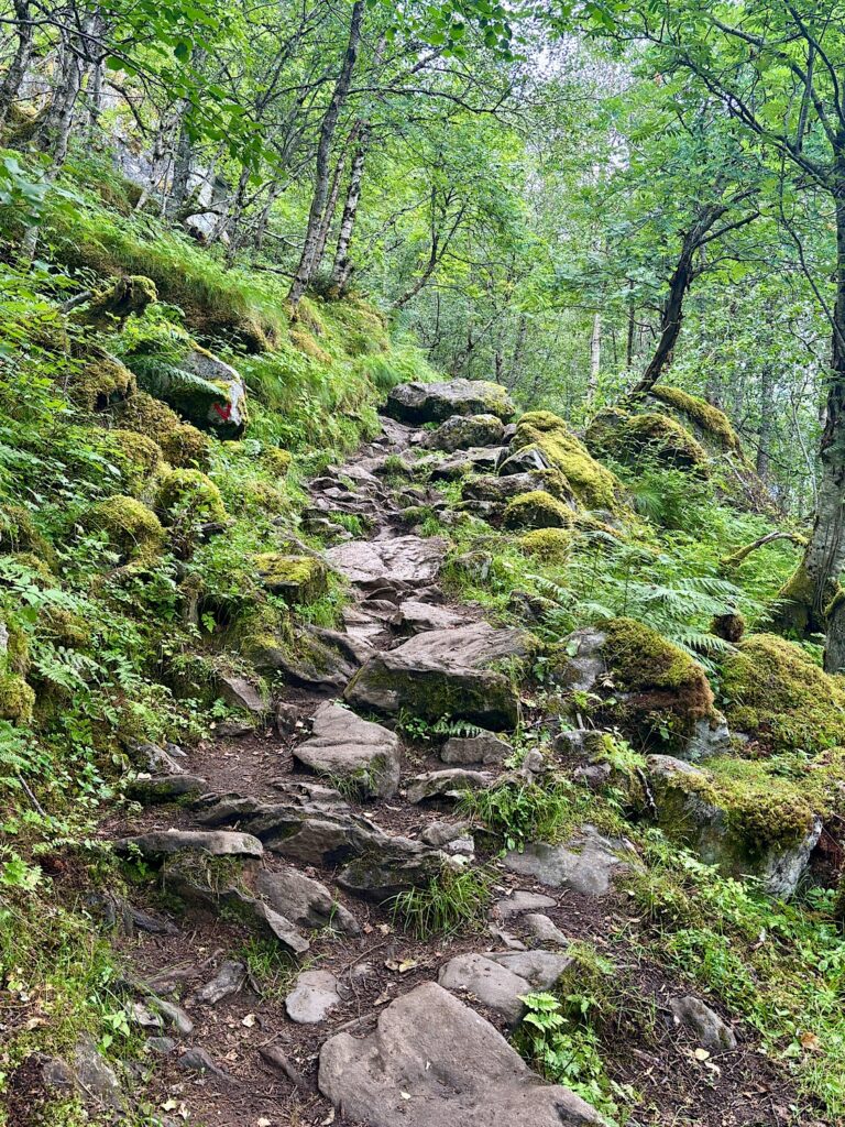 Au-delà de ce point de vue, le chemin descend vers l’ancienne ferme de Skageflå. Sur le coup on ressent un soulagement car jusqu’ici nous n’avons fait que monter et les jambes chauffent. Sauf que ça descend très très fort. On aperçoit la vieille ferme tout en bas et on se dit qu’il ne va pas être facile d’y accéder ni d’en repartir ! J’émets l’idée de pique-niquer en haut, avec cette belle vue sur le fjord et la ferme mais Léo est déjà parti loin devant donc on descend.