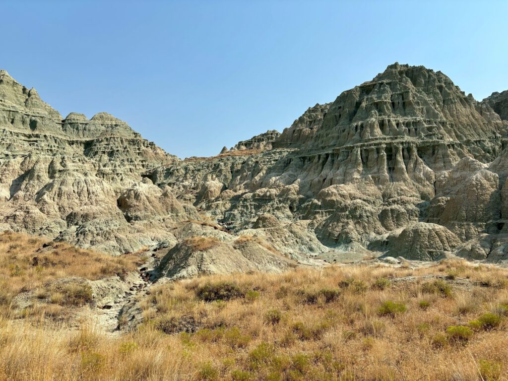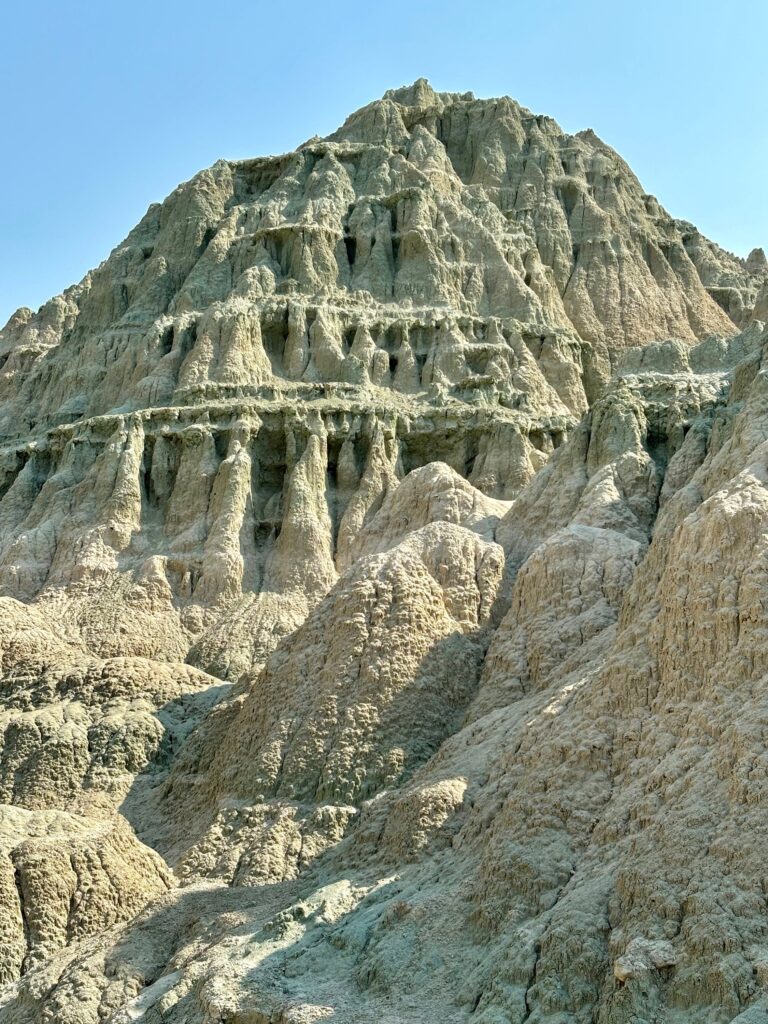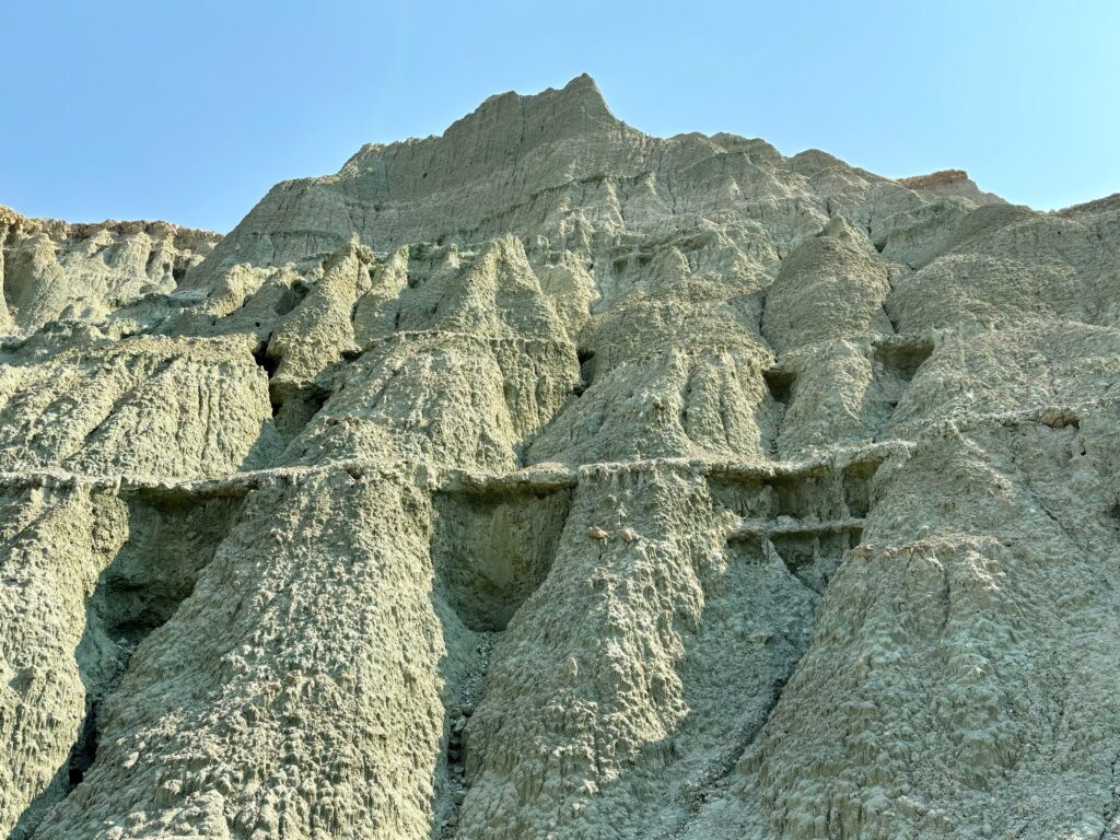 Nous partons donc sur le chemin de 2 km. Comme hier, on trouve des roches argileuses friables dans les tons bleu-vert qui, modelées par la pluie et le vent, forment de jolies colonnes toutes striées.
