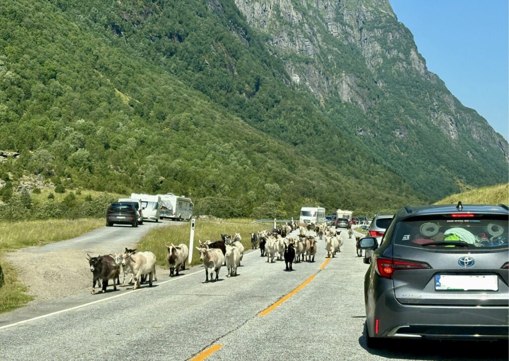 À un moment, on tombe sur un ralentissement sur la route. On en comprend vite la cause 😅 De notre côté ça va, mais les automobilistes coincés derrière le troupeau font des mines désespérées. Il y a bien 500 mètres de bouchons de leur côté.