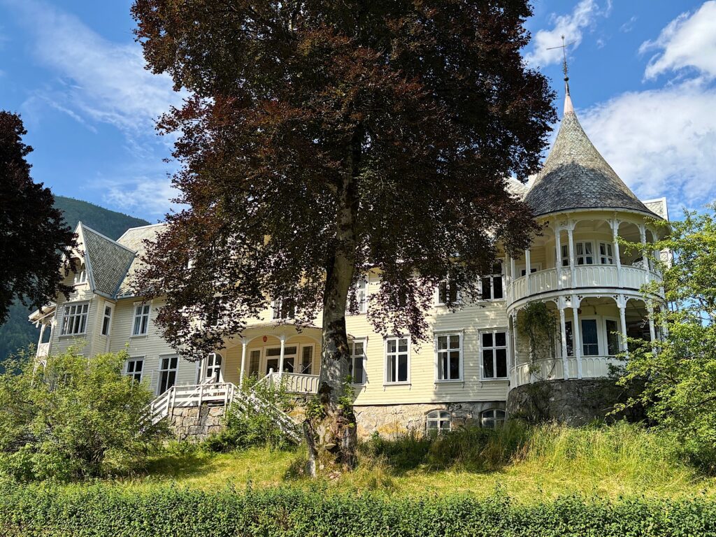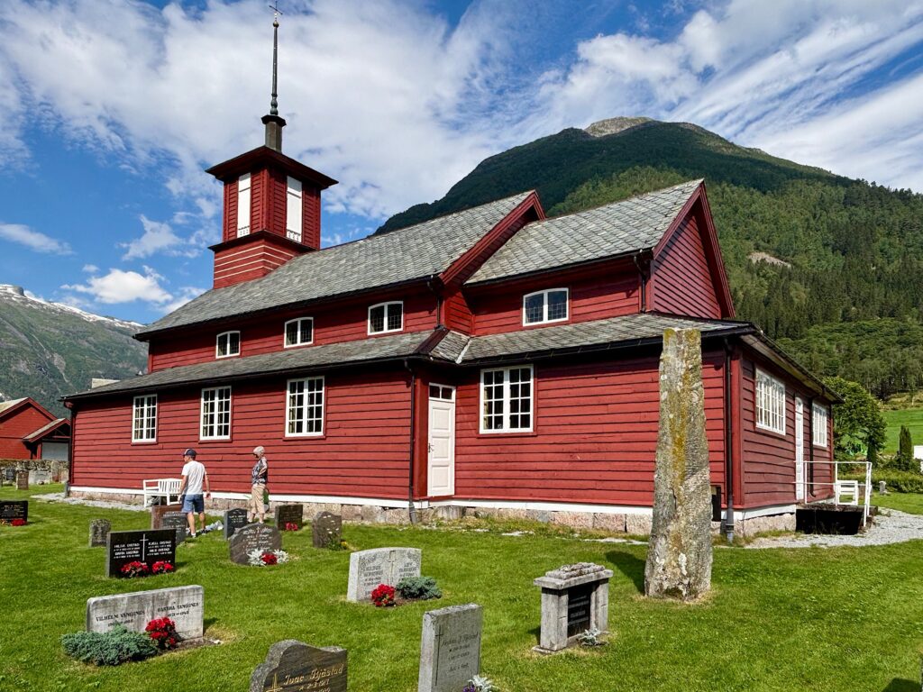 Le premier arrêt est pour Fjaerland, un village paisible posé au bord d’un bras du Sognefjord. Il n’y a pas un bruit autre que les mouettes qui semblent un peu énervées. L’hôtel Mundal, datant du 19ème siècle, et la petite église en bois rouge bénéficient d’un environnement de toute beauté.