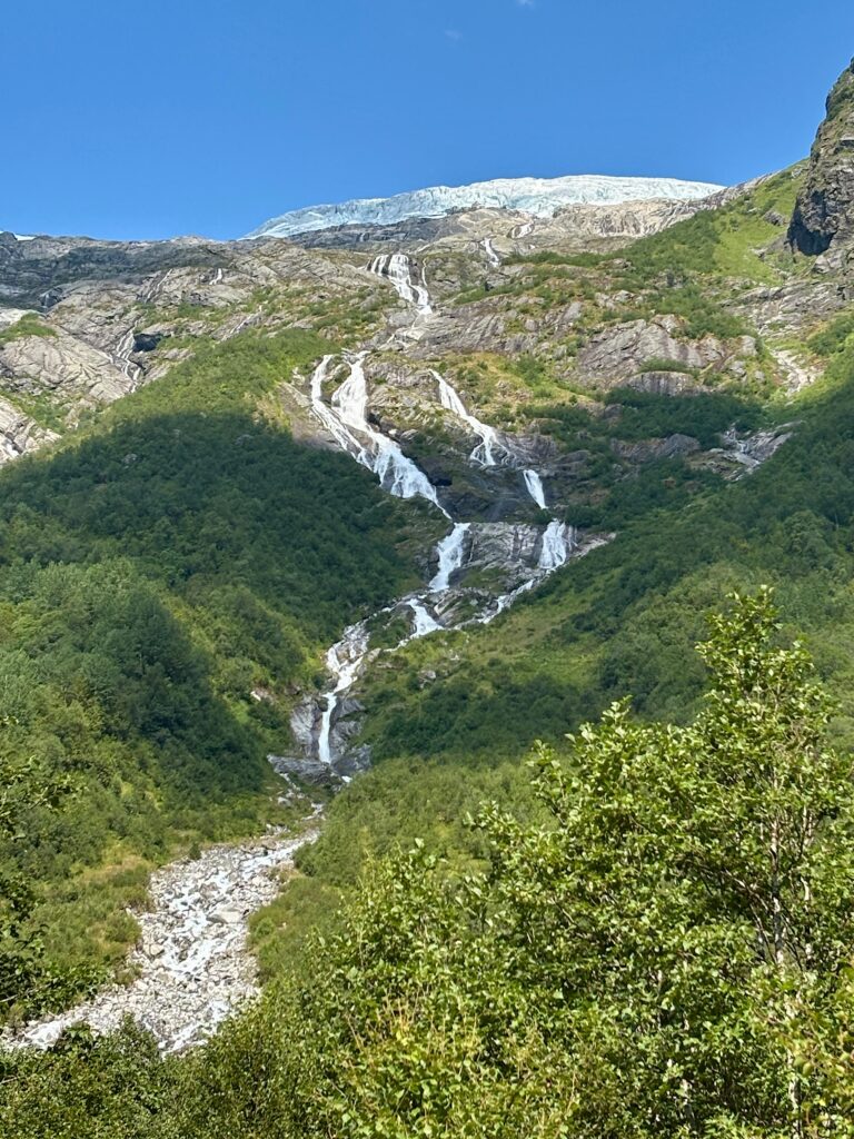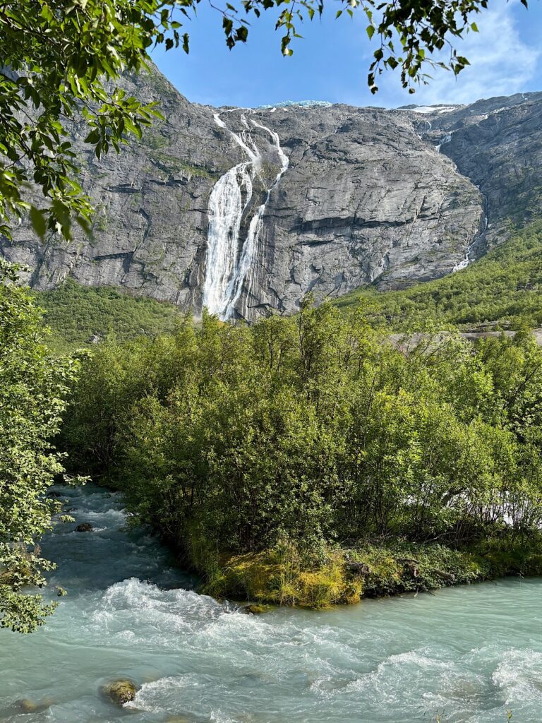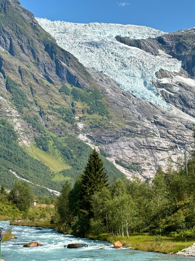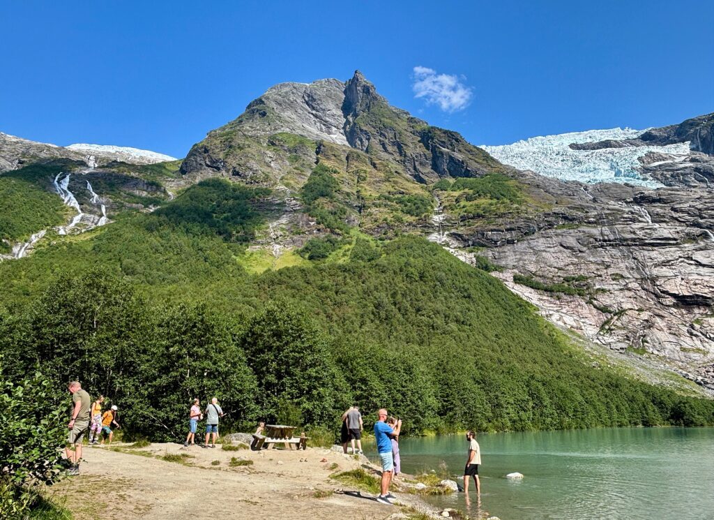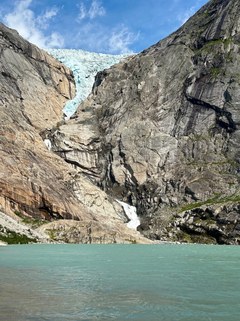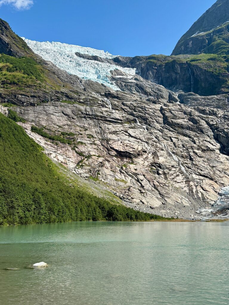 À quelques kilomètres de Fjaerland, le Bøyabreen se voit depuis la route. Une courte balade permet d’aller jusqu’au lac qui recueille les eaux glaciaires. À gauche du Bøyabreen, on aperçoit juste le bord d’une autre langue du glacier qui a sûrement fondu.