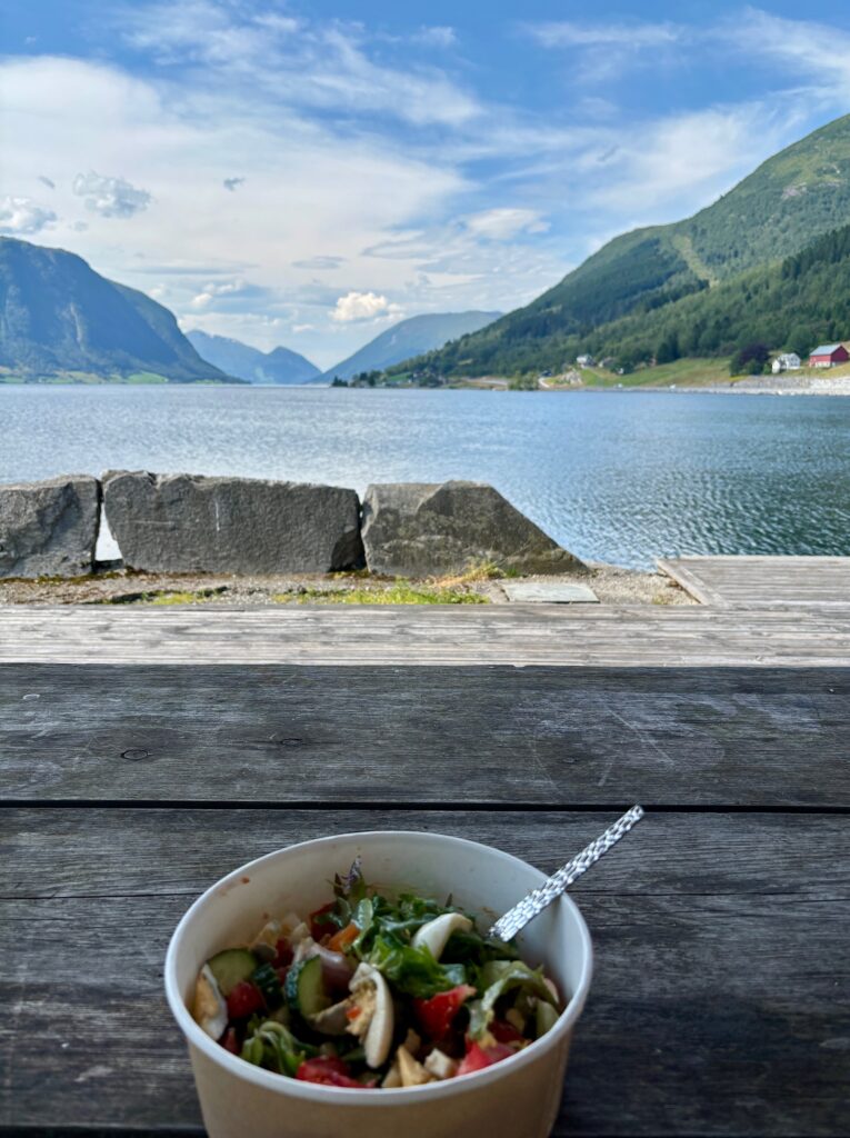 Nous faisons une pause pique-nique à Skei. C’est parfait comme endroit, il y a une supérette Joker avec un bar à salade, et en face, des tables ombragées face au lac.