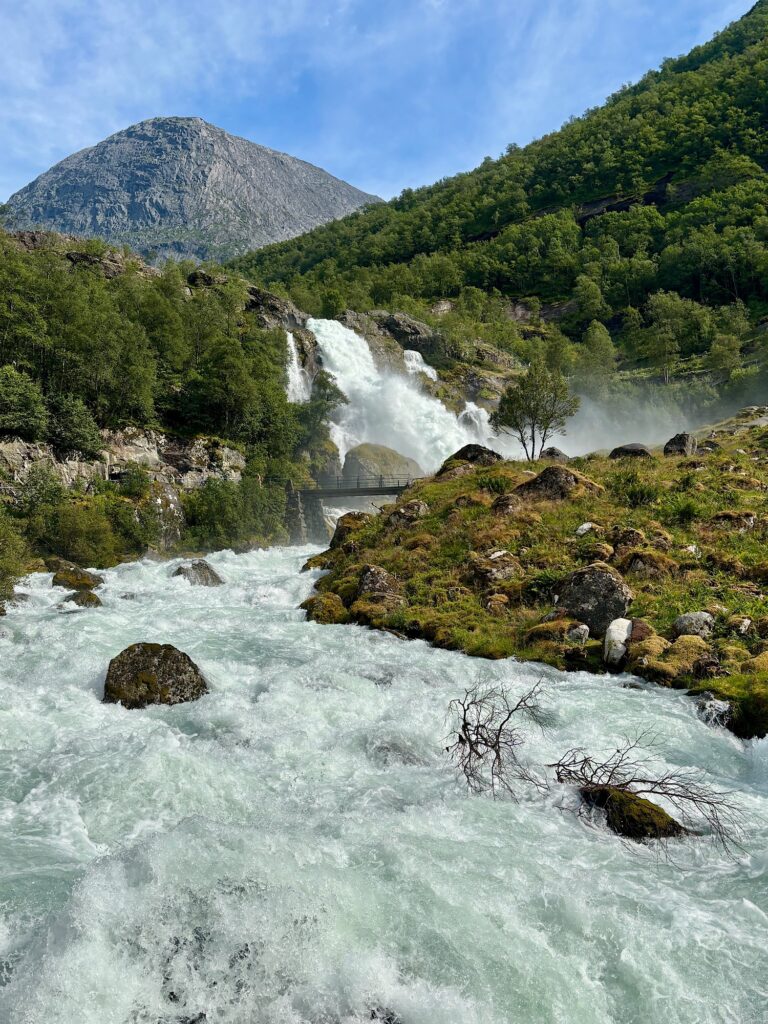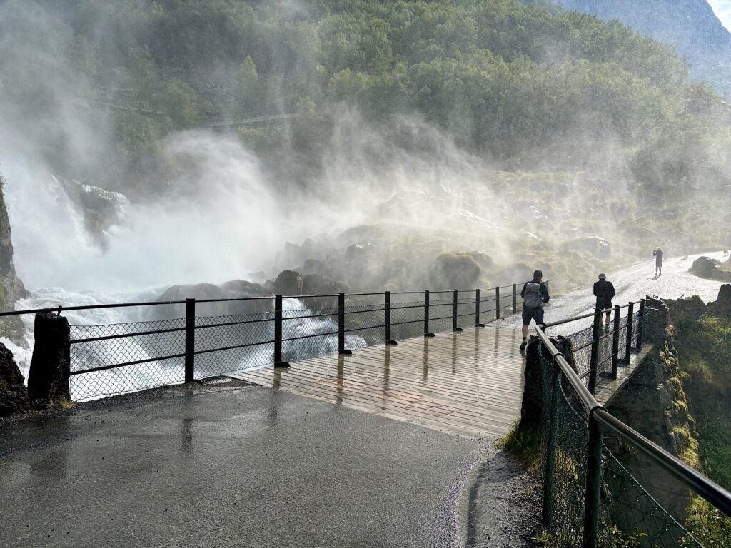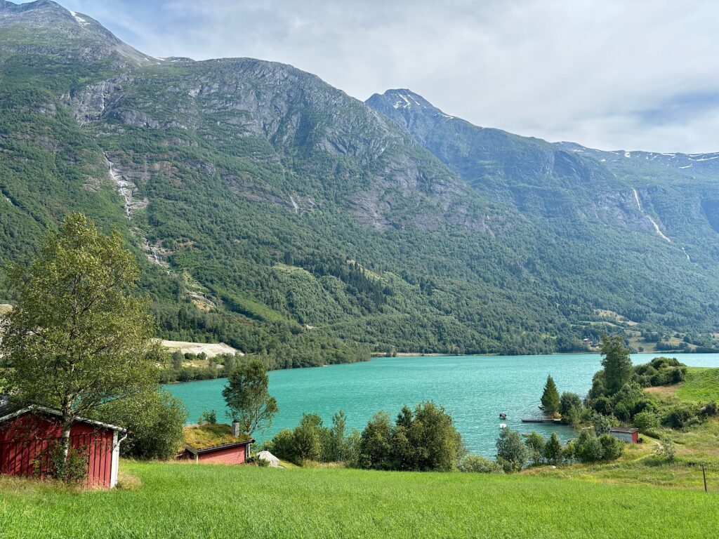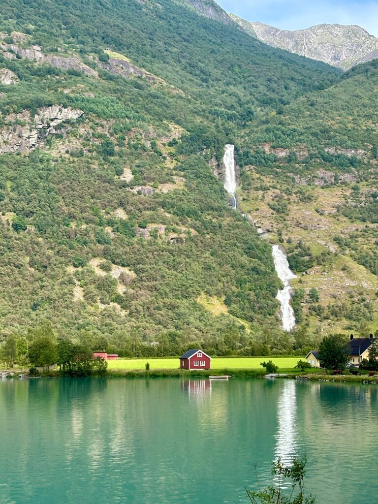À l’aller comme au retour, la route longe le lac Oldevatnet, encadré de montagnes d’où coulent d’innombrables cascades. Entre le bleu turquoise du lac, les chutes d’eau et les cabanes rouges, on a sous les yeux un véritable paysage de carte postale qui pourrait servir de publicité à l’office de tourisme de Norvège !