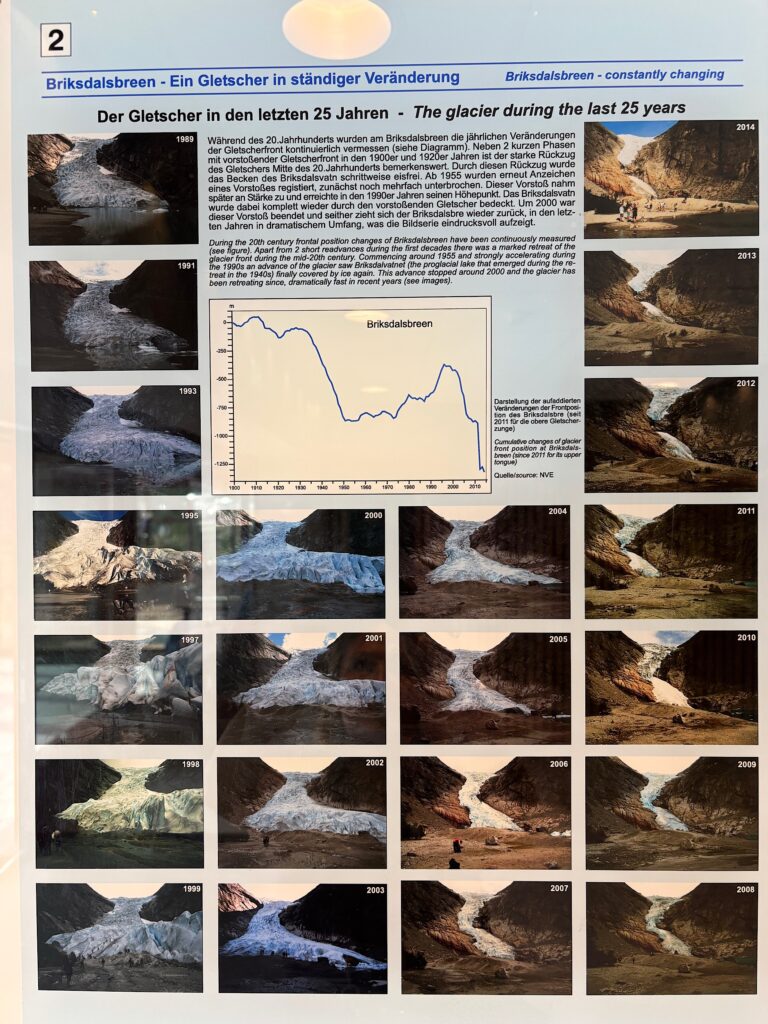 À la cafétéria, un panneau montre l’évolution du recul du Brikdalsbreen. On voit que ça ne date pas d’aujourd’hui mais, ce qui est surprenant, c’est que des années 50 aux années 90 le glacier s’est reconstitué avant de décliner à nouveau et de façon dramatiquement rapide depuis l’an 2000.