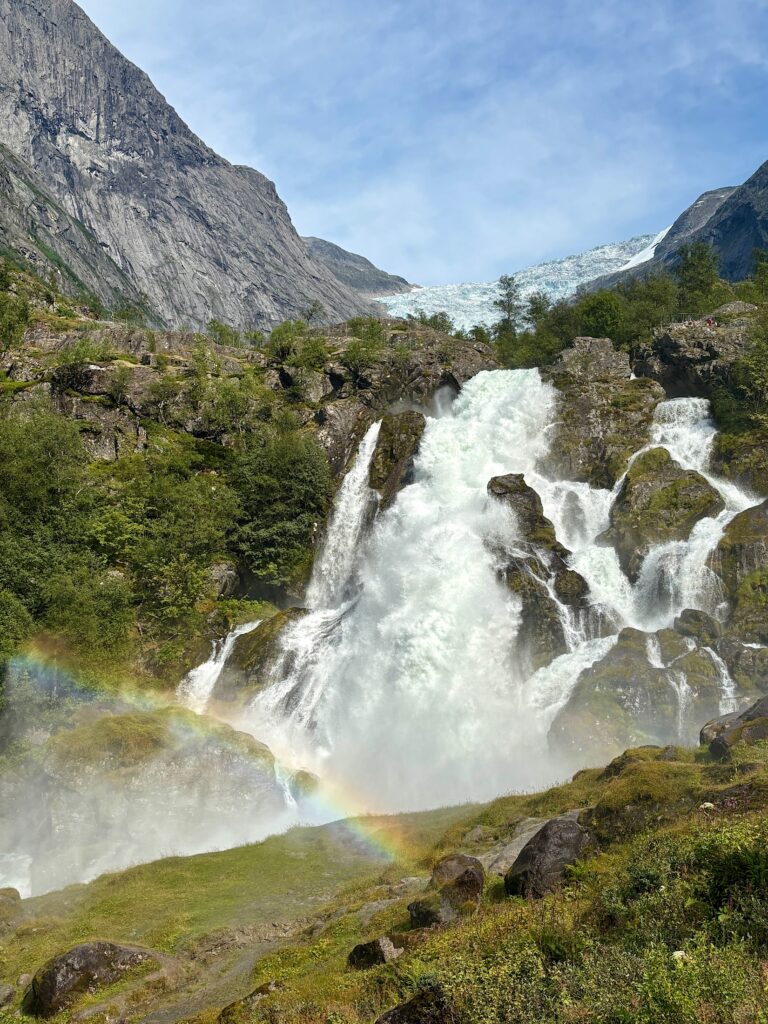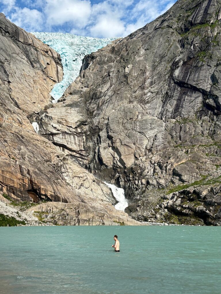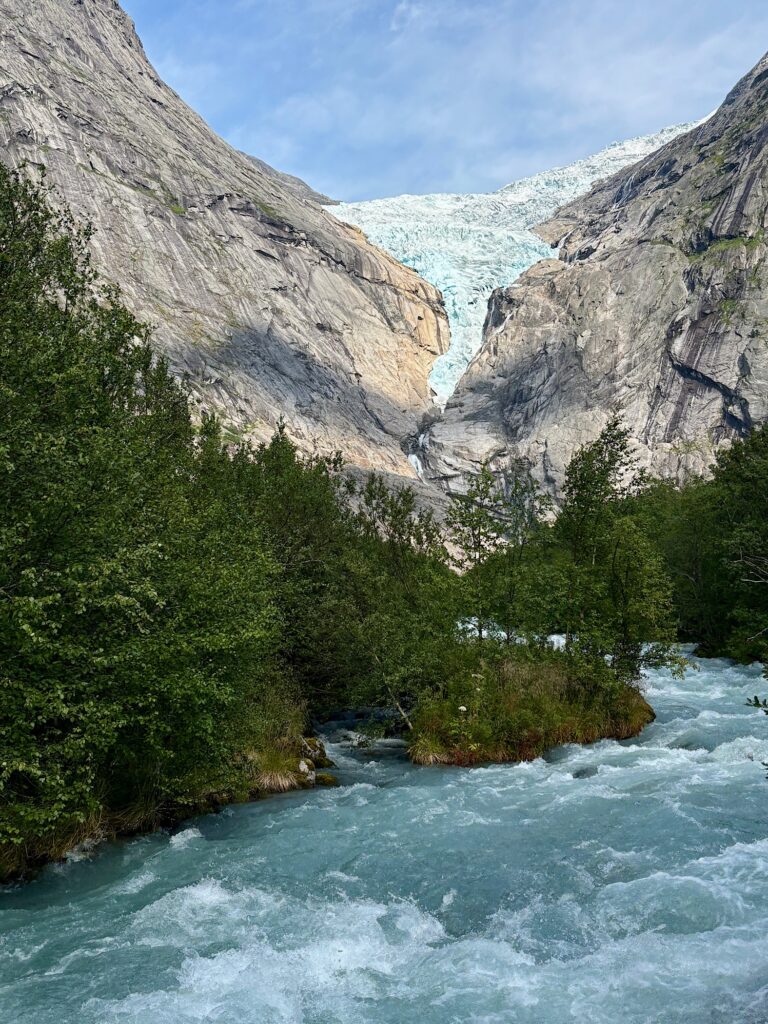 Après s’être installés dans notre chalet dans la vallée d’Olden, nous continuons notre exploration du Jostedalsbreen en marchant jusqu’au pied du Brikdalsbreen. Nous sommes désormais au nord-ouest du parc national. Une randonnée facile de 6 km aller-retour mène au lac glaciaire en longeant la rivière tumultueuse qui s’en écoule.