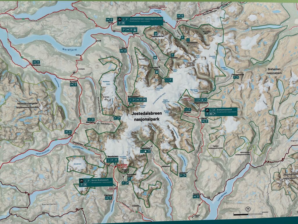 Avant-hier nous étions au pied du Nigardsbreen ; ce matin nous avons contourné le méga glacier Jostedals et sommes sur son flanc sud-ouest, prêts à découvrir une autre partie de ce géant. Cette carte permet de visualiser le glacier dans son ensemble.