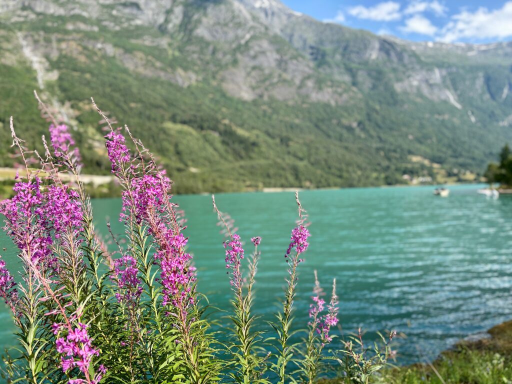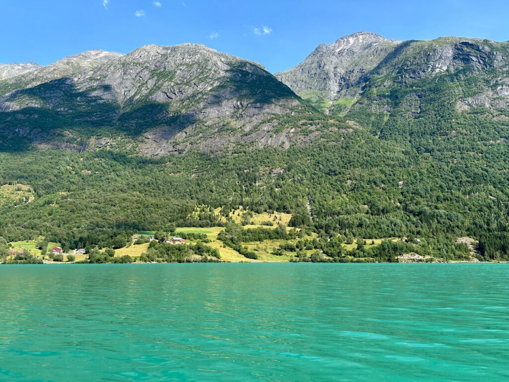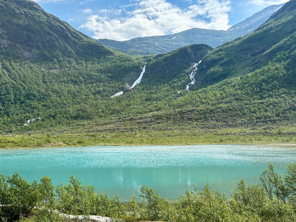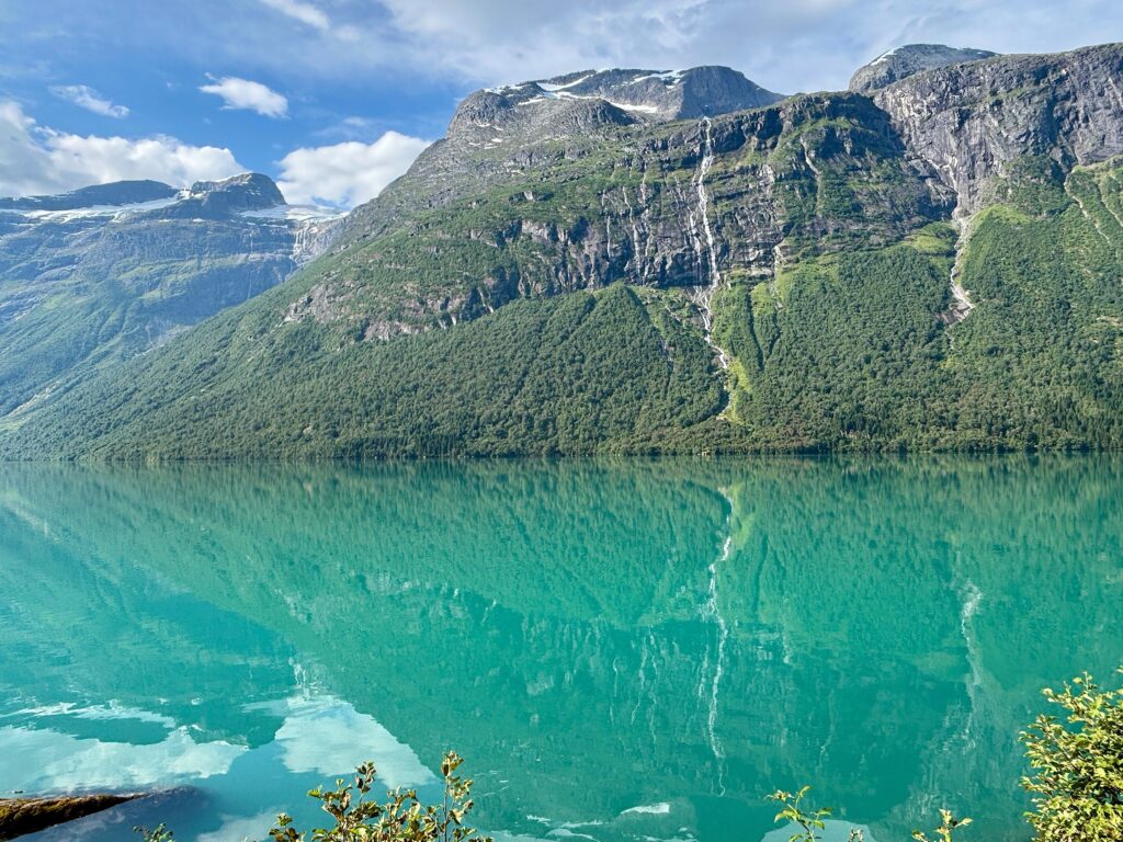 Histoire de randonner à la fraîche, nous partons du chalet vers 9h en direction du Lovatnet. Ce lac, comme le Oldevatnet au pied de notre logement, est d’un bleu hallucinant. Et en cette matinée sans vent, l’effet miroir est parfait.