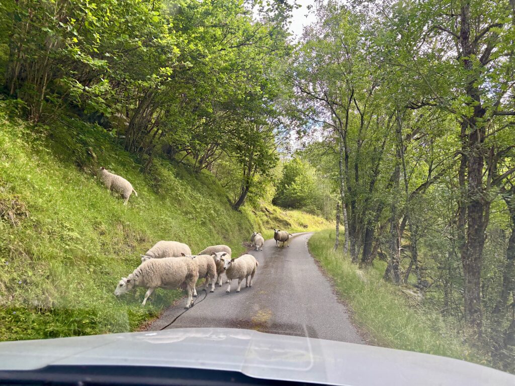 Un peu avant le fond du lac, on prend une route étroite et sinueuse (et payante !) à gauche. Heureusement, on ne croise aucune voiture. Juste des moutons !