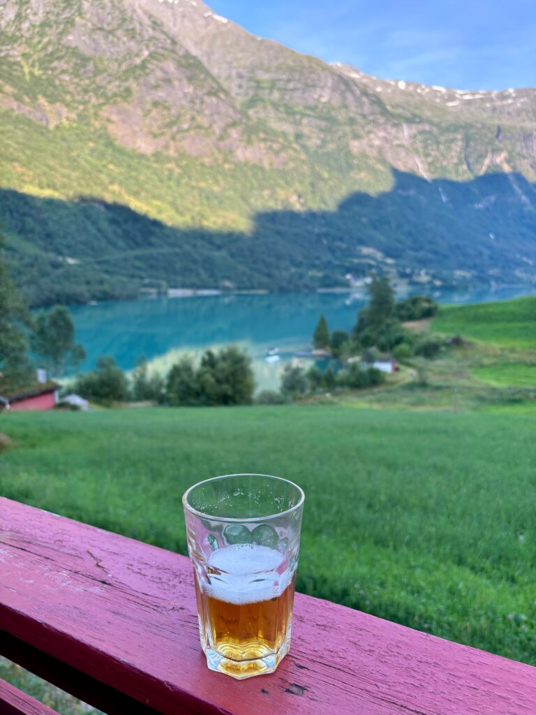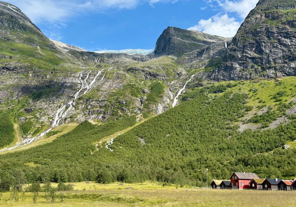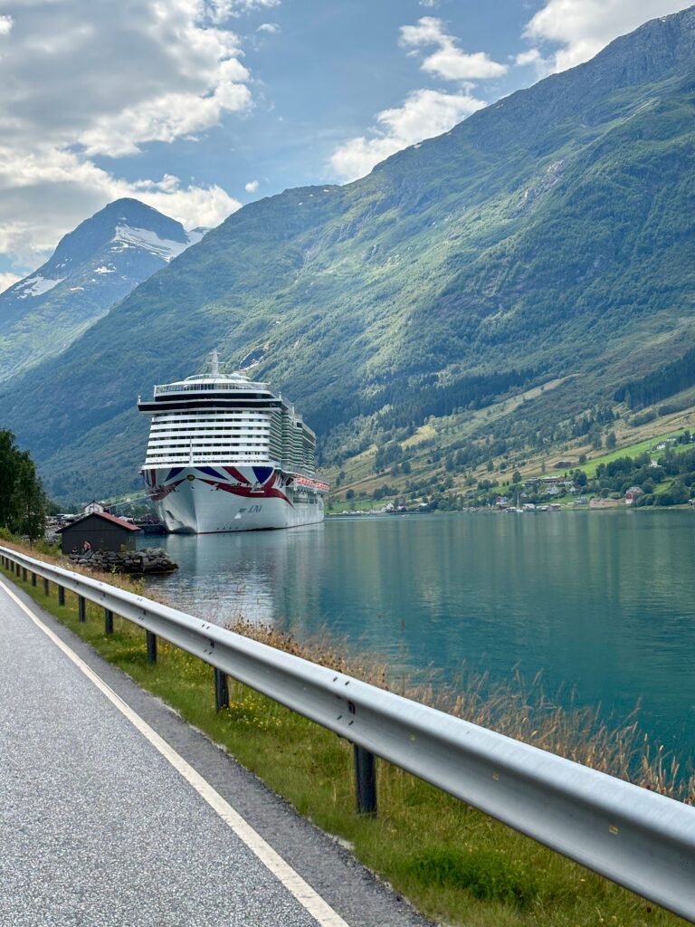 En arrivant à Olden, on passe à côté du même paquebot de croisière P&O qu’on avait vu à Stavanger. Plus de 5000 personnes font la queue pour monter dans des bus ou dans les petits trains touristiques. Le quai et le village sont noirs de monde. Ça donne vachement envie de faire une croisière 😅