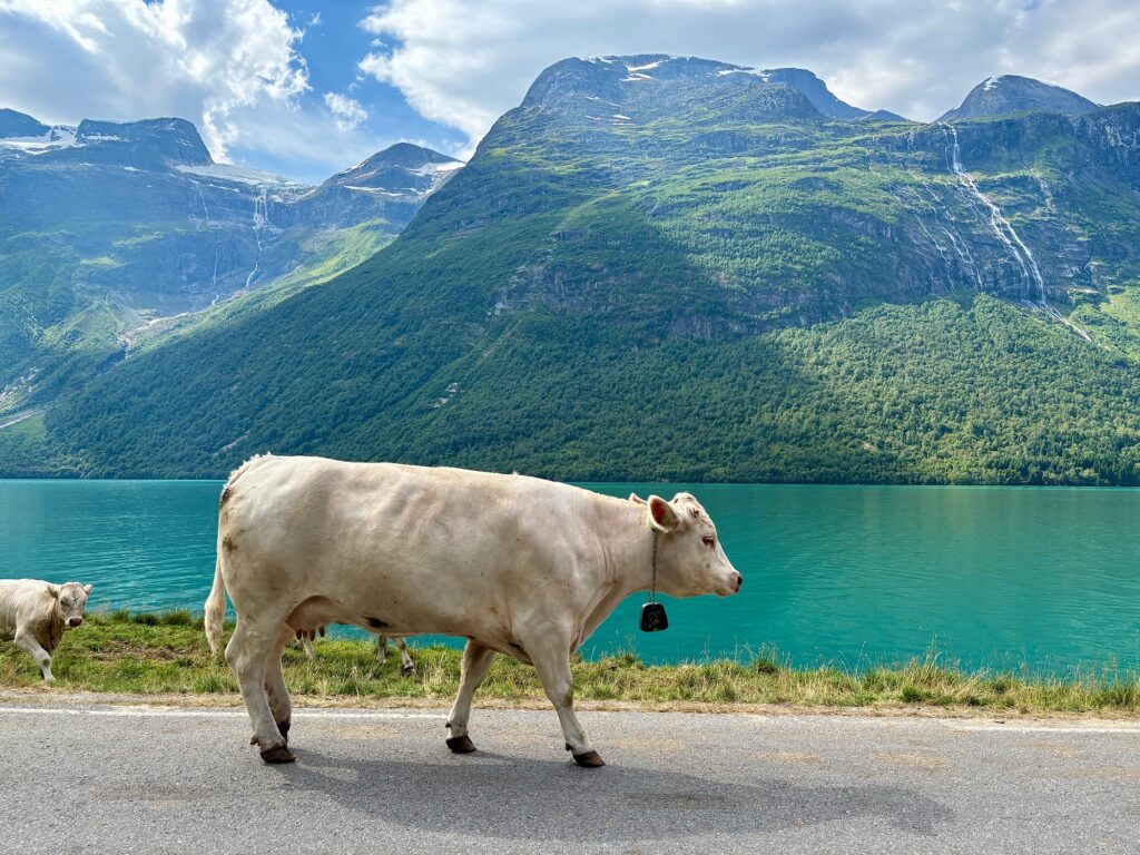 Après l’embouteillage provoqué par les moutons, on a droit aux vaches sur la route. Elles savent choisir leur spot pour se retrouver entre copines, c’est plutôt agréable de se promener au bord du lac !