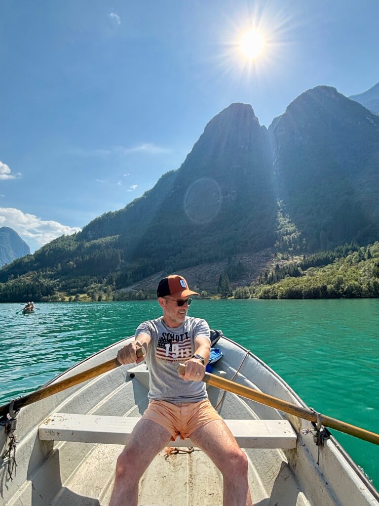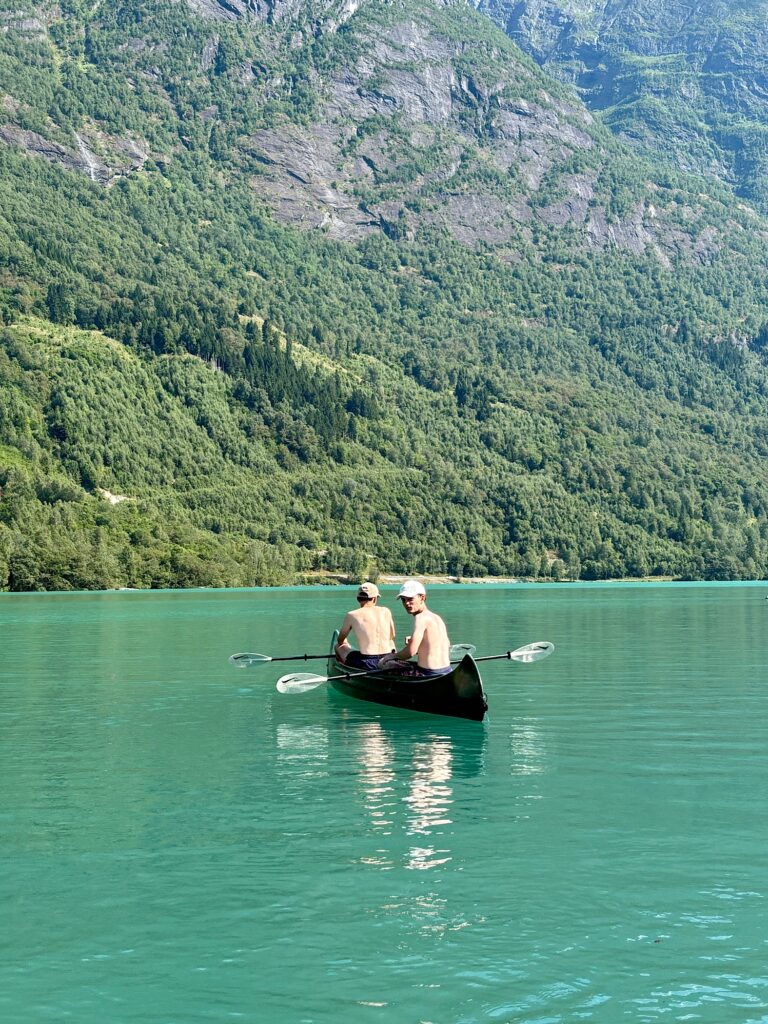 Vu le temps et la chaleur, on a décidé de faire une pause cet après-midi. J’avais vu qu’on pouvait emprunter un kayak à la ferme, donc je demande à la propriétaire et nous voilà partis sur le Oldevatnet. Par contre il n’y a qu’un kayak donc Laurent et moi prenons une barque. C’est beaucoup moins facile à manœuvrer et moins rapide. Laurent galère un peu (beaucoup en fait !).