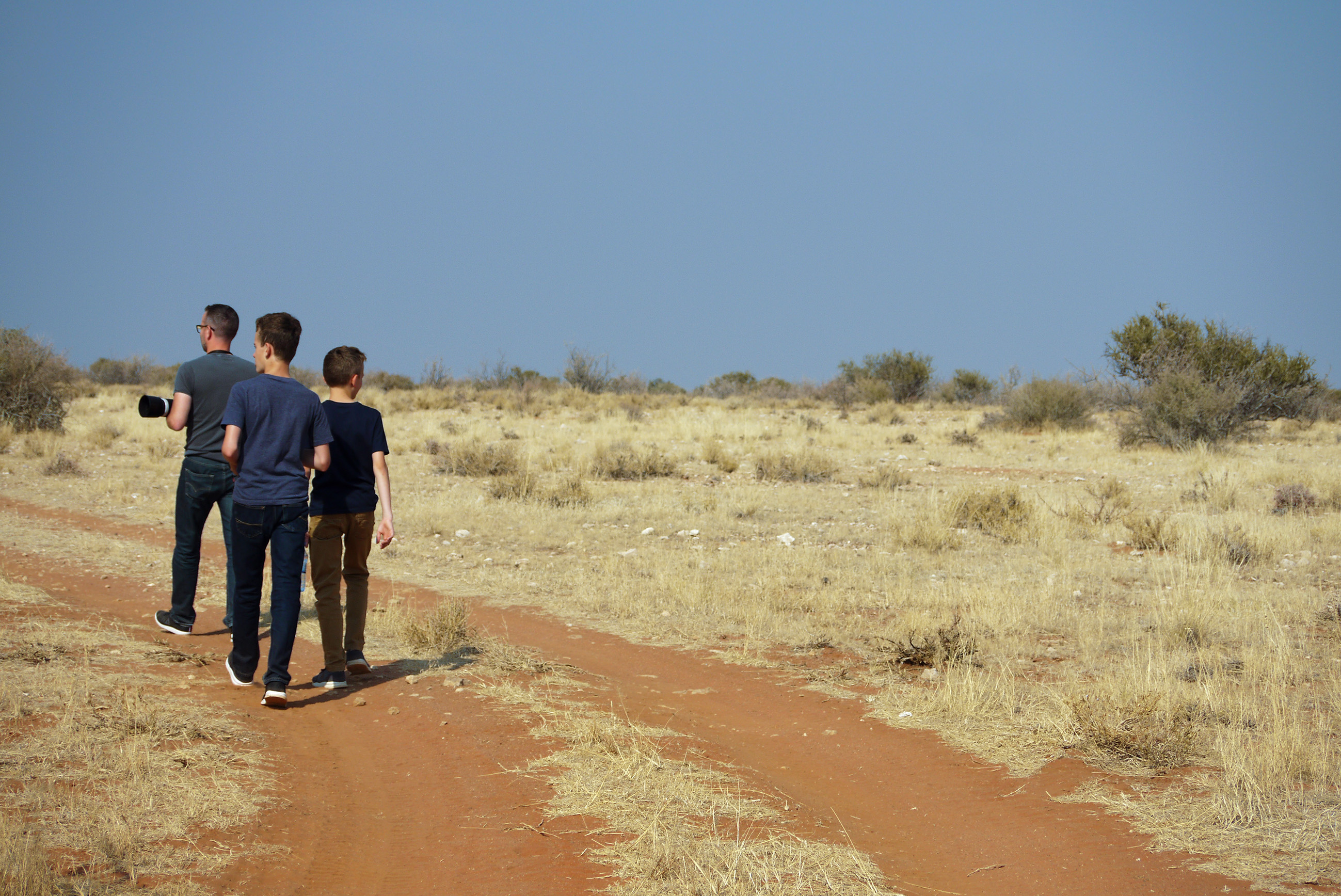 Dans la matinée, nous partons explorer la réserve privée du Lodge à pied. Il y a 3 sentiers de 2,2 km à 11,5 km. Comme nous sommes super courageux en ce début de séjour, nous choisissons celui de 2 km ! Ben quoi, il fait chaud et il faut se préserver pour les prochains jours. Nous voyons des antilopes (j’ai pas encore bien capté les différences donc je ne sais pas trop quelles races c’est), des autruches et trois girafes. Pour un début on est plutôt satisfait. C’est vraiment chouette de pouvoir accéder à la réserve en autonomie et de croiser des girafes alors qu’on est à pied à quelques mètres d’elles.