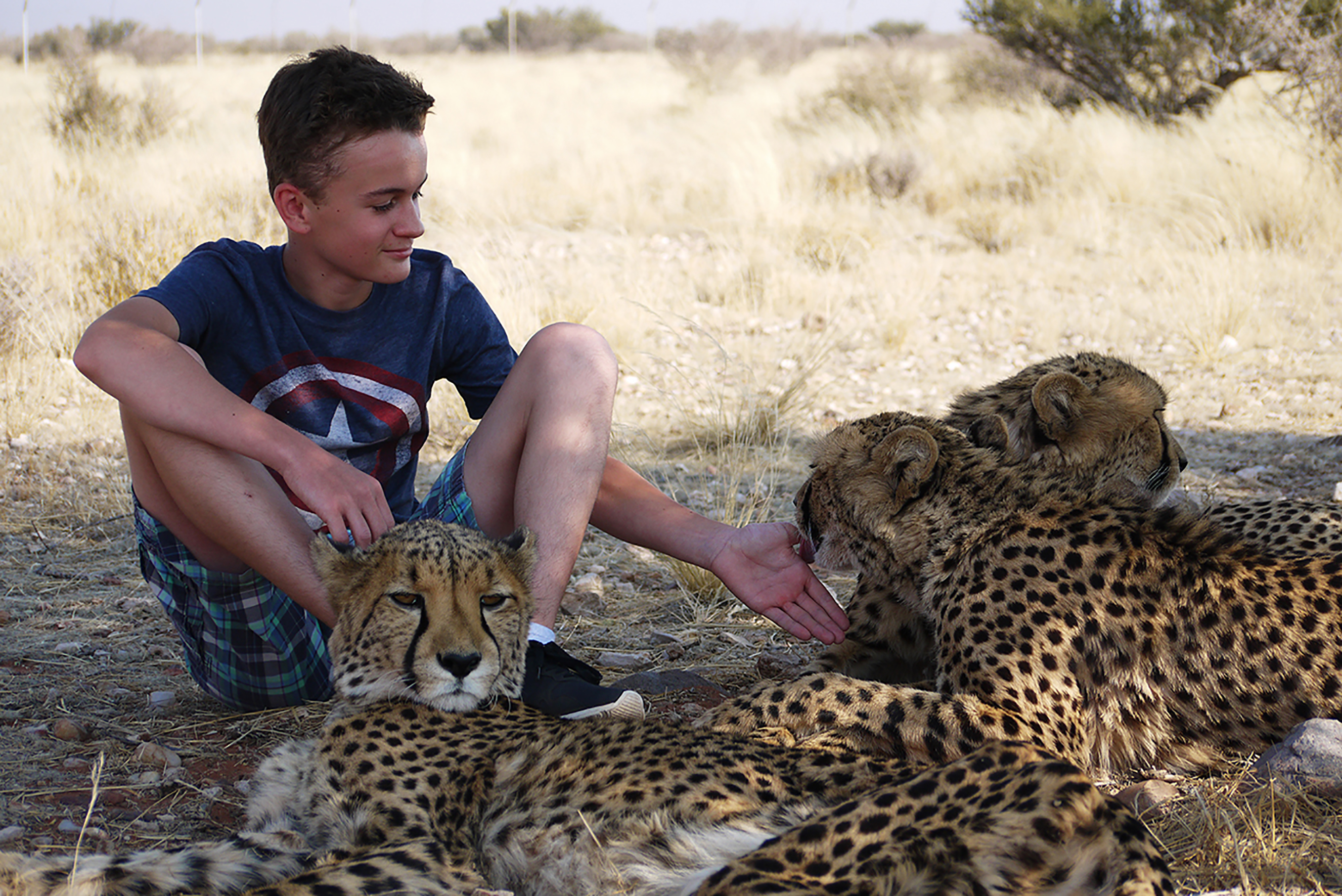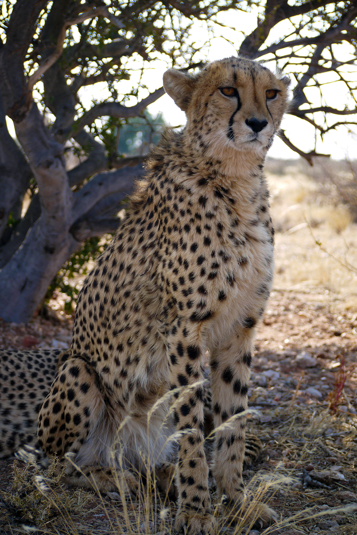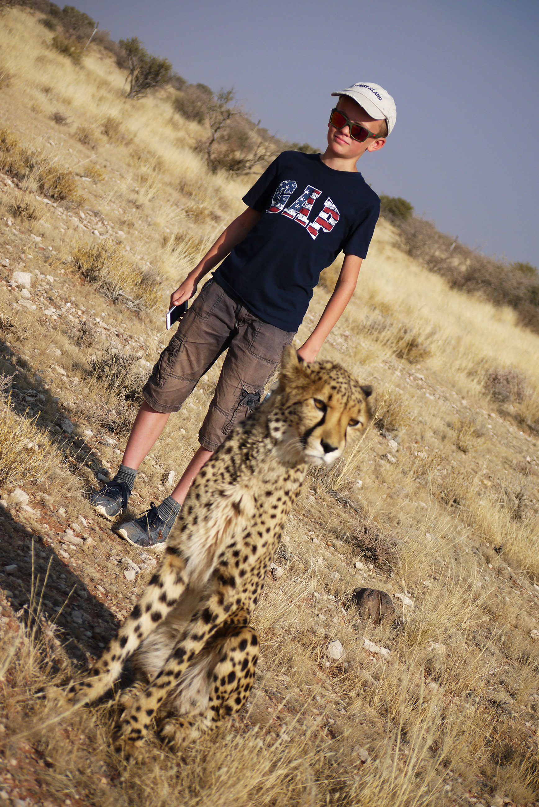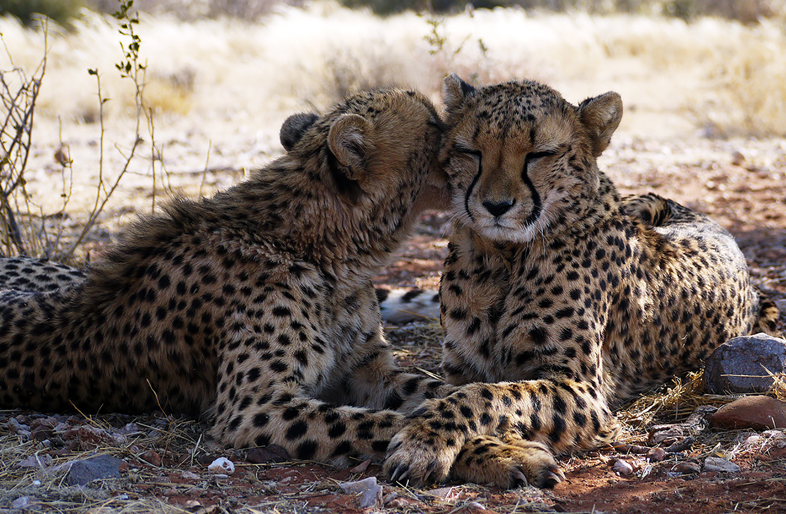 En début d’après-midi, un guide du Lodge nous emmène dans un grand enclos où vivent trois guépards. Il y en a deux autres dans un second enclos qui sont plus sauvages et agressifs. Comme partout où on peut en voir en captivité en Namibie, ils sont là parce qu’ils ont été recueillis blessés ou orphelins. Ces trois-là sont de gros chats qui ronronnent quand on s’approche ! Vrai de vrai, ils ronronnent et nous lèchent les mains ! On passe environ 45 minutes, juste nous quatre avec eux, à leur gratouiller la tête et à les photographier sous tous les angles. Ils sont captivants.