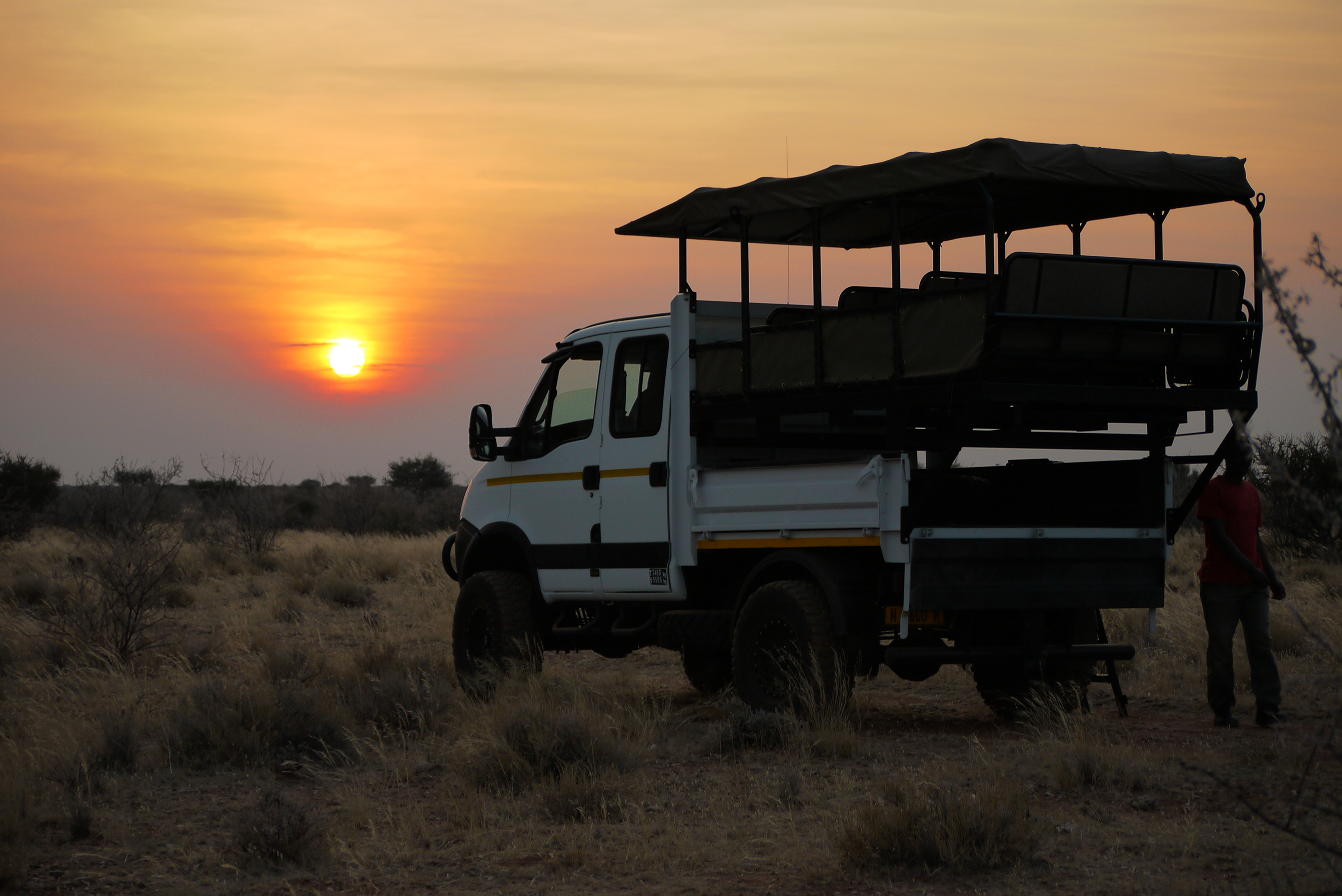 A 15h30, nous suivons un autre guide qui nous emmène, avec un énorme pick up surélevé, dans la réserve pour un safari (ici on dit un game drive). Et là on enchaine les rencontres : 3 girafes avec un girafon, des gnous noirs, des gnous bleus (en fait ils sont gris !), des springboks, des bubales, 2 rhinocéros blancs (en fait ils sont gris aussi !), des autruches et même des œufs, une sorte de chien sauvage tacheté que le guide n’a pas vu donc on ne sait pas ce que c’est !