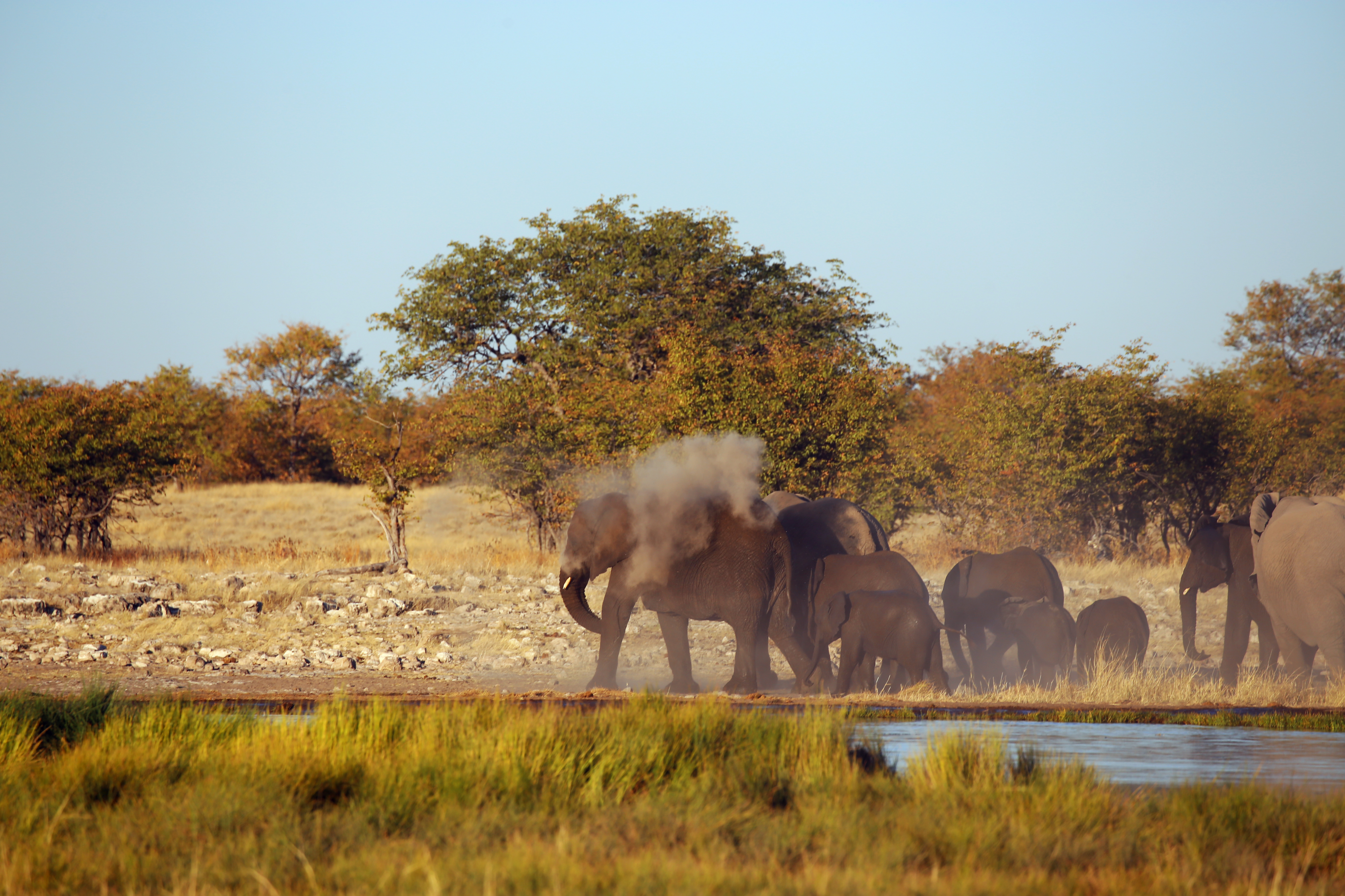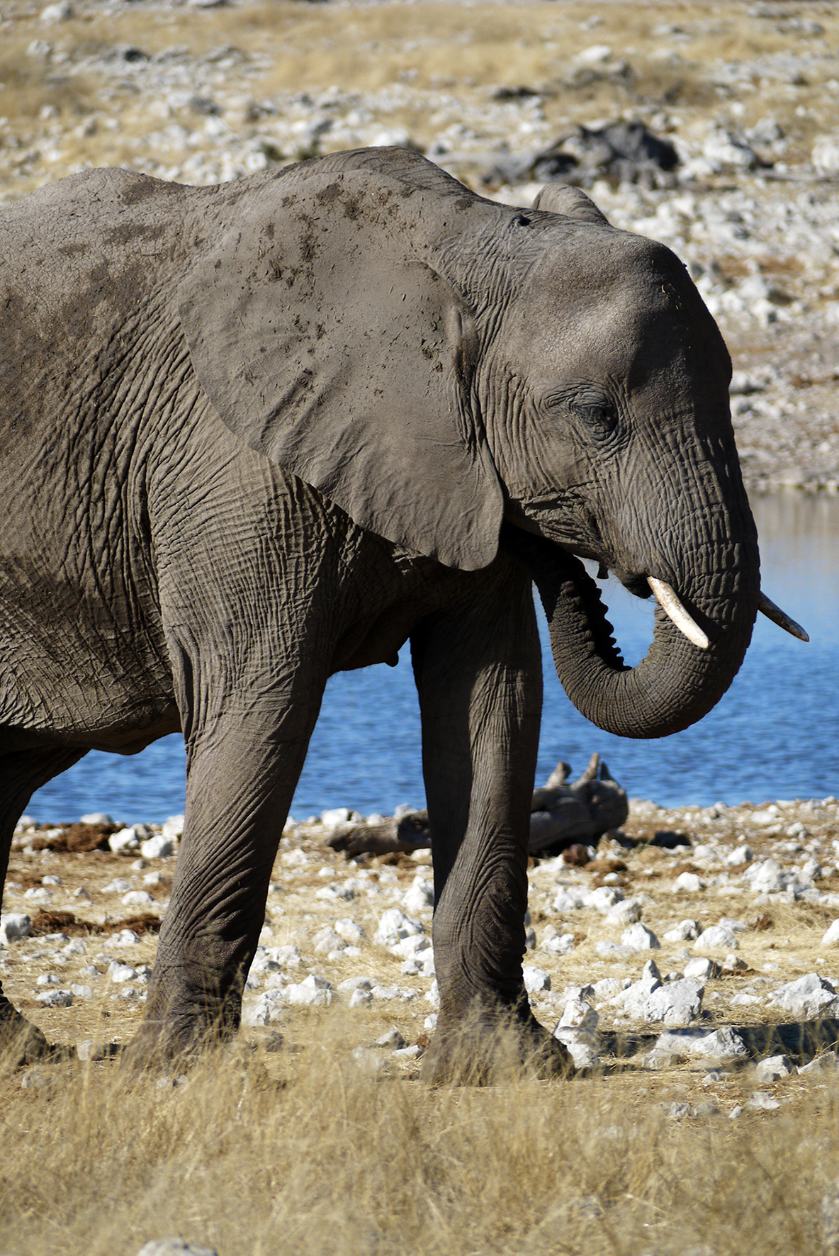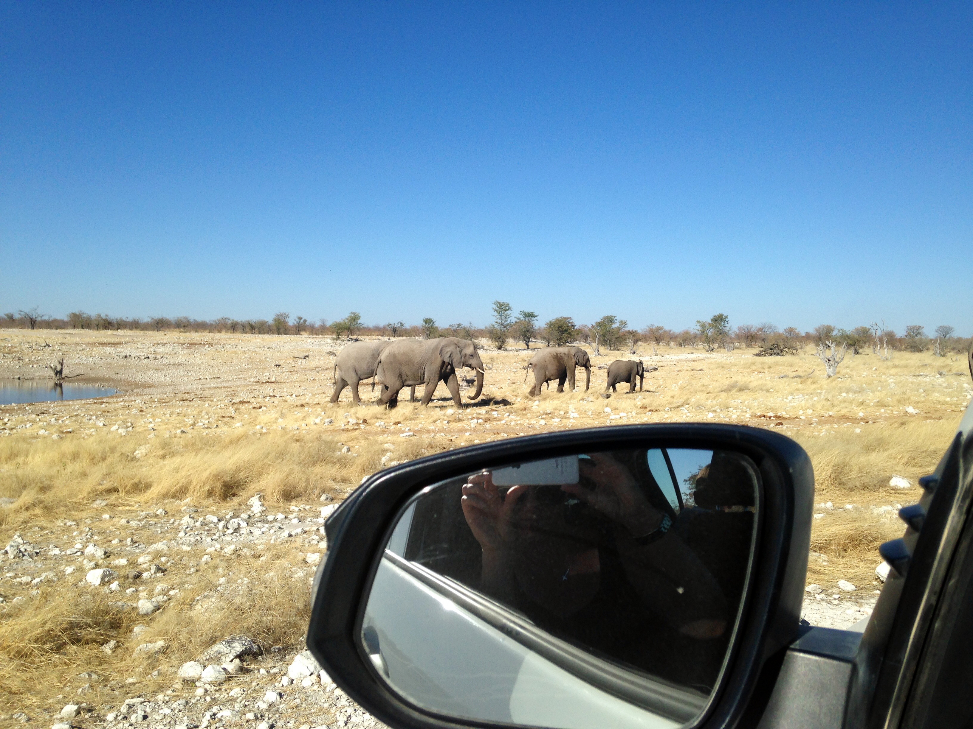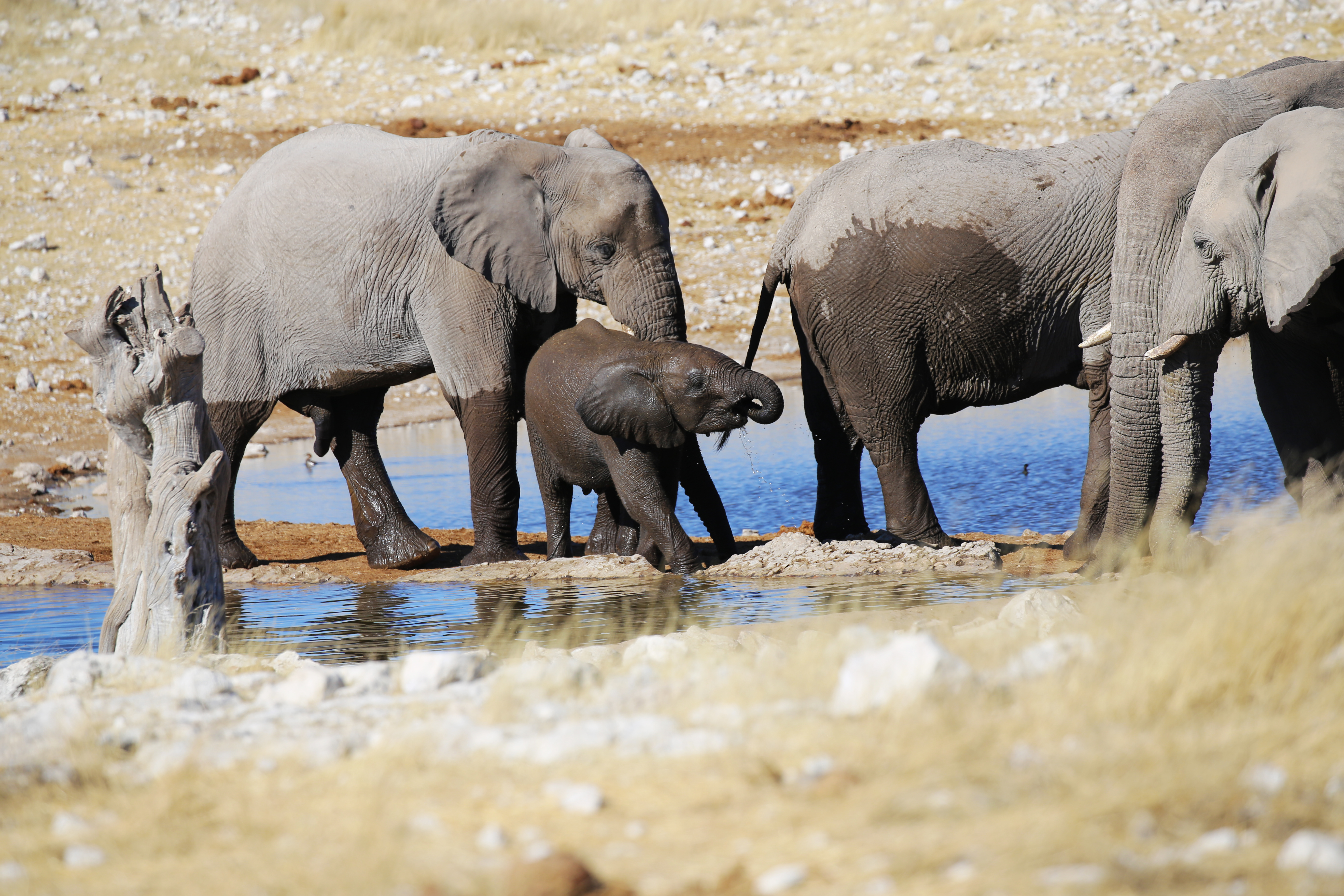 Nous pique-niquons au point d’eau d’Okaukuejo et là, ce sont trois gros éléphants qui se désaltèrent parmi des zèbres et des oryx qui se baignent. C’est top !