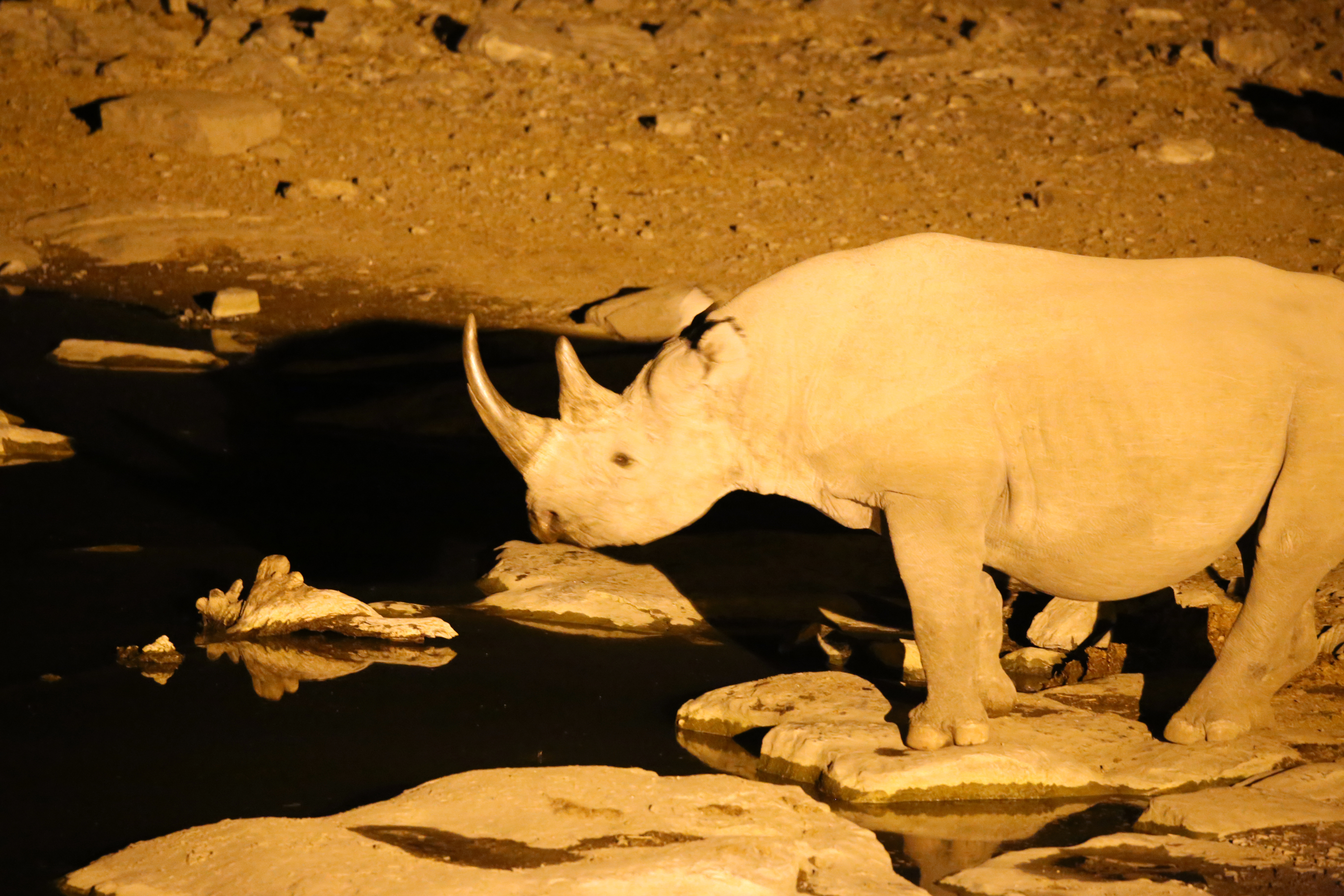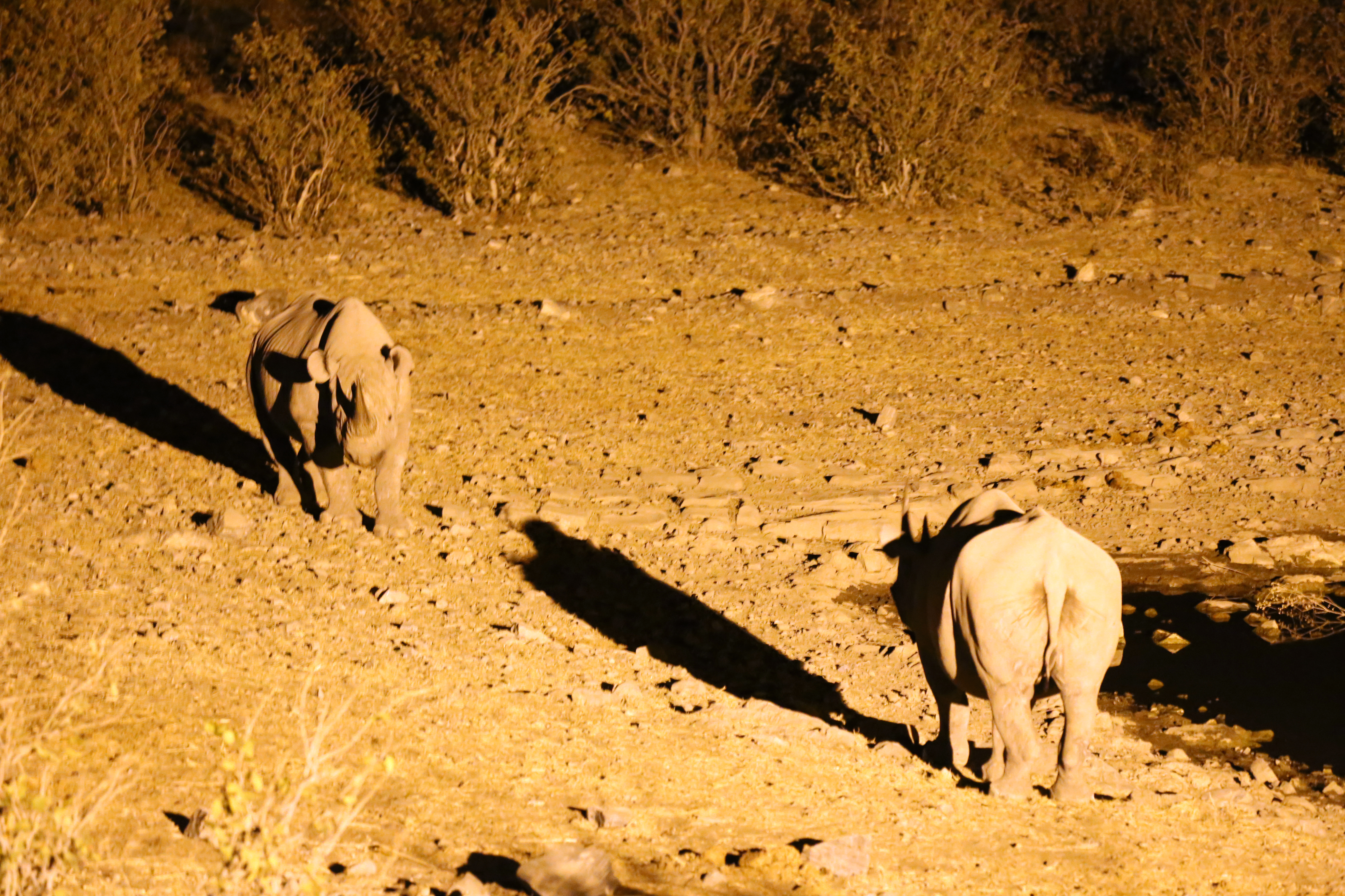 On s’installe pour deux nuits dans un chalet à Halali. Après le dîner, nous allons au point d’eau du lodge qui est éclairé toute la nuit. On y reste environ 1h30 et on voit, dans l’ordre d’apparition : 8 éléphants, 5 rhinos, 2 chacals, 2 hyènes tachetées, encore 2 autres rhinos (une maman et un jeune). C’est top top top !!!