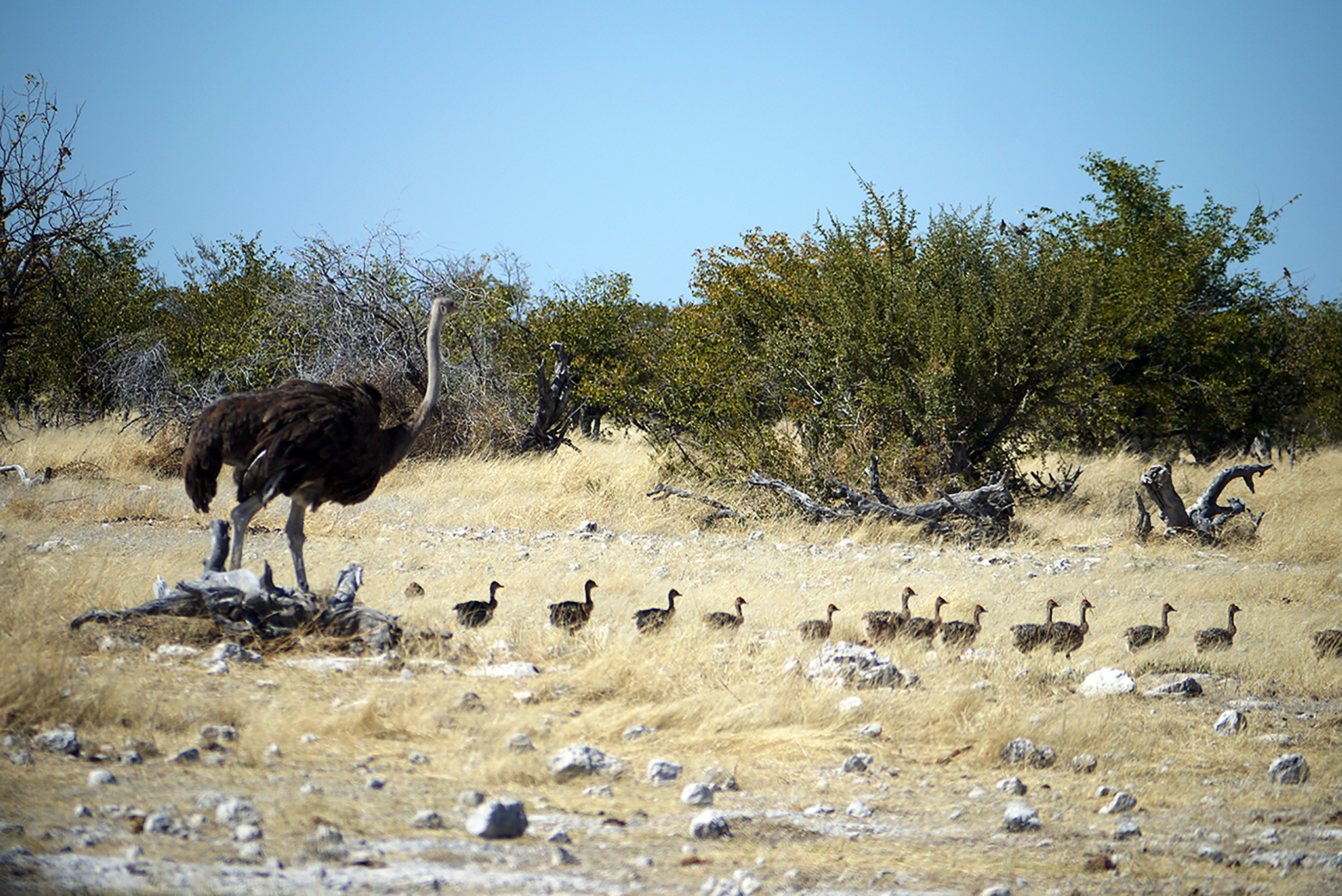 Après un arrêt techniques (courses et plein d’essence) à Outjo, nous entrons au sud d’Etosha vers 11h. Le point d’eau d’Ombika se situe juste après l’entrée, c’est par celui-ci que nous commençons. Un troupeau de zèbres se balade, mélangé à des antilopes et des girafes. Puis deux autruches se pointent avec, entre elles deux, une quinzaine d’autruchons. Ils sont trop chou en file indienne entre maman et papa !