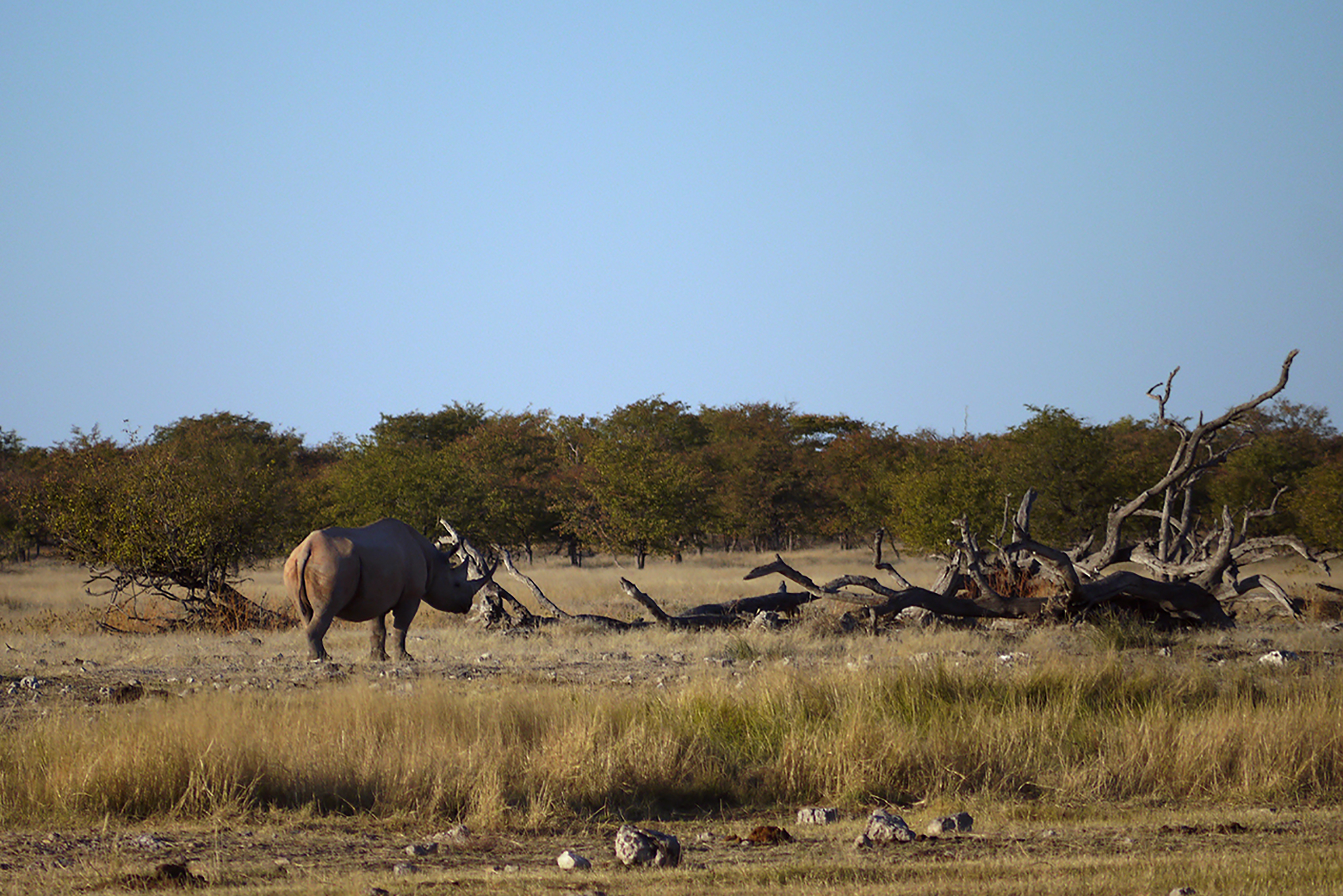 A Rietfontein, il y a encore des éléphants un peu excités qui s’aspergent de poussière et un beau rhinocéros noir, tout calme dans son coin.