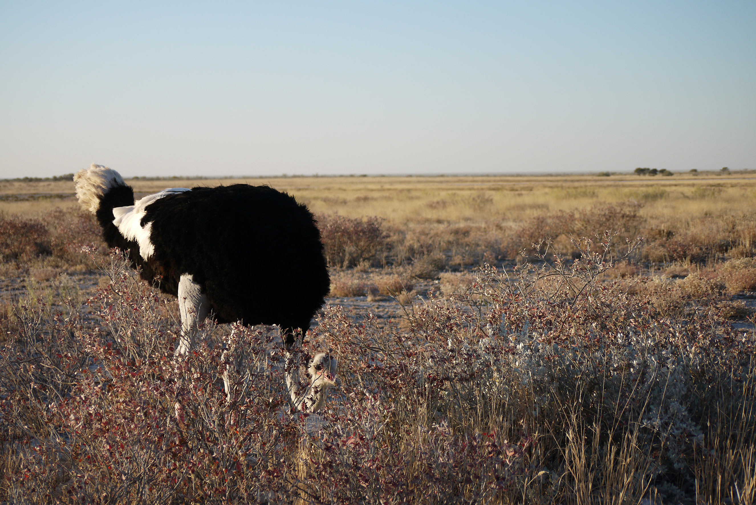 Juste sur le bord de la piste, monsieur autruche (plumage noir = monsieur ; plumage gris = madame) prend la pause.