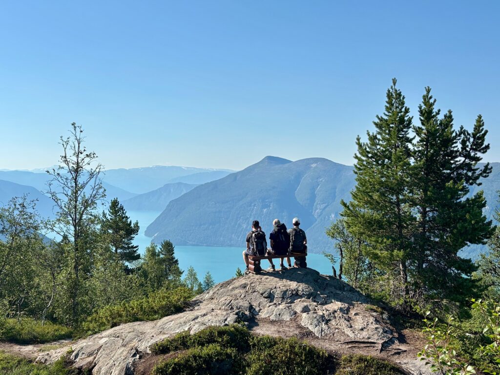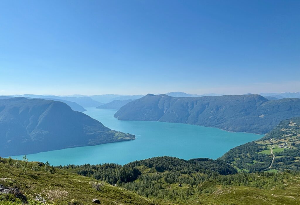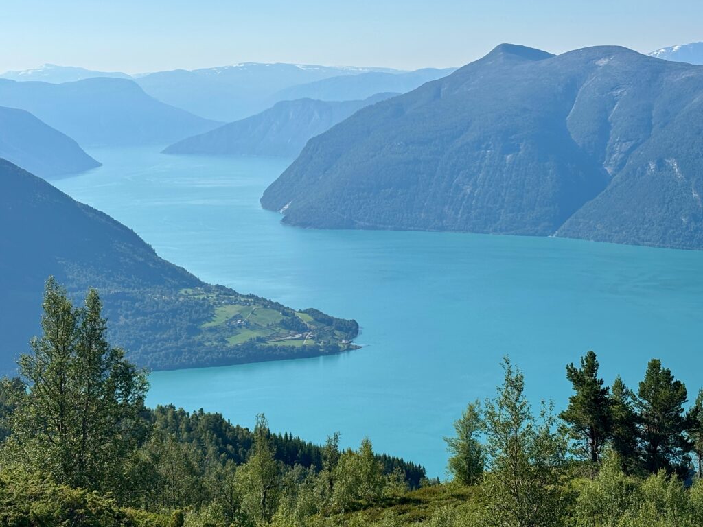 Nous nous garons au parking de Krossen (gratuit, ce qui est assez rare pour être mentionné). Le sentier démarre à l’ombre, dans une forêt assez dense. La conséquence c’est qu’il faut marcher à travers des entrelacs de racines. En sortant de la forêt, on s’arrête à un premier point de vue sur le Lustrafjorden.
