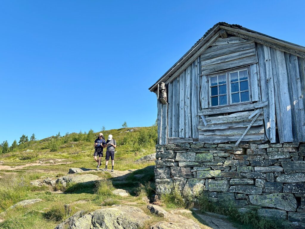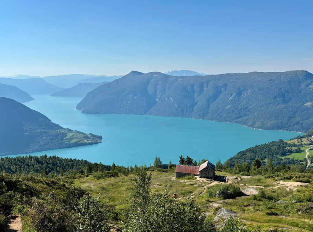 Un peu plus haut, nous arrivons à Svarthiller, un ancien refuge (rustique le refuge !). Là aussi, la vue porte jusqu’à Ornes à gauche et Solvorn à droite, dans le creux.