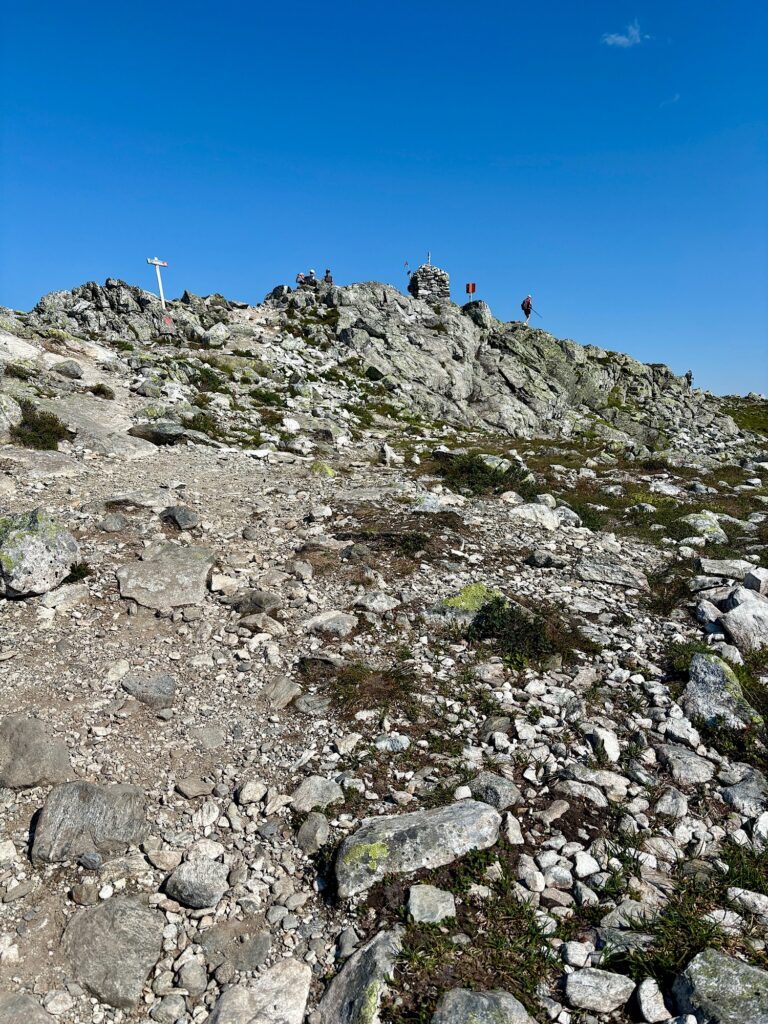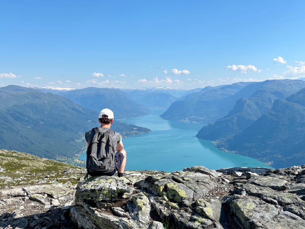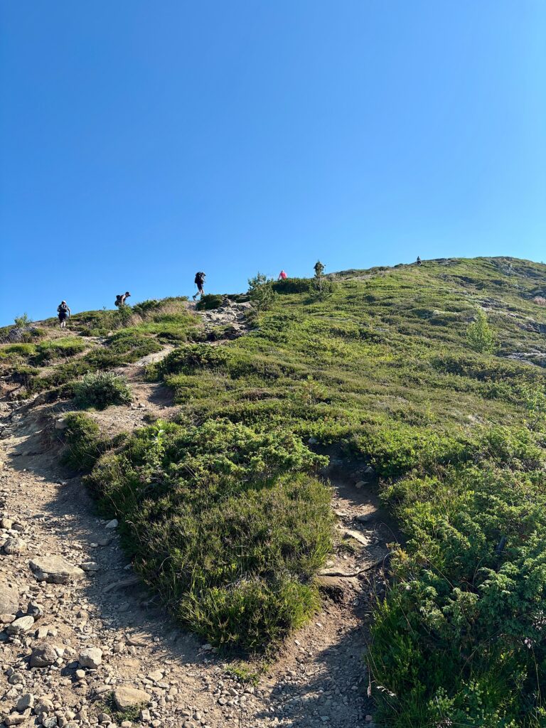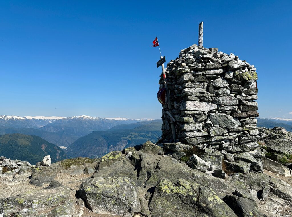 Le sentier s’élève ensuite subitement et il faut parfois s’aider de ses mains pour monter. Puis le sol se nivelle un peu et on arrive enfin au sommet, à 1116 mètres au-dessus du fjord. Du sommet, on aperçoit au loin le massif du Jotunheimen où se situe le point culminant de la Norvège (2469 mètres). On voit aussi le Nigardsbreen et le haut du Jostedalsbreen.