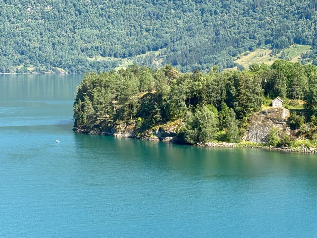 Le meilleur point de vue du Sognefjord d’après les guides touristiques. Nous ne démentirons pas, la vue est vraiment exceptionnelle, surtout par un temps aussi beau qu’aujourd’hui. Il fait un peu moins chaud ce matin mais, avec le soleil, la température monte vite malgré tout. Nous sommes bien contents de ne pas avoir entrepris cette randonnée hier après-midi sous 30°.