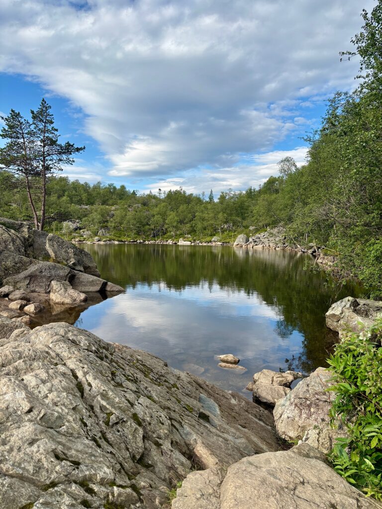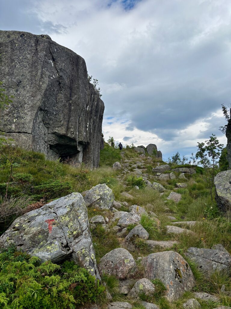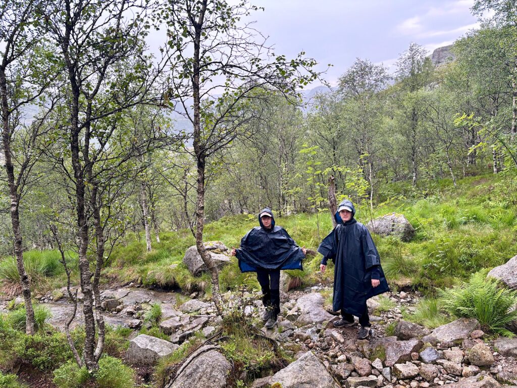 La pluie rend les rochers glissants alors la vigilance est de mise pour la descente. Descente qui est exténuante pour moi. J’en ai les jambes qui tremblent tellement je tétanise à force de descendre ces marches inégales dans la roche. Je commence à stresser pour la rando de 20 km prévue à Trollltunga dans 2 jours ! Je ne serai jamais remise d’ici là et je crains de ne pas y arriver ! Celle d’aujourd’hui est classée « modérément difficile » alors que Trolltunga est classée « difficile »…