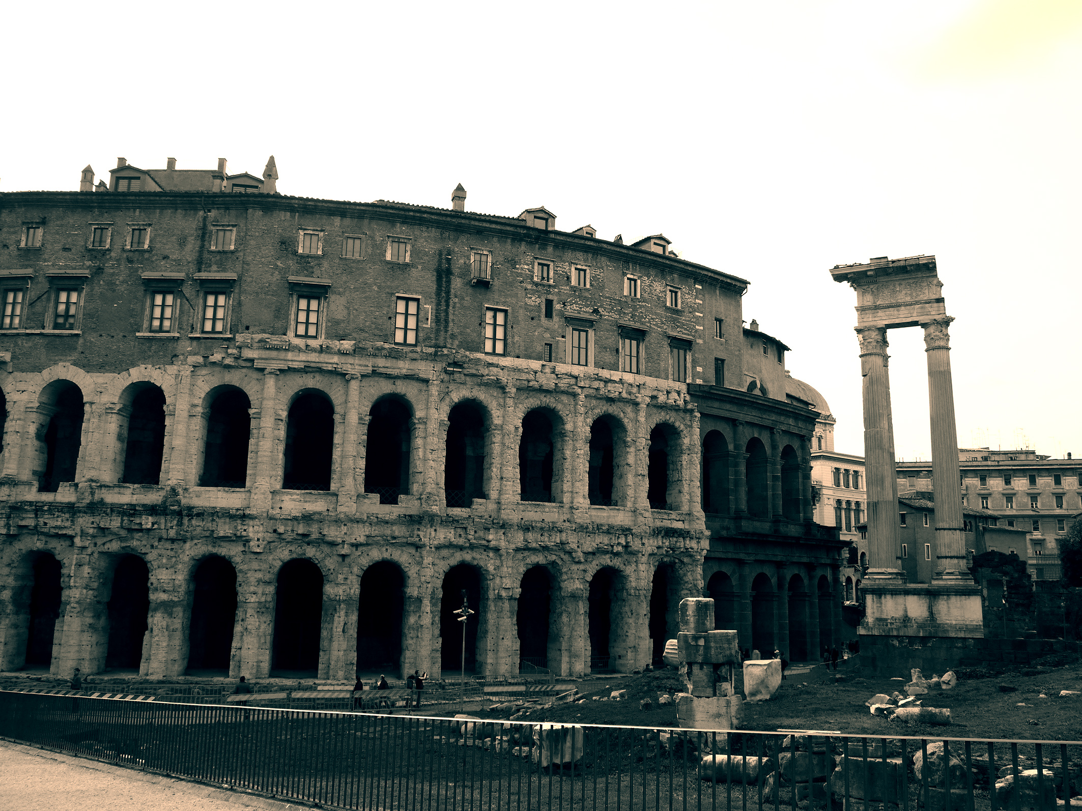 Après avoir encore longuement attendu le bus, on se dirige vers le quartier populaire du Trastevere, de l’autre côté du Tibre. En route, un petit détour par le Teatro Marcello :
