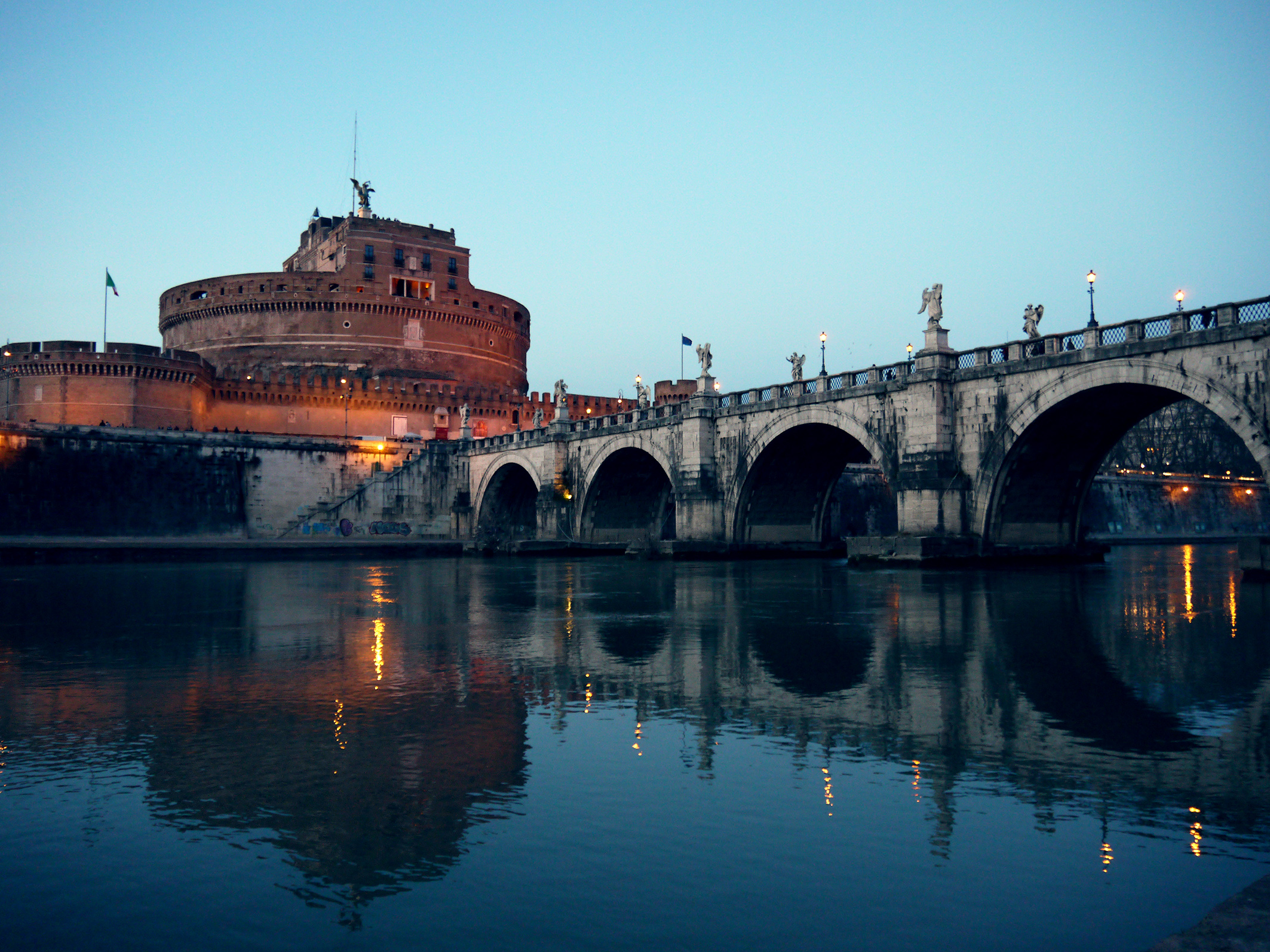 Pour rentrer vers le B&B, on longe les bords du Tibre en admirant le château Sant’ Angelo et les ponts qui s’éclairent pour la nuit.