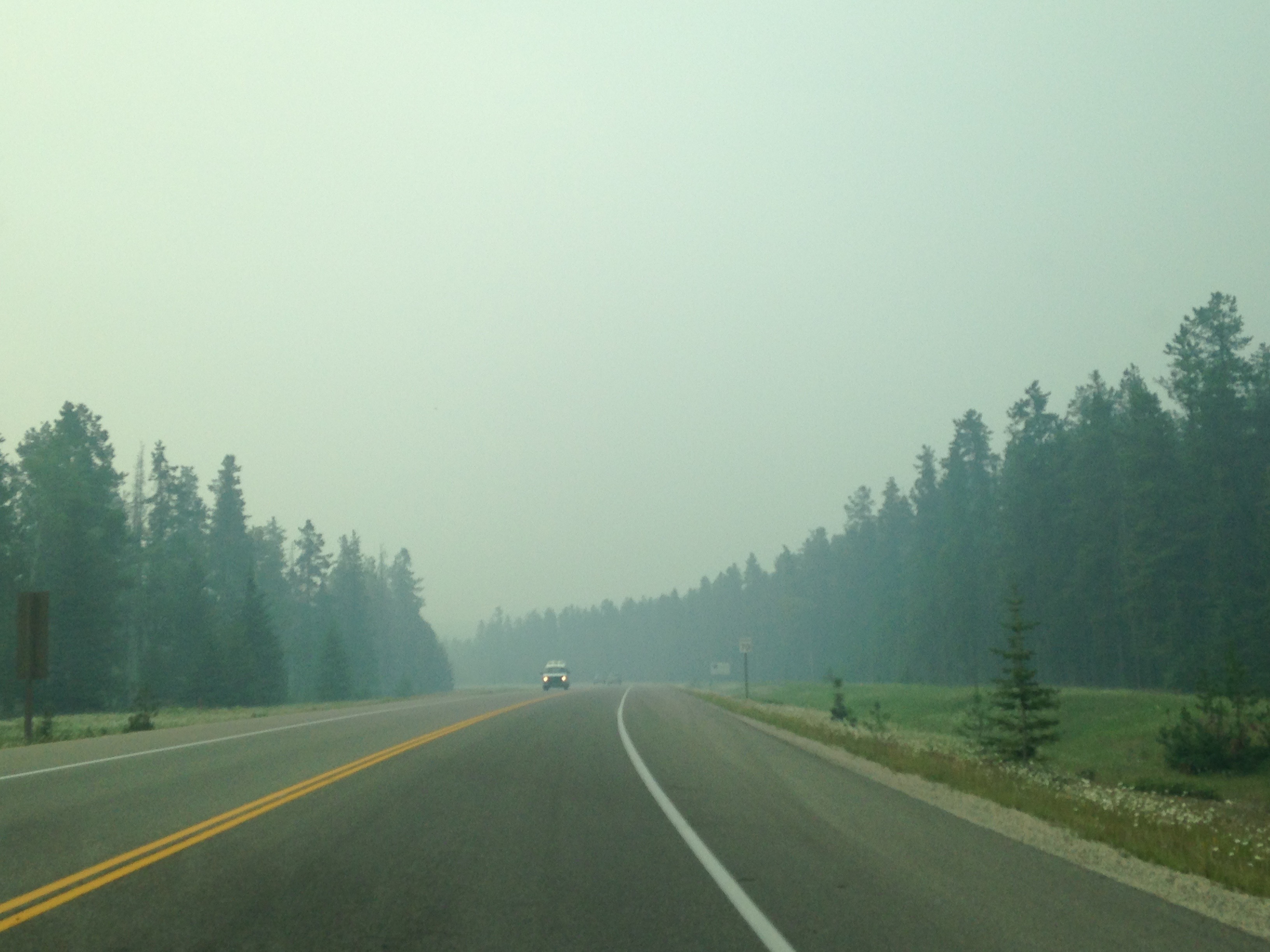 Bon, ben voilà, j’ai mal dormi en pensant à cet incendie aux portes de la ville et comme je m’en doutais, un mot sur la porte du bungalow nous apprend que la route qui mène au canyon et au lac Maligne est fermée à cause du feu ! Il va falloir changer nos plans pour la journée et faire une croix sur la sortie en canoë au lac Maligne. Heureusement qu’on en a fait au Emerald lake, sinon j’en aurais entendu parler…