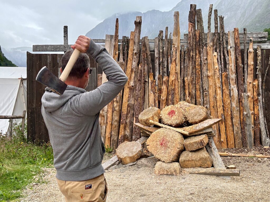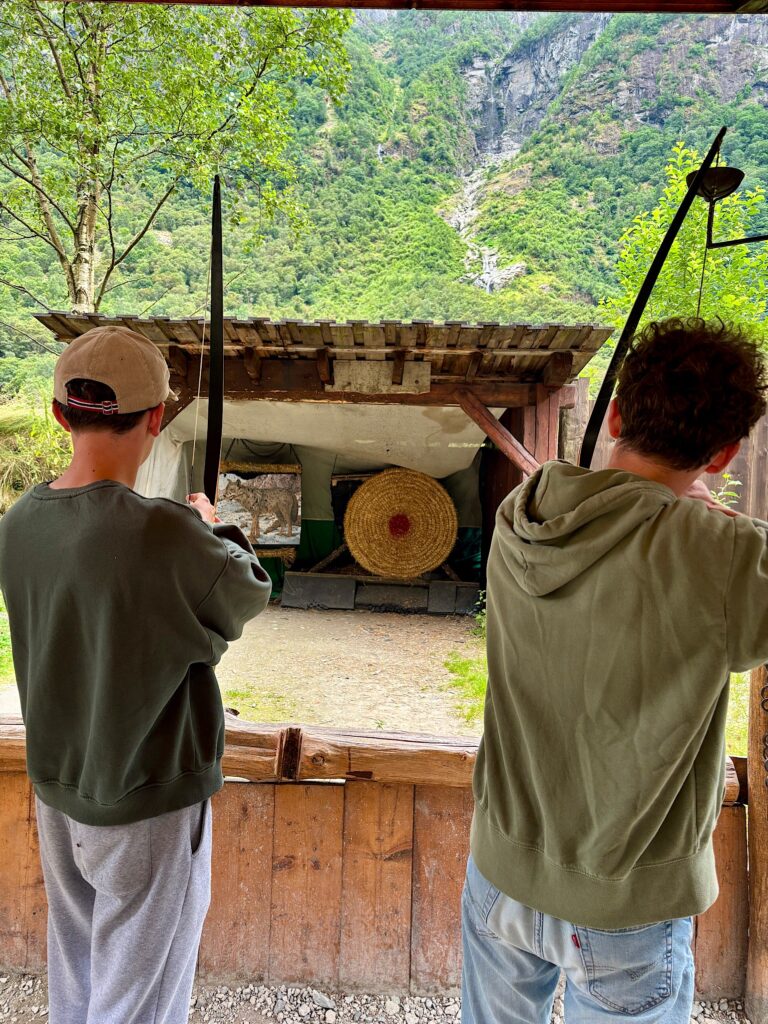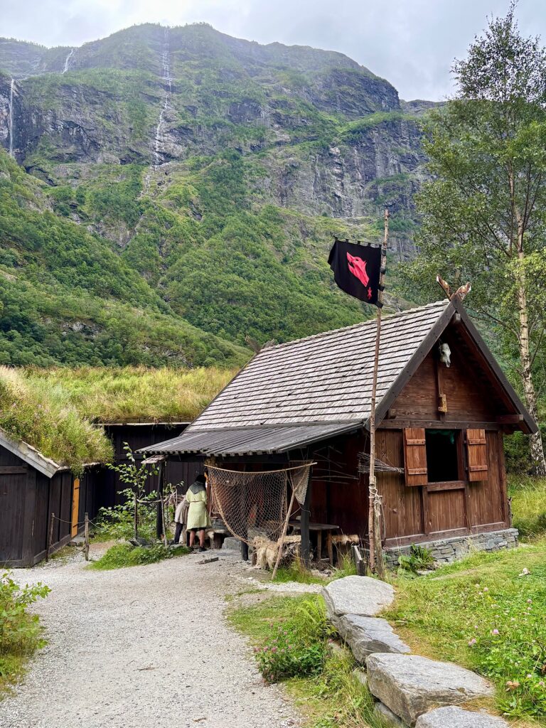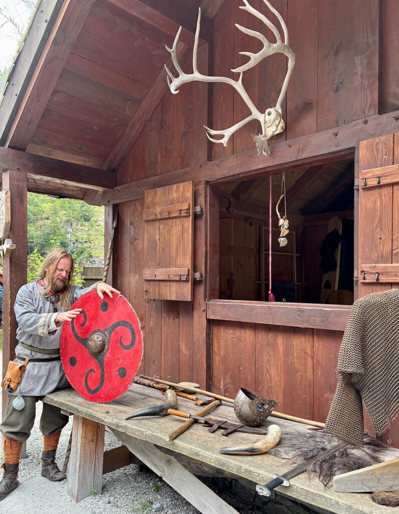 Ce matin, nous faisons la visite du village Viking de Gudvangen. La ville fictive de Njardarheimr a été construite par une communauté internationale de passionnés de vikings pour restituer leur mode de vie, leur culture et la façon dont ils ont influencé le monde. Je ne savais pas trop à quoi m’attendre, entre attrape touristes ou écomusée. Au premier abord on penche pour l’attrape touristes. Coincé entre la station essence, la supérette et le port, le lieu paraît tout sauf crédible. Mais dès qu’on passe la porte, finalement on se laisse happer et on se plonge dans l’ambiance 1000 ans en arrière. Les odeurs de feu, les cabanes, les bénévoles habillés en vikings, les démonstrations et animations, tout est réuni pour passer un excellent moment. On a tous adoré !