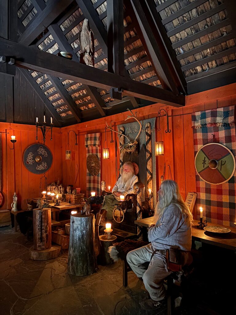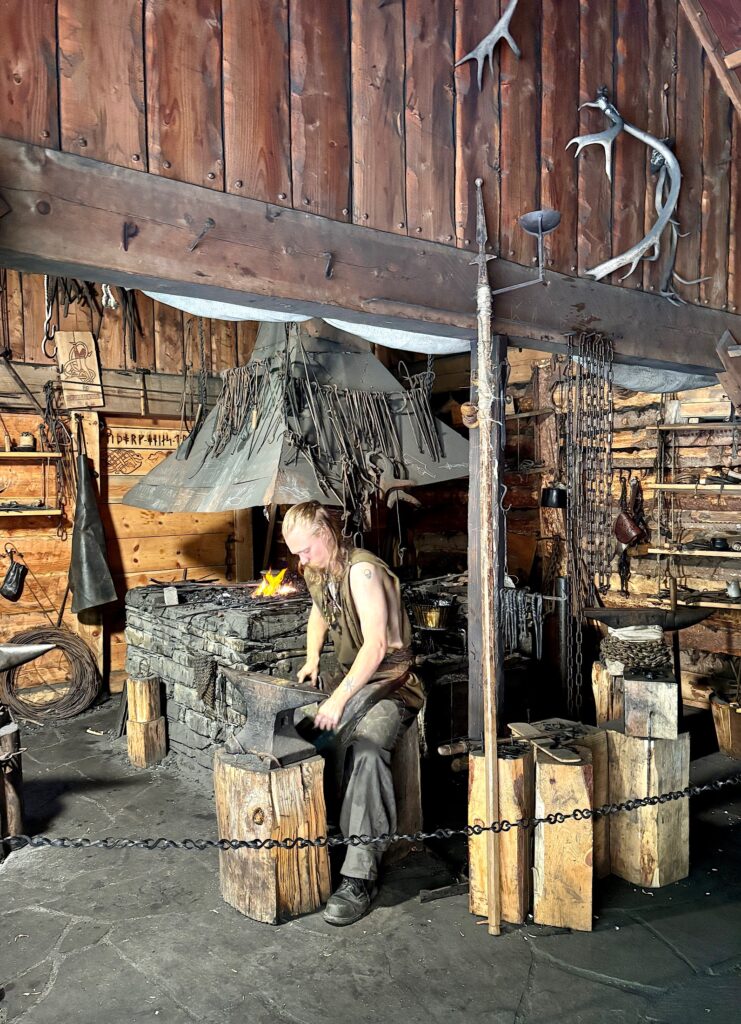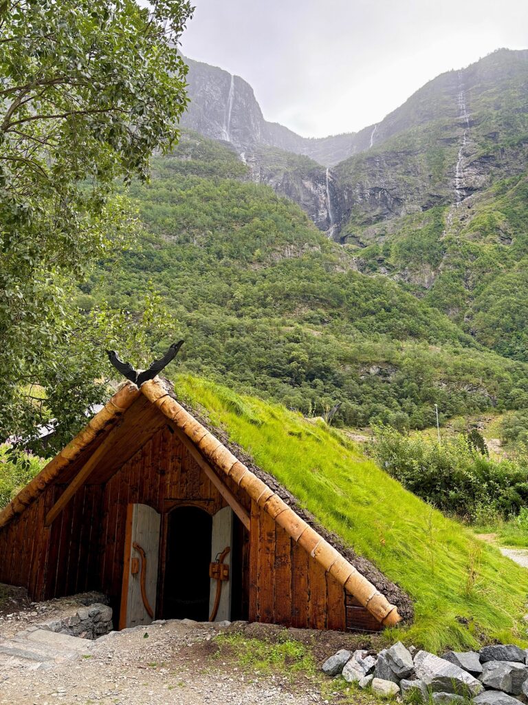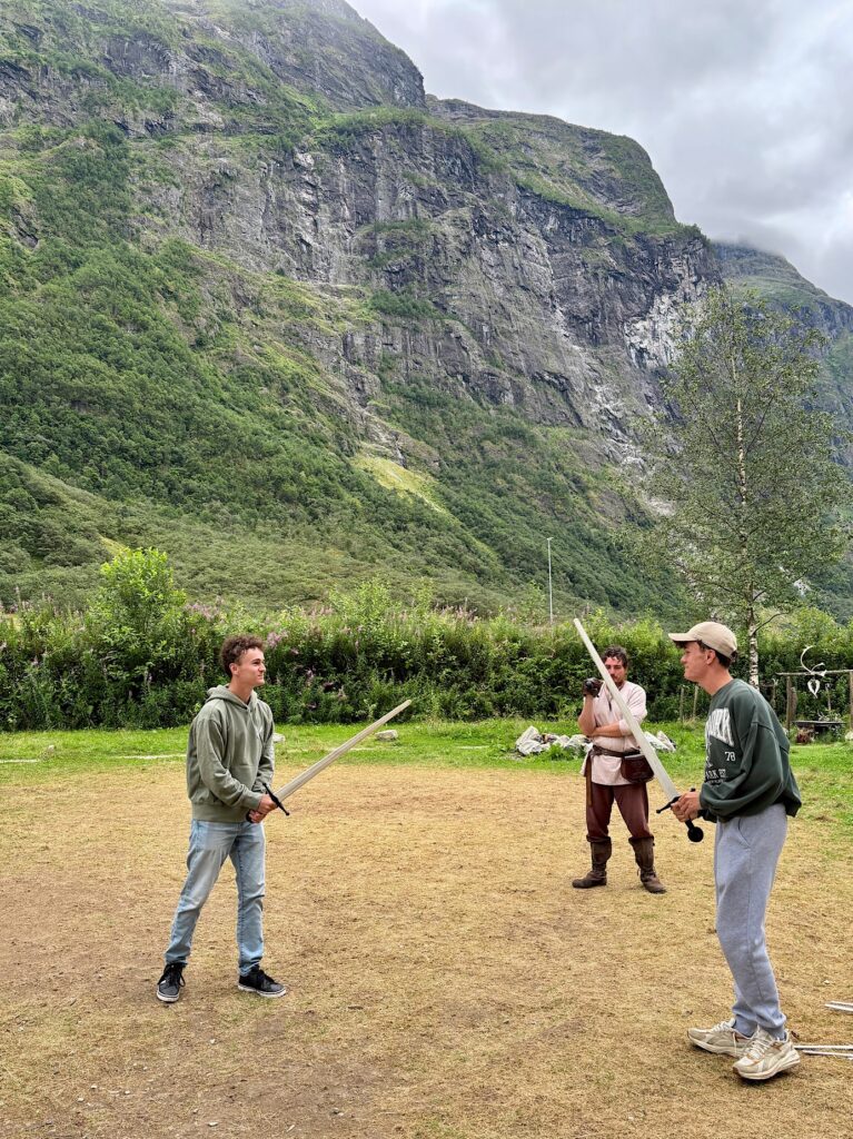 Ce matin, nous faisons la visite du village Viking de Gudvangen. La ville fictive de Njardarheimr a été construite par une communauté internationale de passionnés de vikings pour restituer leur mode de vie, leur culture et la façon dont ils ont influencé le monde. Je ne savais pas trop à quoi m’attendre, entre attrape touristes ou écomusée. Au premier abord on penche pour l’attrape touristes. Coincé entre la station essence, la supérette et le port, le lieu paraît tout sauf crédible. Mais dès qu’on passe la porte, finalement on se laisse happer et on se plonge dans l’ambiance 1000 ans en arrière. Les odeurs de feu, les cabanes, les bénévoles habillés en vikings, les démonstrations et animations, tout est réuni pour passer un excellent moment. On a tous adoré !