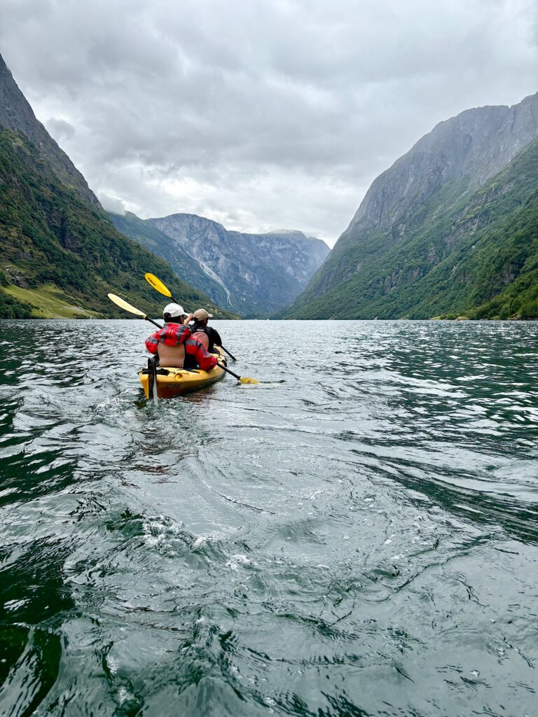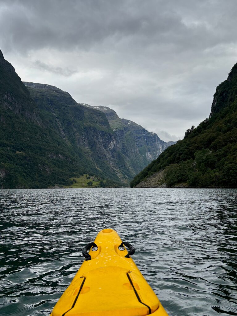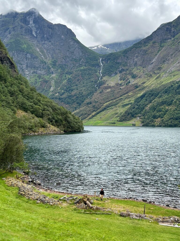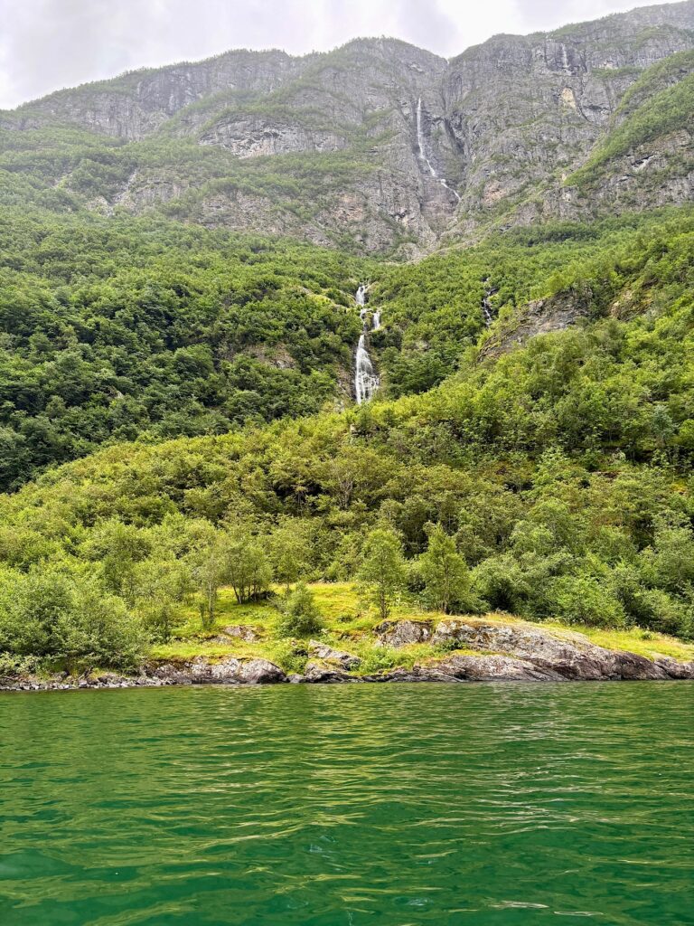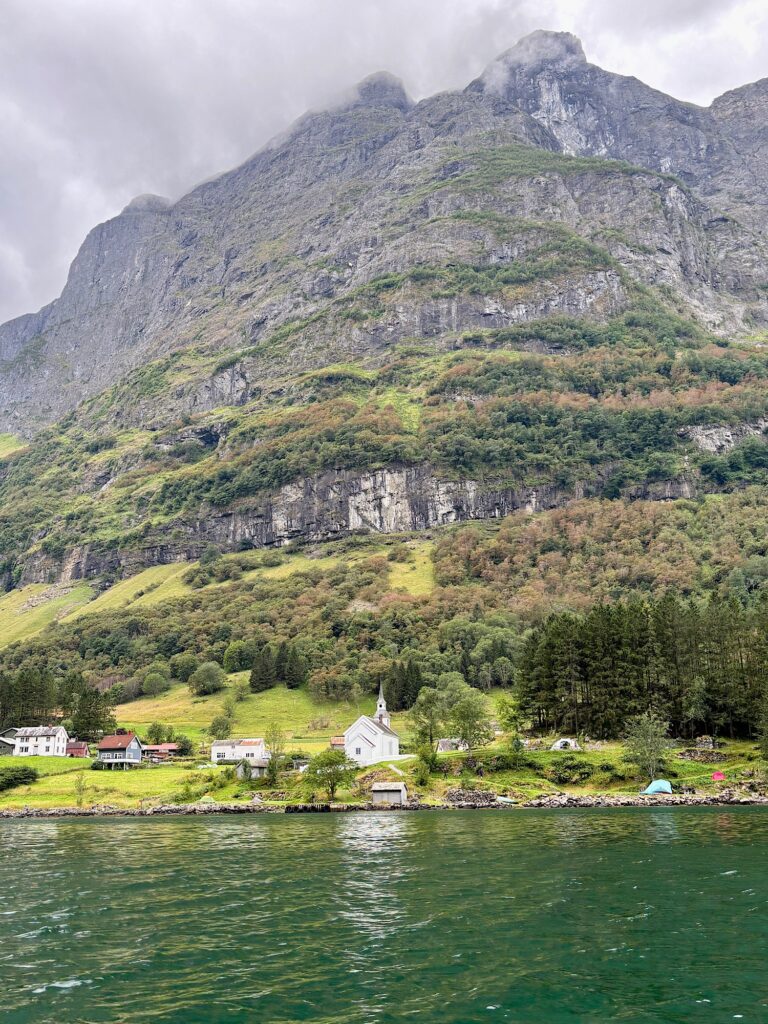 Gudvangen se situe tout au fond du Nærøyfjord. Classé au patrimoine mondial de l’humanité par l’UNESCO, comme le Geirangerfjord, le Nærøyfjord est l’un des bras les plus étroits du Sognefjord. Les parois vertigineuses et abruptes qui entourent ses eaux d’un vert foncé lui donnent l’air encore plus étriqué et impressionnant. On se sent tout petit quand on navigue au pied des montagnes qui l’encadrent.
