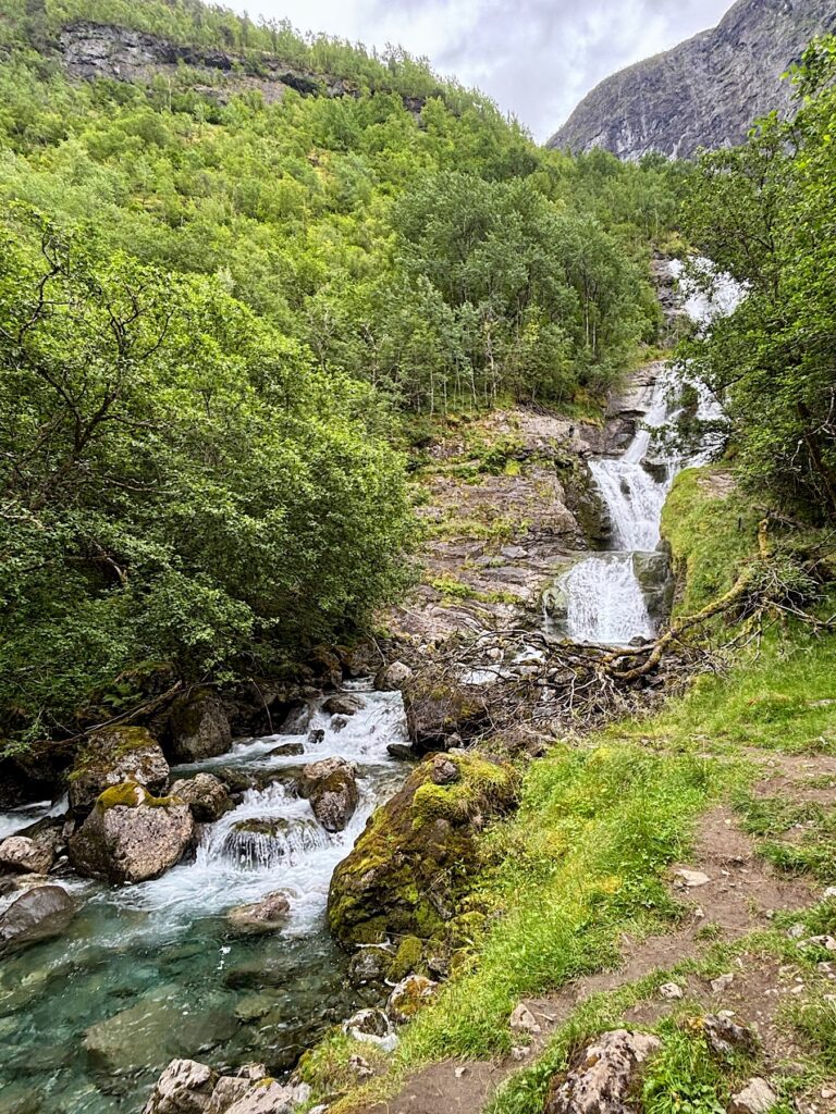 Lors du briefing, le gars nous a dit qu’on pouvait aller jusqu’à la cascade d’Odnes. On y va tranquillement, en faisant quelques pauses pour observer l’église du mini village de Bakka, des moutons et d’autres cascades qui se jettent dans le fjord.