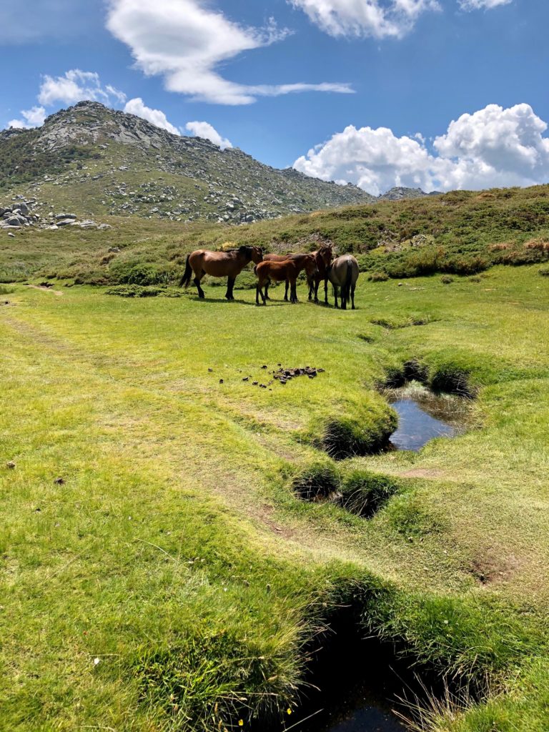 Gros coup de cœur pour cet endroit. Il y a plusieurs boucles possibles, nous avons fait le circuit de l’eau (6 km). Les paysages sont splendides : ruisseau, prairies fleuries, pozzines, vues sur les montagnes de l’Alta Rocca… Cochons, brebis et chevaux se partagent l’herbe bien verte. Nous avons pique-niqué en regardant les chevaux et les poulains. Le plateau étant à plus de 1700 mètres d’altitude et assez exposé au vent, il y fait plus frais qu’en plaine.
