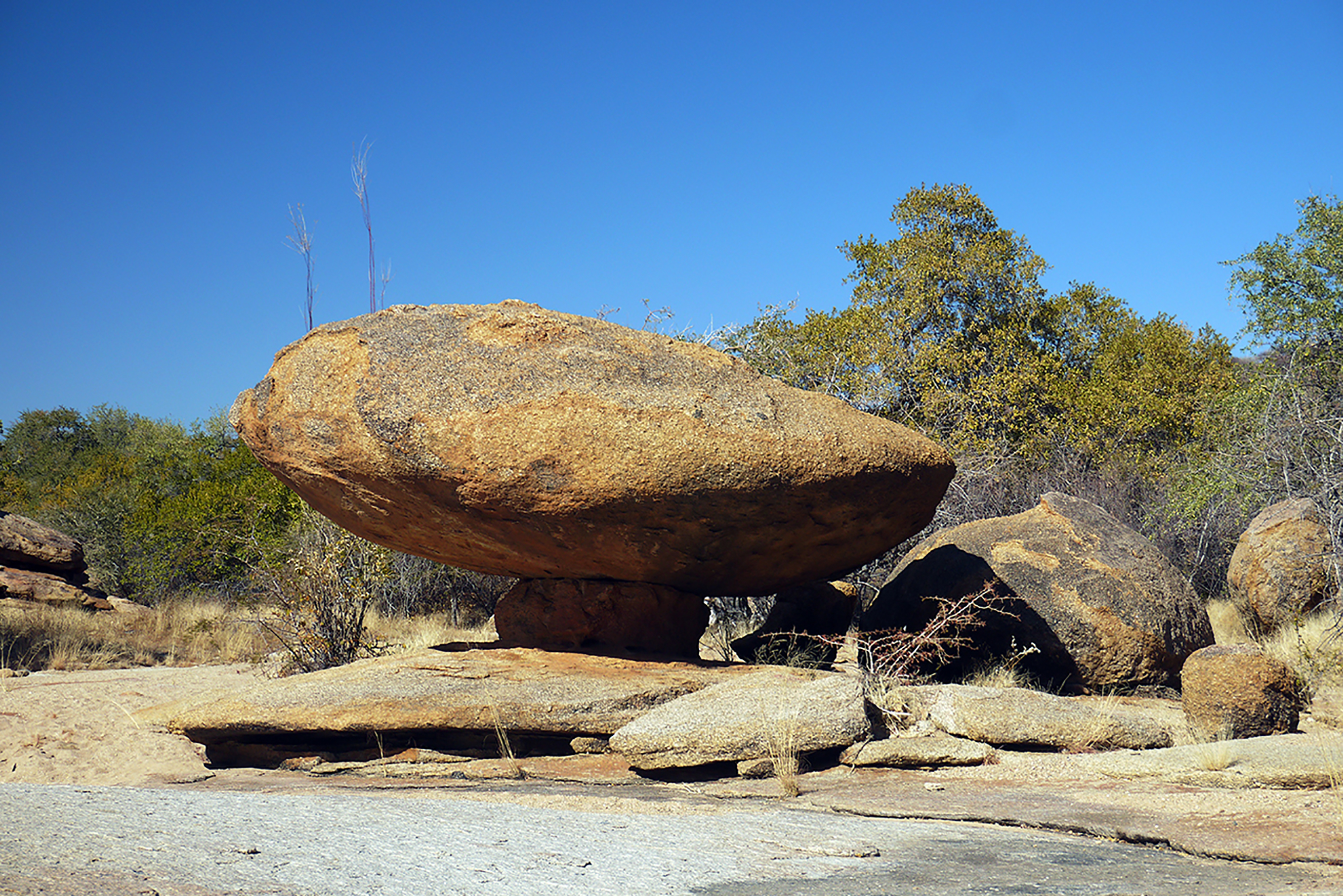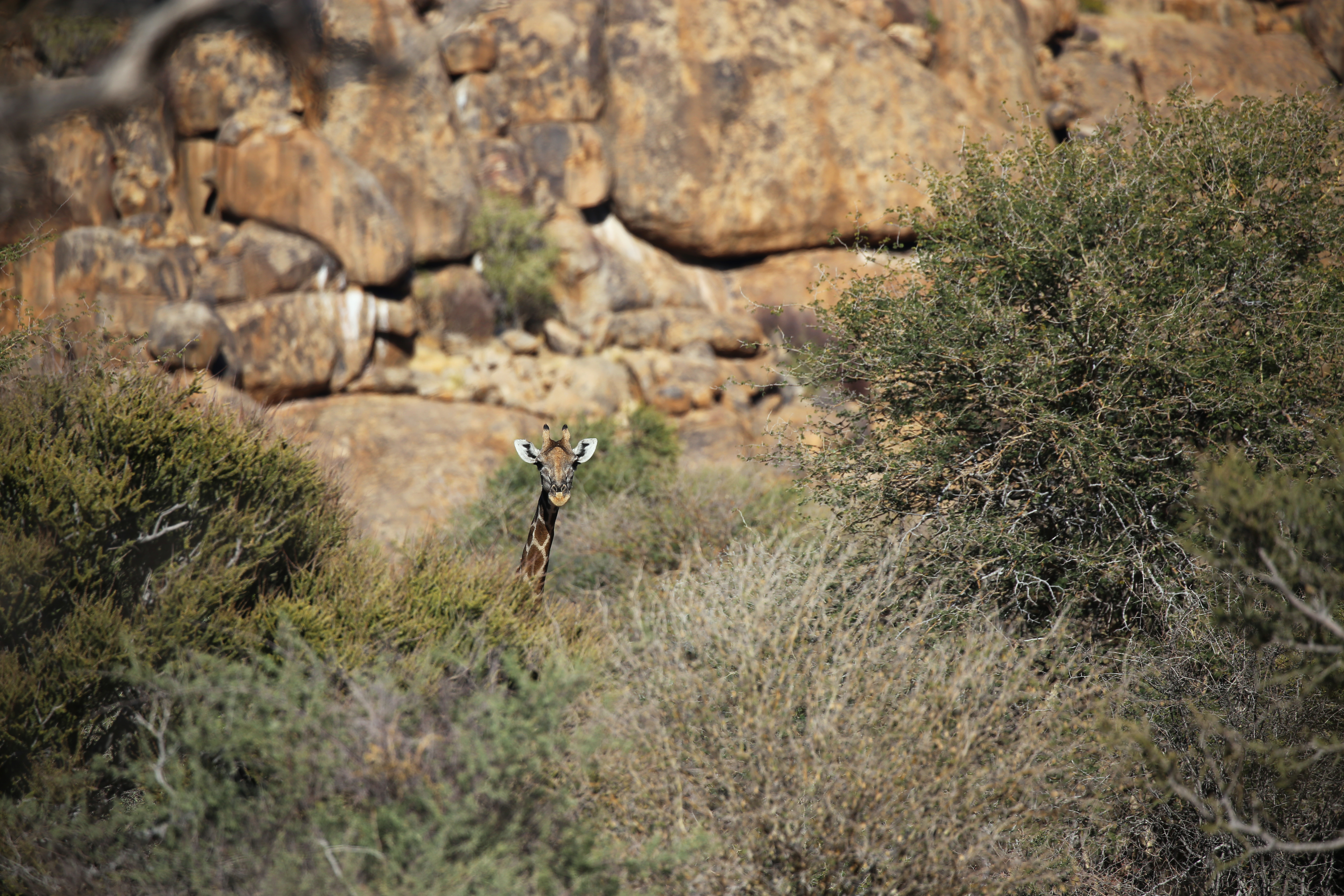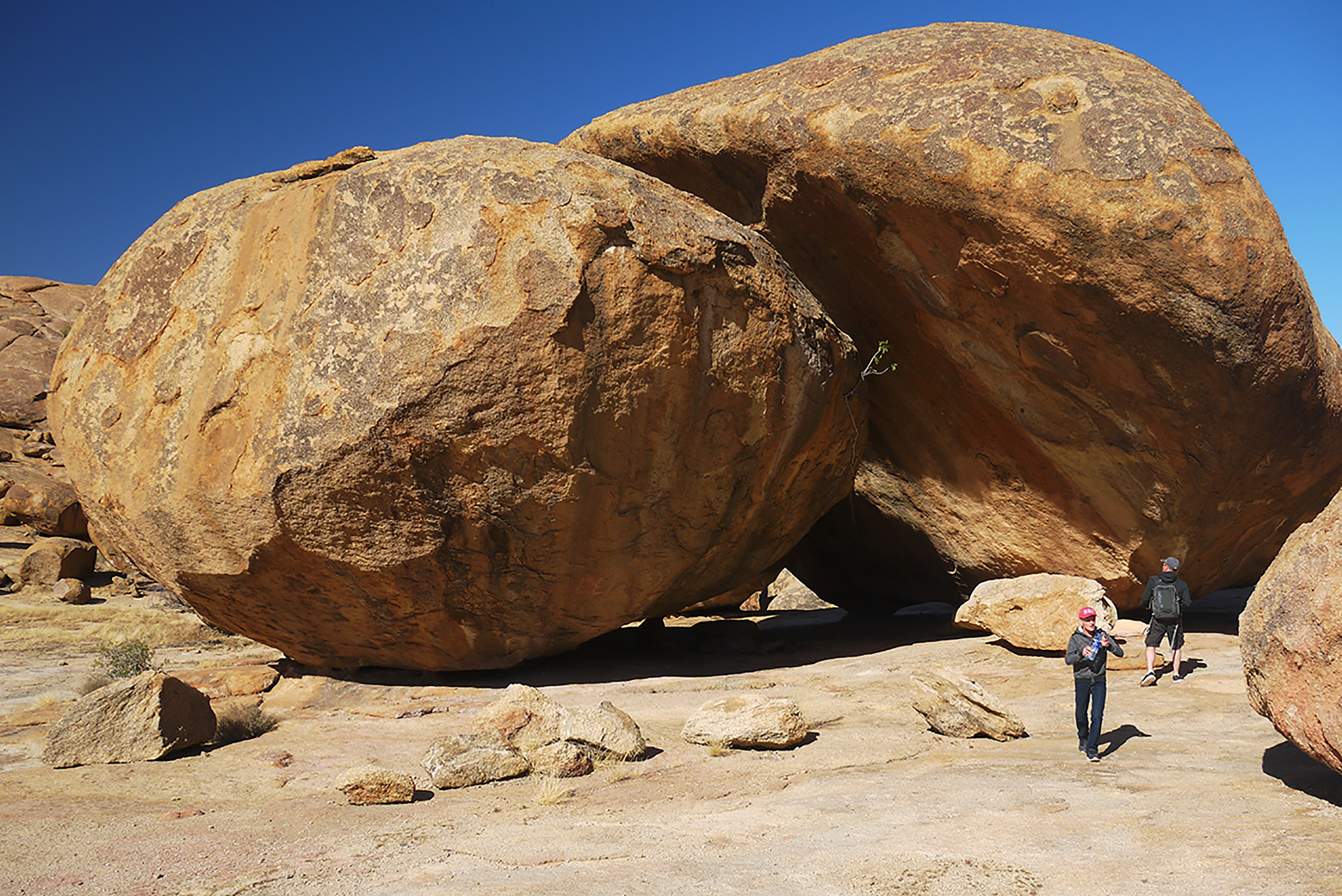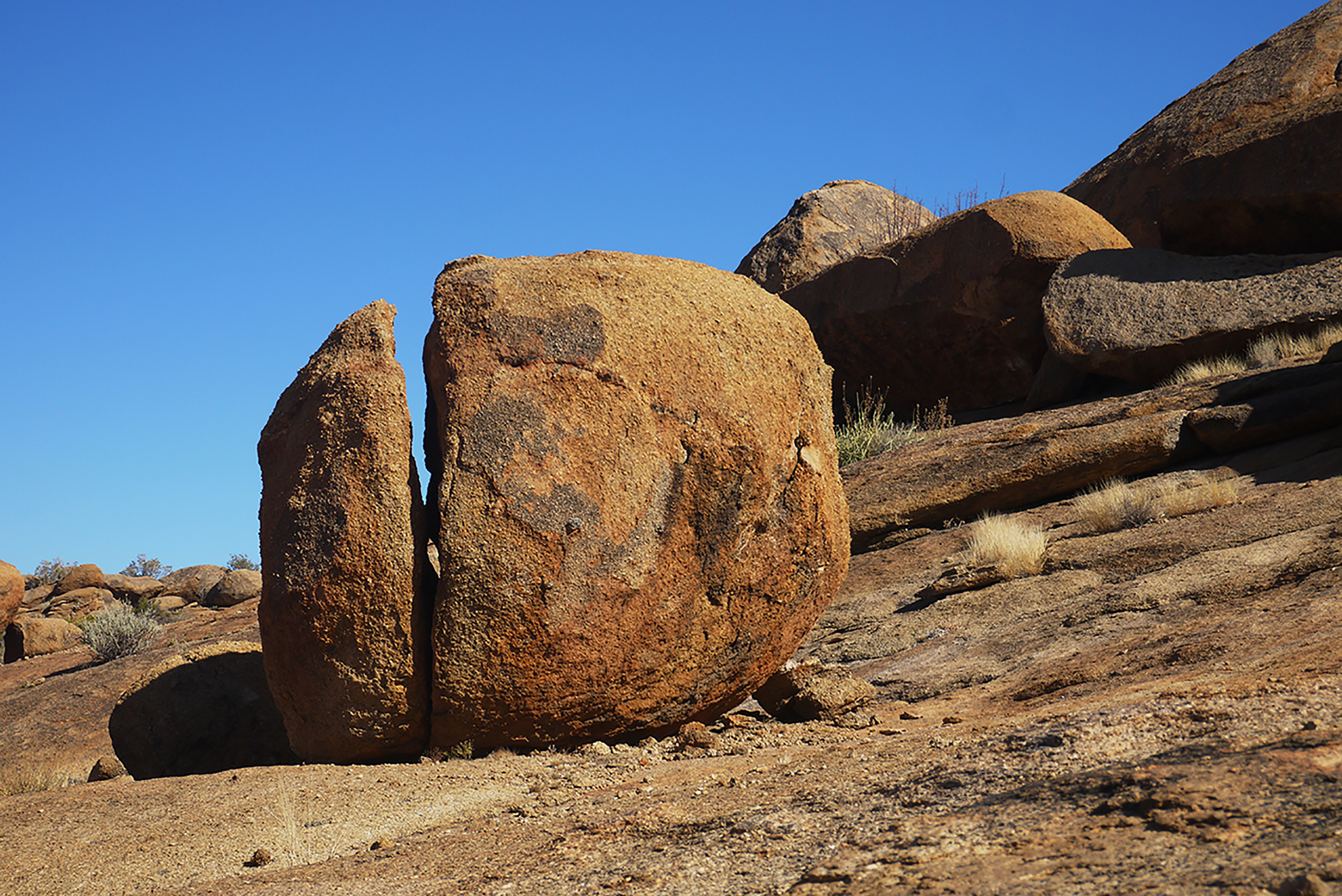 Après un bon café accompagné d’œufs brouillés et bacon, nous allons nous balader à Bulls Party, toujours sur la propriété d’Ameib Ranch. Il s’agit d’un amoncellement de boules de granite. Un peu grosses pour une partie de pétanque tout de même ! La balade est très agréable et, en chemin, on croise de nouveau des girafes et un girafon caché dans la végétation. Ça fait tout drôle de rencontrer ces grand animaux quand on est à pied !