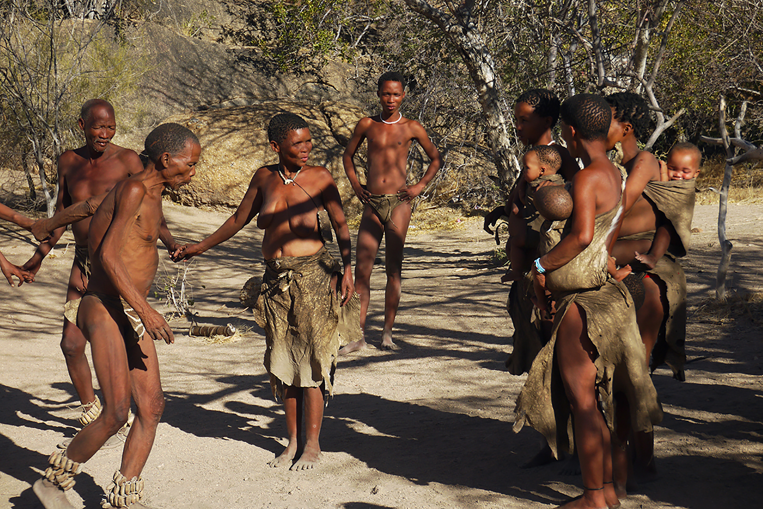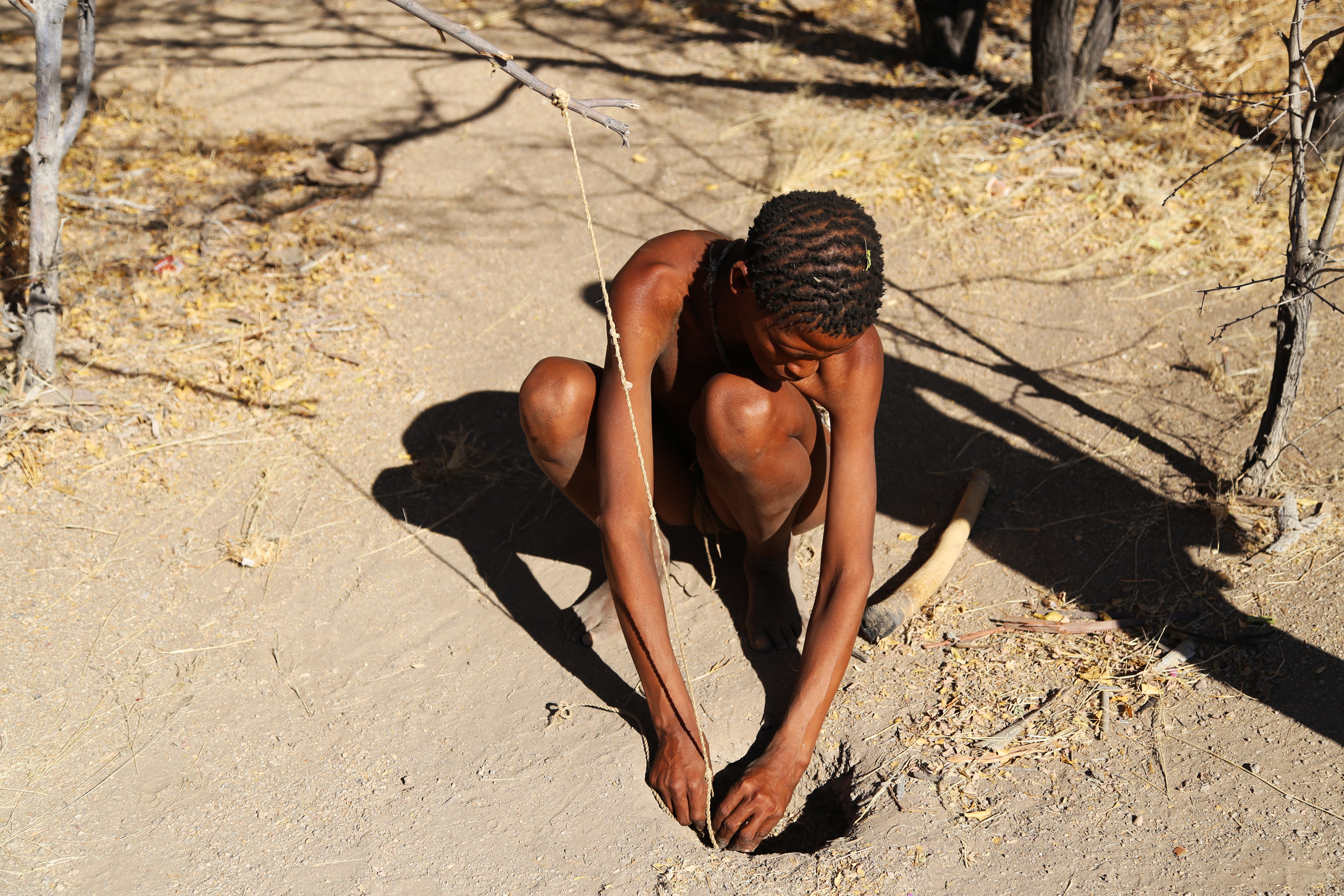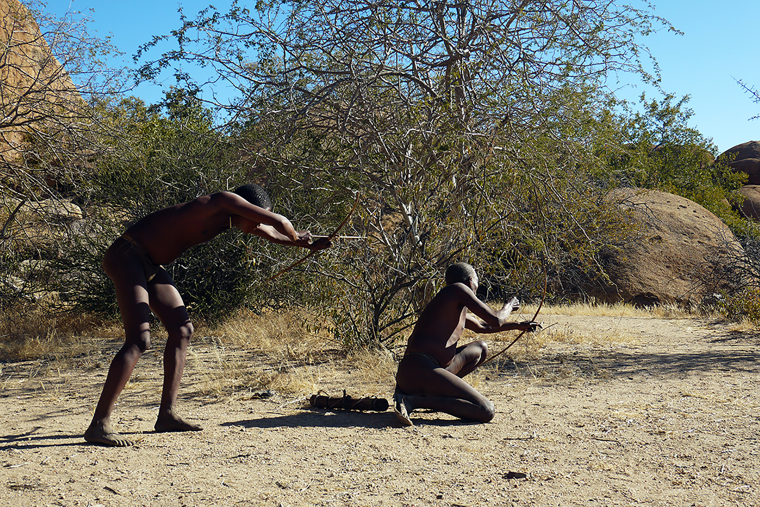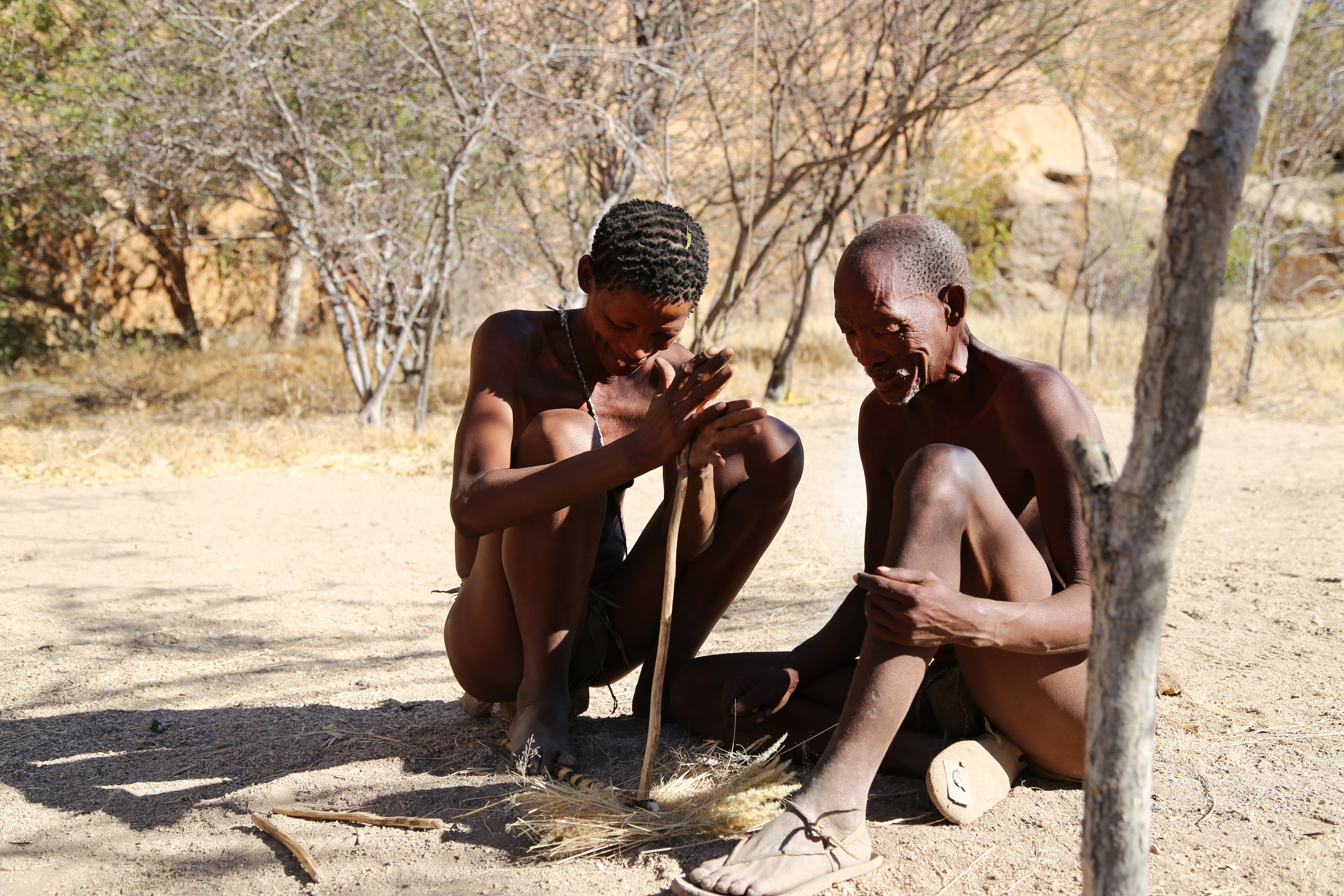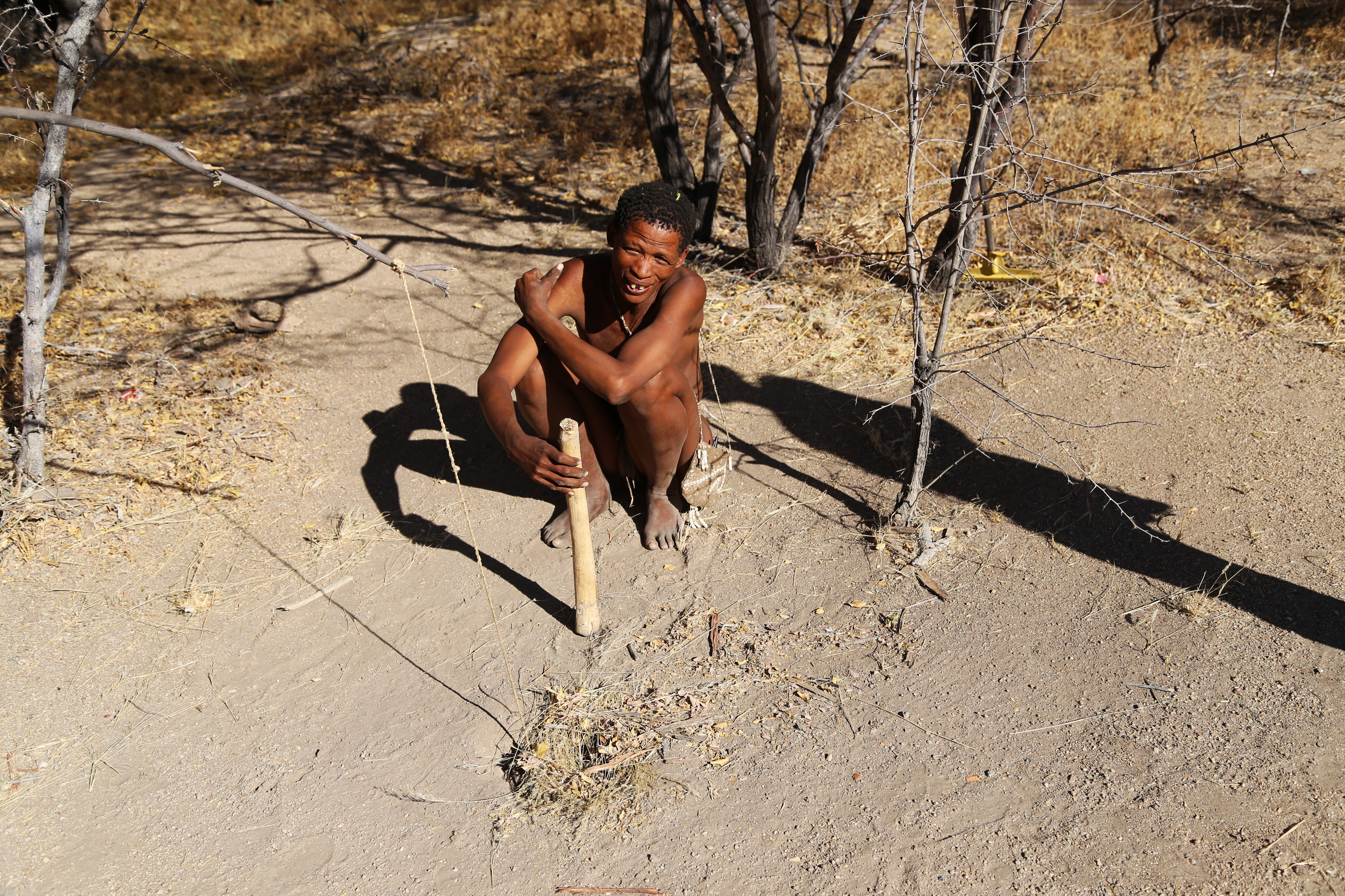 Une famille (grande famille !) nous montre le mode de vie ancestral de ce peuple de chasseurs-cueilleurs. Aujourd’hui, plus aucun Bushman ne vit comme cela mais les anciens tiennent à ce que les nouvelles générations n’oublient pas les traditions et continuent de transmettre leur philosophie de vie. Pour montrer leurs savoir-faire et les enseigner aux jeunes, des démonstrations ont lieu dans plusieurs endroits du pays sous la forme de « living museums ». On nous montre donc comment faire du feu avec deux morceaux de bois (en 2 minutes chrono !), comment fabriquer un piège pour chopper des pintades, un autre piège pour les antilopes, la chasse au tir à l’arc, la fabrication de bijoux en coquille d’œuf d’autruche, et enfin deux petites danses pour célébrer la pluie et la première chasse fructueuse d’un jeune Bushman.