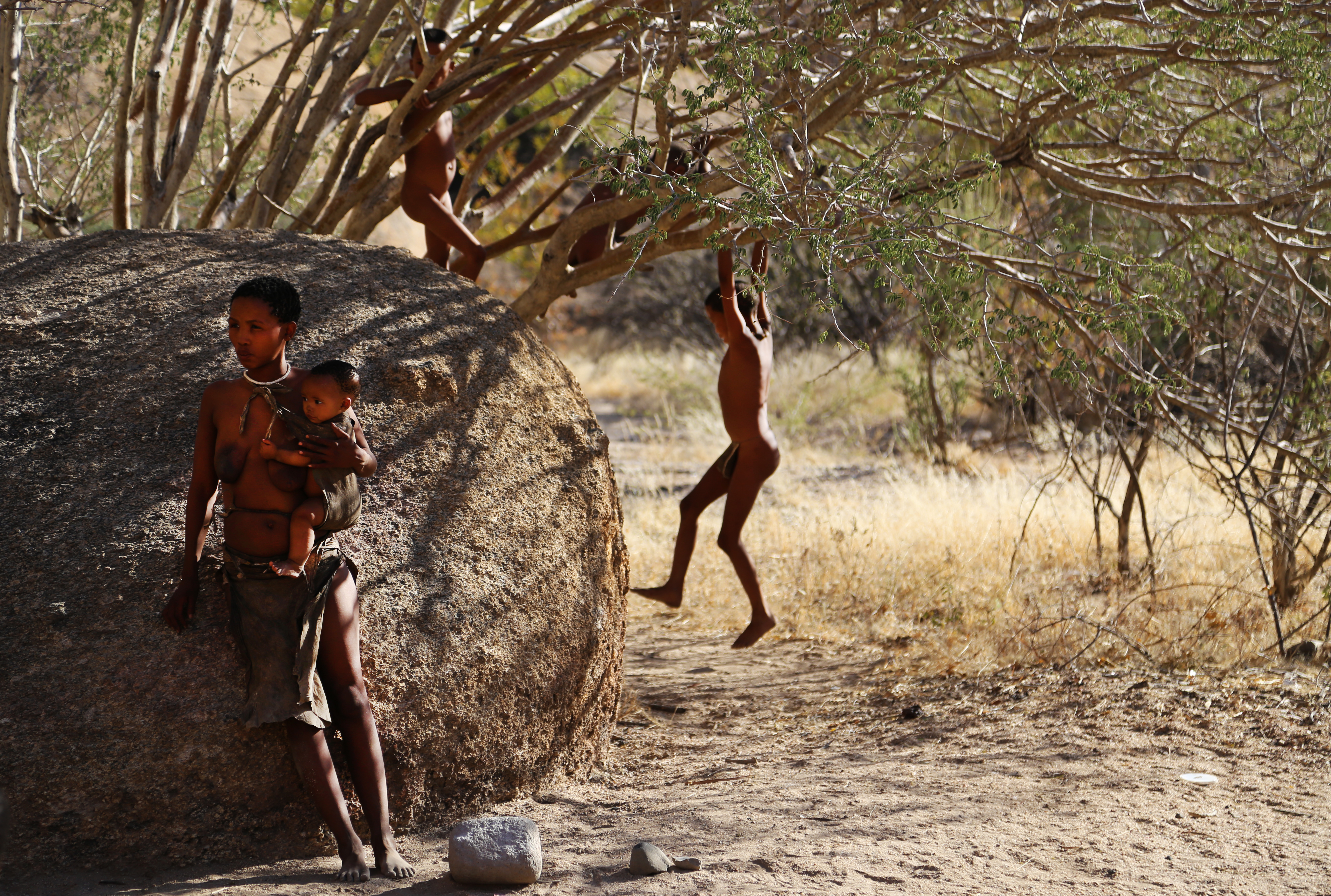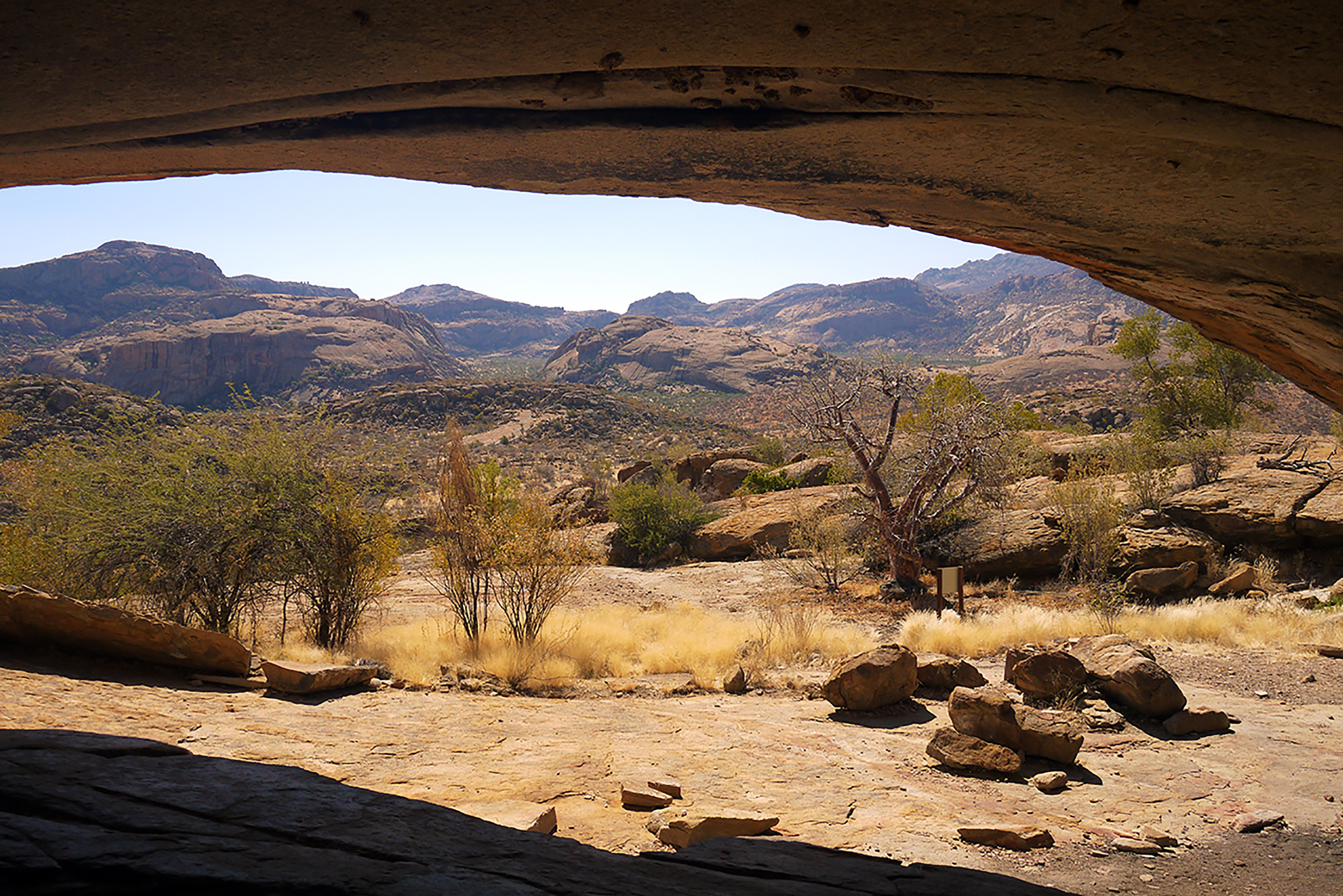 On quitte Ameib Ranch, qui nous a enchantés, vers 11h pour juste 1 heure de route vers la ferme Omandumba. On pique-nique sur notre terrasse face à la savane et aux monts Erongo, puis nous allons à la rencontre du peuple San, les Bushmen.