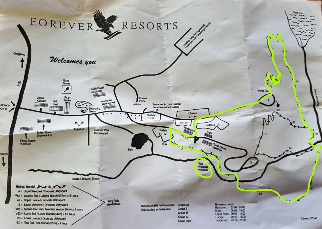 En arrivant au Forever Blyde resort, nous payons le droit d’entrée à la réception et allons stationner la voiture au restaurant pour rejoindre le départ de Leopard trail. Ce complexe hôtelier est immense et c’est le parking le plus central quand on veut enchaîner les trois randonnées.