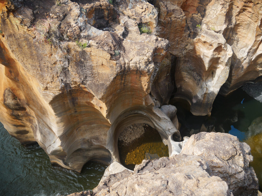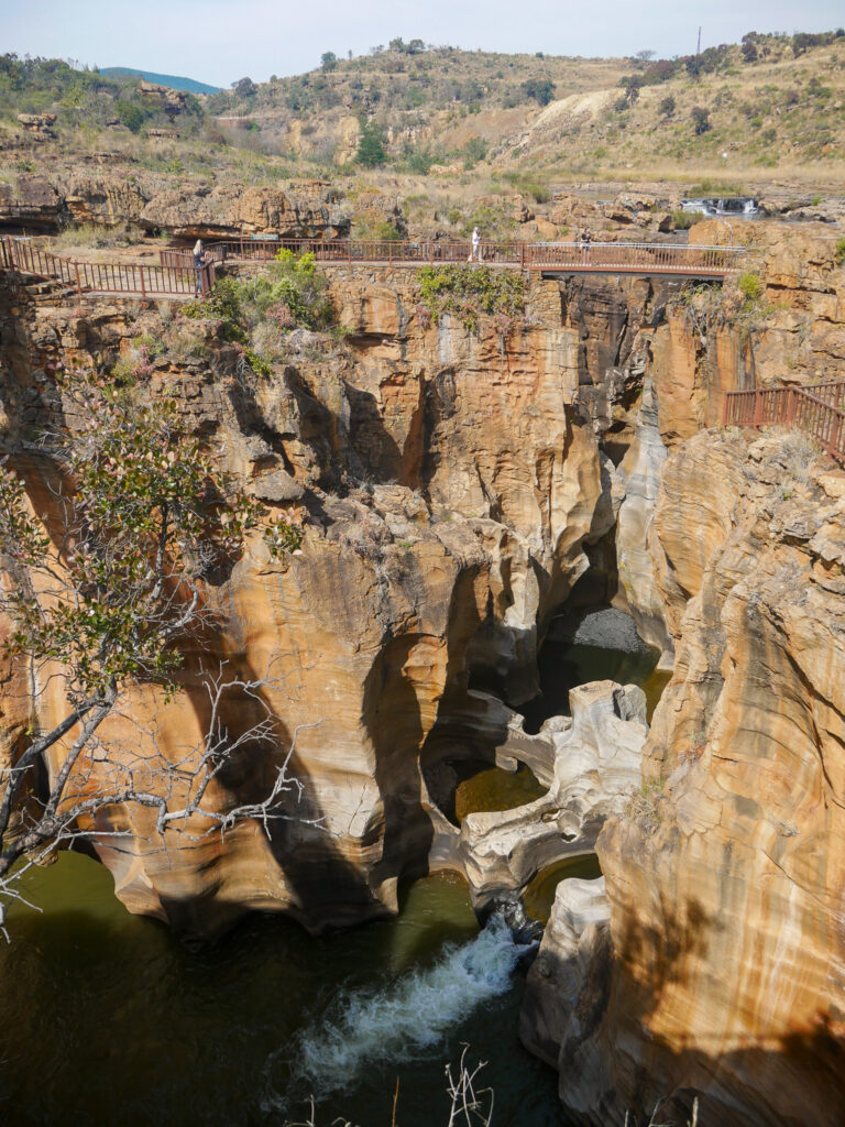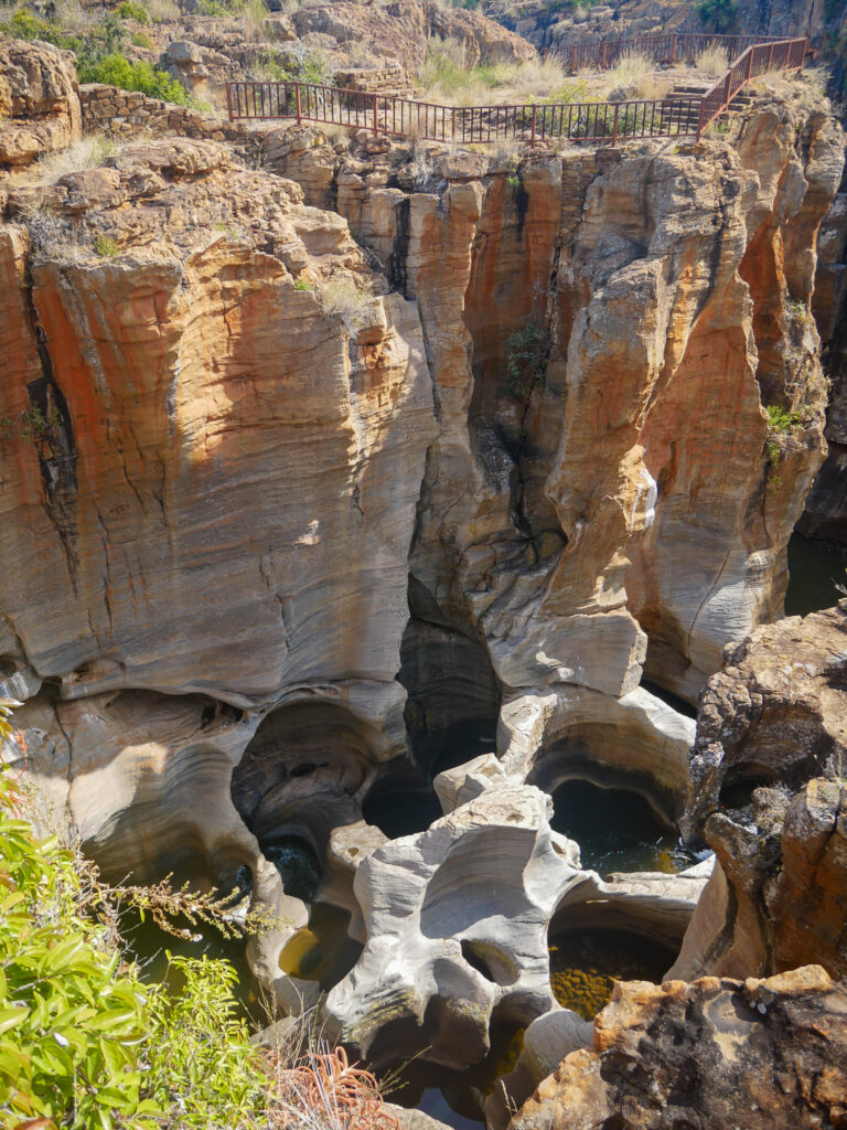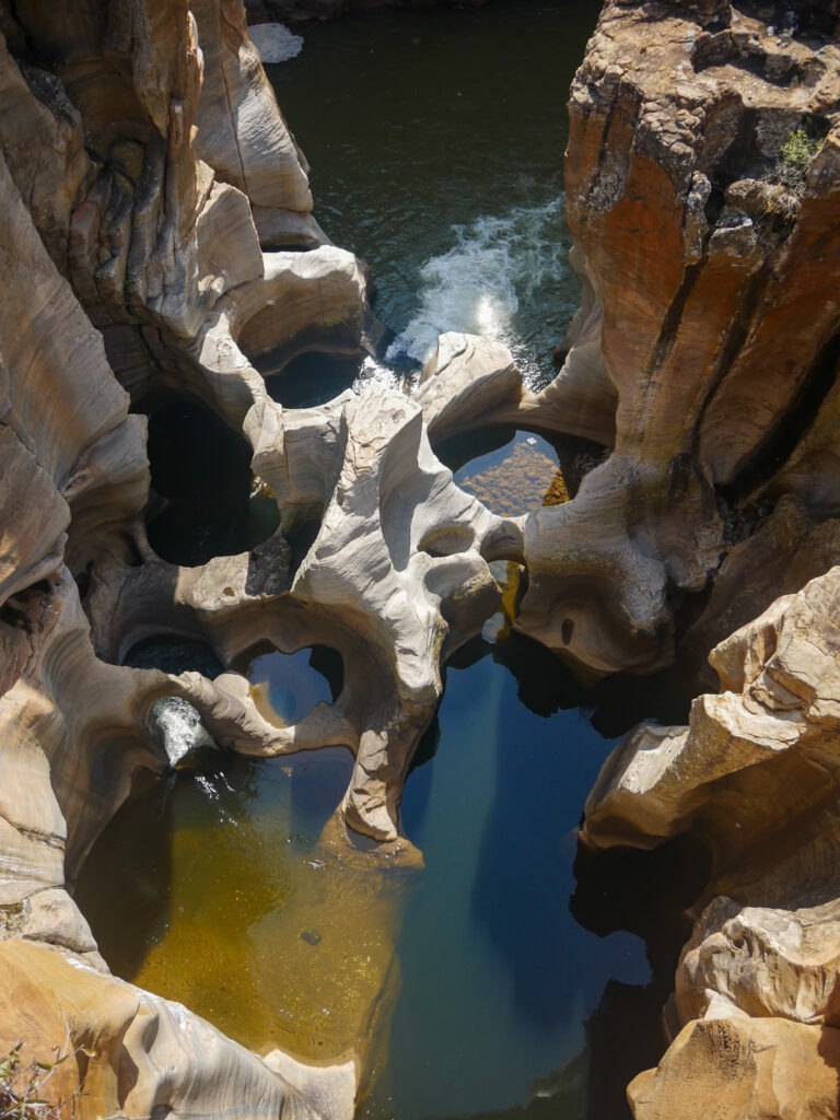 Prochain arrêt : Bourke Luck potholes. Pour une fois, on apprécie de voir des potholes ! Ceux-là sont creusés par le courant des rivières dans la roche tendre. On est au point de confluence des rivières Treur et Blyde. Une promenade aménagée permet de faire le tour du site. Ce n’est pas très long mais on peut facilement y passer 45 minutes tant les vues sont belles.