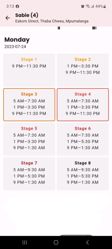 Il nous faut aussi attendre que l’eau revienne car elle est coupée. L’Afrique du Sud fait face à un gros problème d’approvisionnement en électricité à cause d’une forte demande et d’un réseau vieillissant qui ne fournit plus suffisamment. Il y a donc des coupures d’électricité plusieurs fois par jour pendant plusieurs heures (7 à 9 heures par jour en cumulé) pour délester le réseau. Ils appellent ça le load shedding. Lorsque la coupure est trop longue, comme ça a été le cas cette nuit, la pompe qui alimente la ville en eau doit se relancer pour renvoyer de l’eau dans les tuyaux et ça entraîne une coupure d’eau. En l’occurrence, ce matin l’eau n’est revenue que 2 heures après le retour de l’électricité. En étant juste de passage pour les vacances, on prend notre mal en patience, mais pour les sud-africains c’est très difficile au quotidien. Par exemple, voilà le planning pour le secteur de Graskop et Sabie, que la propriétaire du Airbnb nous a envoyé :