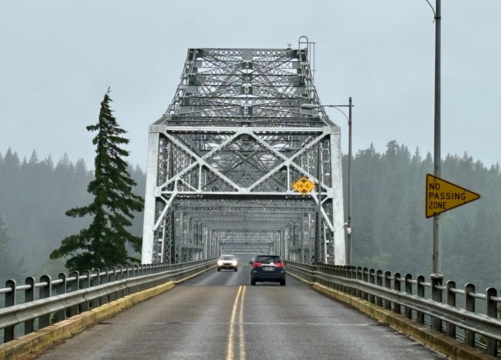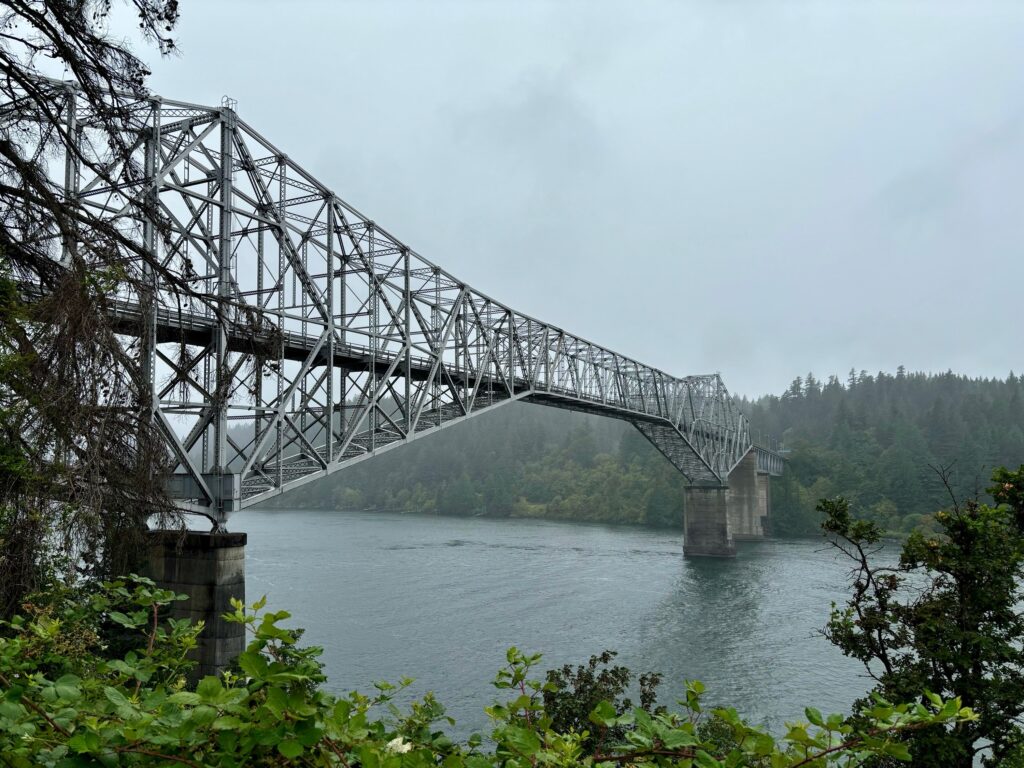 De retour dans les gorges de la Columbia river, les nuages sont bas et il tombe un crachin qui nous fait renoncer à une pourtant courte rando. Nous n’avons pas de vêtements de pluie. On fait un arrêt au Bridge of the gods, là où Cheryl arrête son périple sur le Pacific Crest Trail dans Wild. Il fait aussi beau que dans le film !