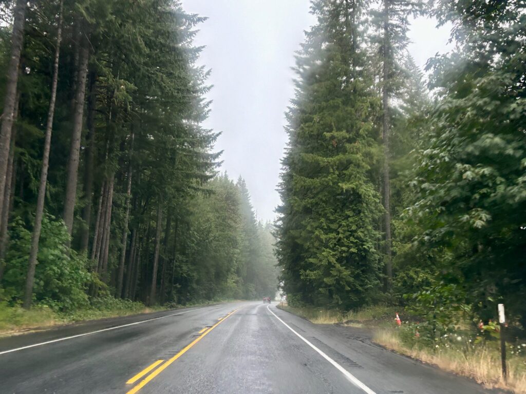 On s’arrête faire quelques courses à Hood River et on quitte les bords de la Columbia river pour remonter vers le Mount Hood. Il est complètement masqué par ces satanés nuages qui s’éternisent et qui donnent un côté mystérieux à la route forestière. On traverse des villages aux noms surprenants : Government Camp, Rhododendron, Zig Zag.
