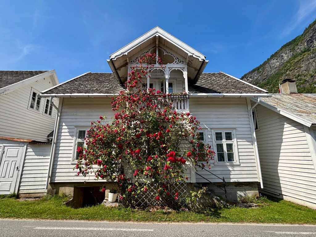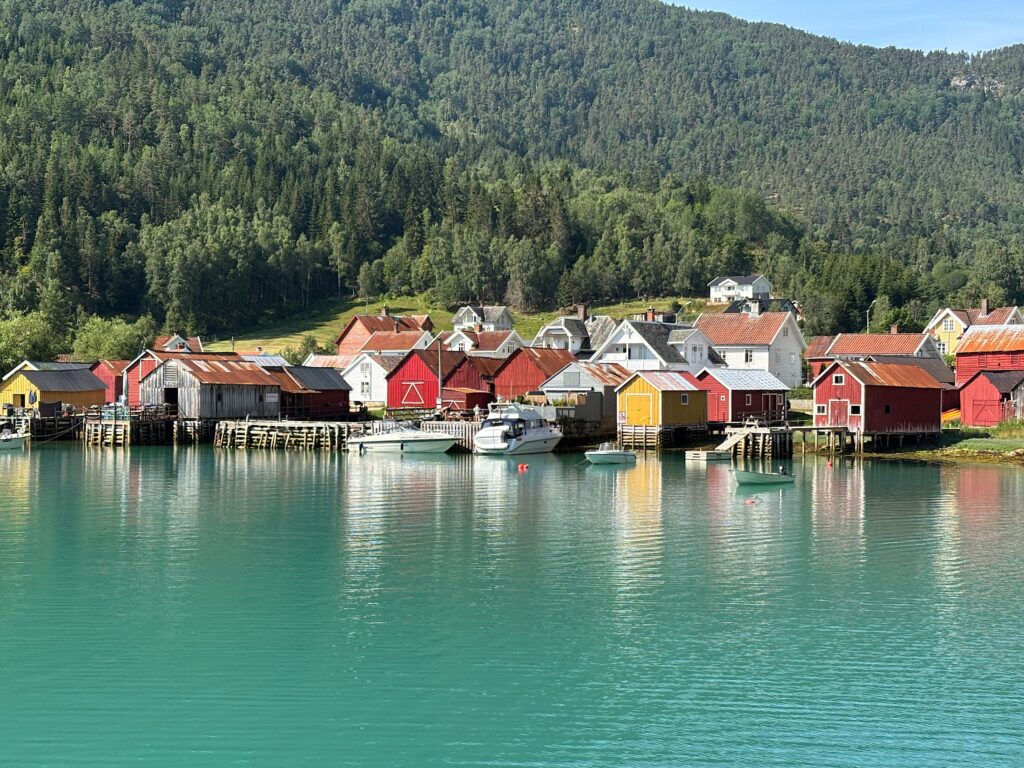 Après une presque grasse matinée, nous faisons un petit quart d’heure de route pour aller à Solvorn. Ce village est situé sur les rives du Lustrafjorden, un bras intérieur du Sognefjord. Non seulement le village est super mignon mais il s’en dégage une tranquillité qui donne envie d’y rester. Les hangars à bateaux colorés s’alignent le long de l’eau turquoise où les baigneurs barbotent, le soleil brille, les maisons sont fleuries, c’est calme. L’endroit rêvé pour passer des vacances !