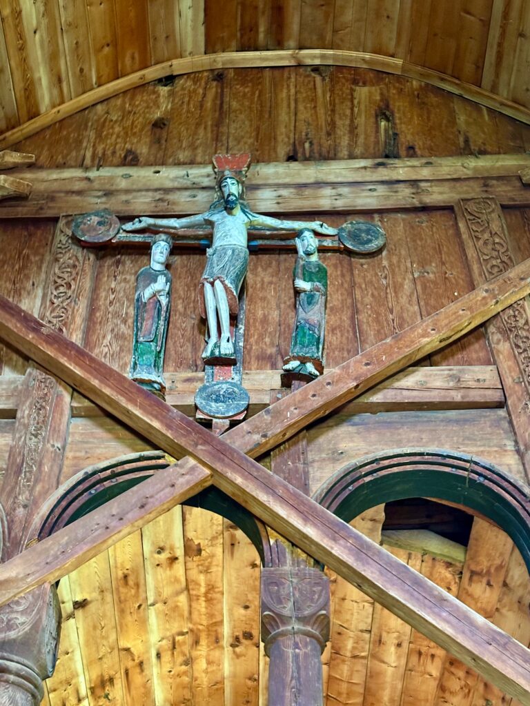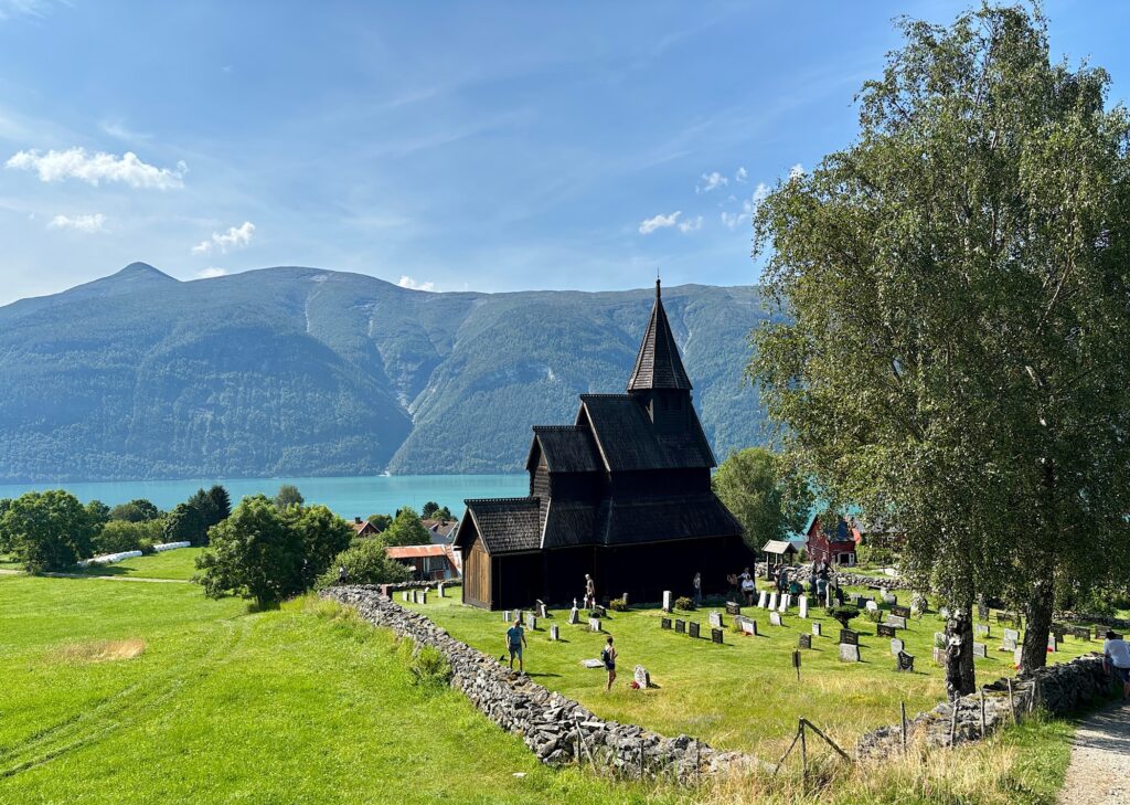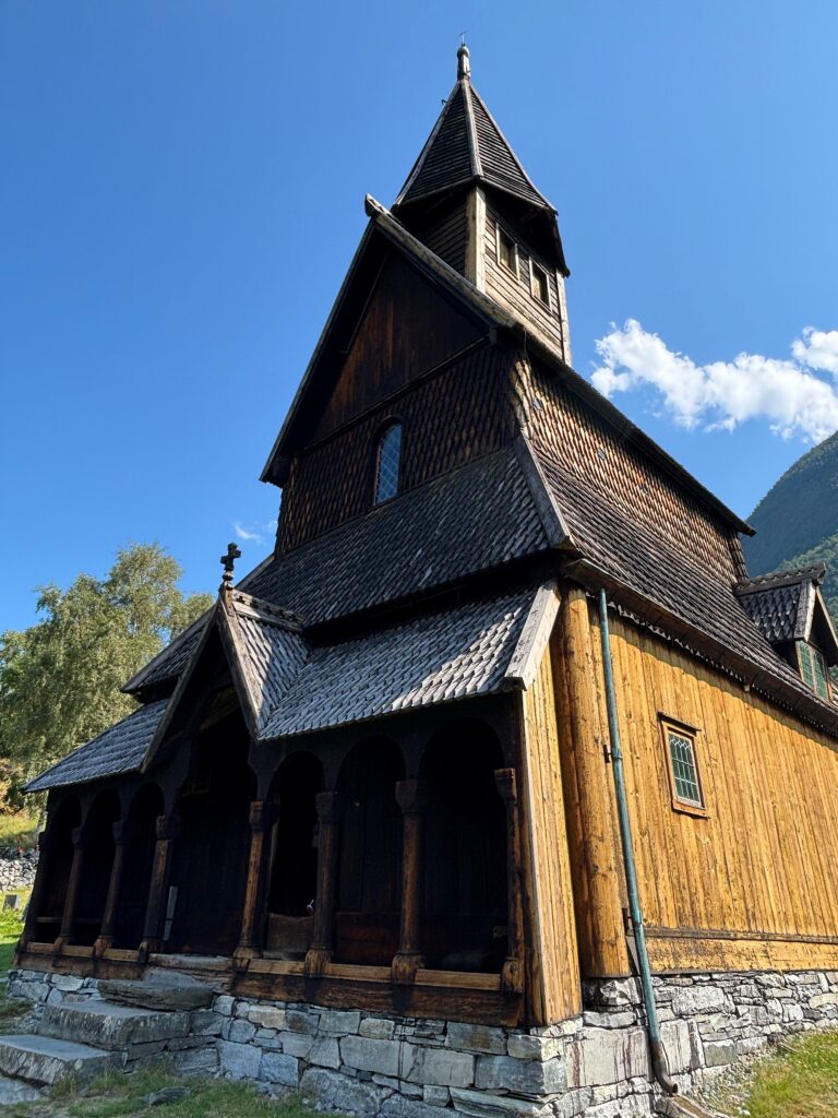De Solvorn, un ferry permet d’atteindre le village d’Ornes sur la rive d’en face, qui abrite la plus ancienne et la plus décorée des églises en bois debout de Norvège : Urnes stavkirkje. Elle est inscrite sur la liste de l’UNESCO depuis 1979. Posée sur des fondations en pierre qui l’ont protégée de l’humidité, elle a traversé les temps depuis le 12ème siècle. À l’intérieur, un ensemble de sculptures du Christ, de la vierge Marie et de Saint-Jean datent également du 12ème siècle, tout comme le siège qu’occupait le riche donateur de l’église. Les peintures du Christ sont d’origine et celles de Marie et Jean n’ont pas été rénovées depuis le 13ème siècle. Les troncs d’arbres qui composent la structure de l’église ont été abattus entre 1129 et 1130. Un bail !