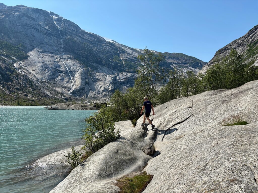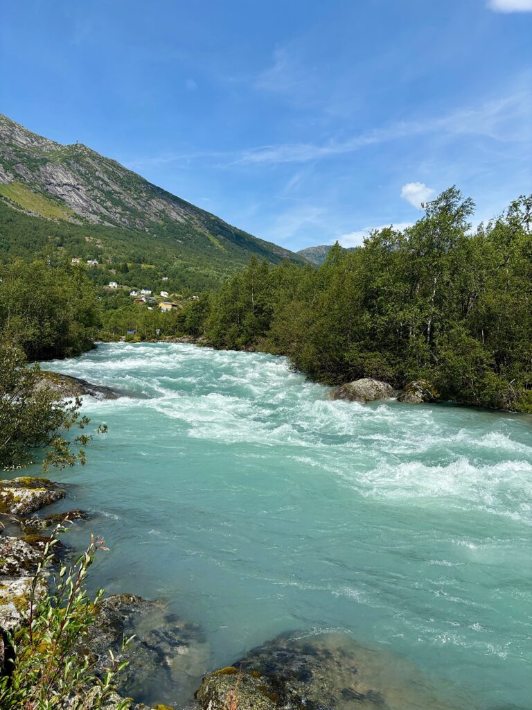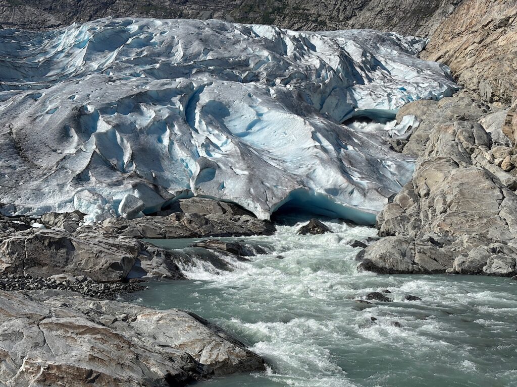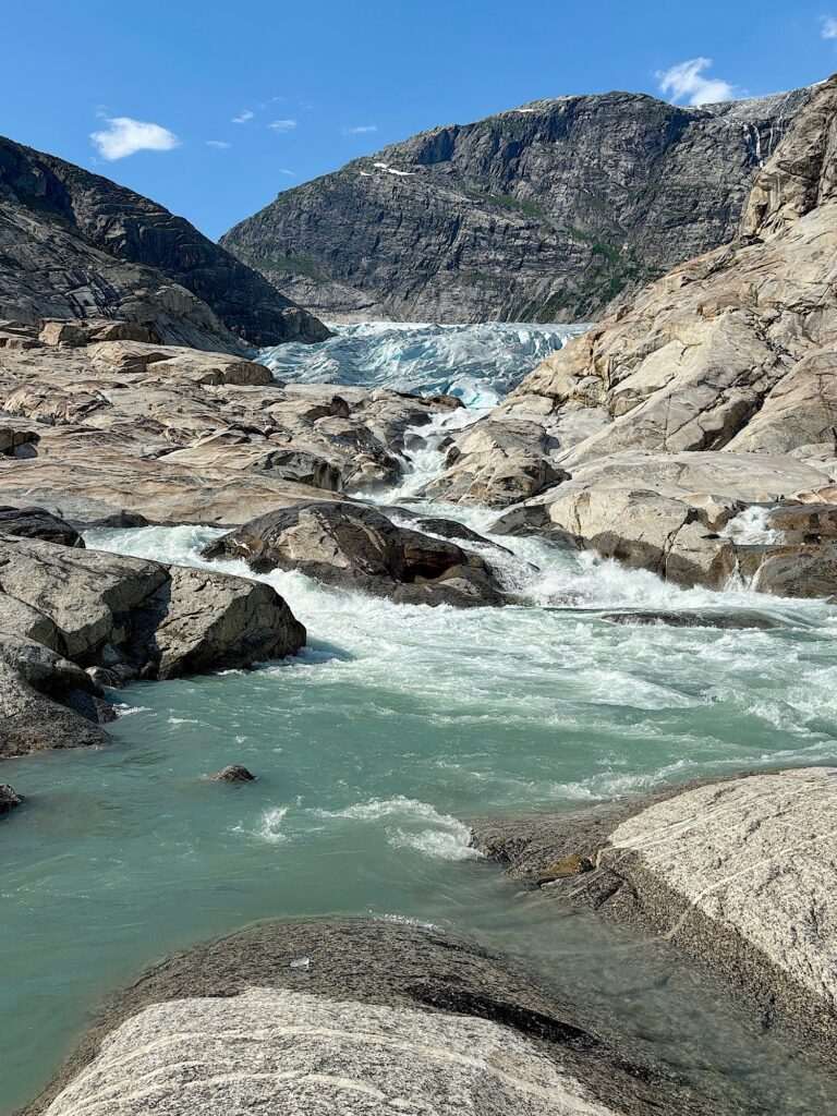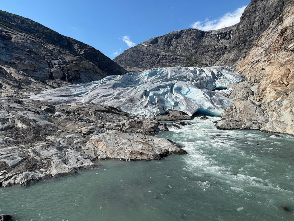 Nous avions prévu de faire la randonnée jusqu’au sommet du mont Molden cet après-midi mais il fait trop chaud. On préfère reporter à demain matin et plutôt aller chercher un peu de fraîcheur au pied d’un glacier. On déjeune à la maison et repartons donc en début d’après-midi pour le Nigardsbreen. Facile d’accès, il est l’un des bras du plus grand glacier d’Europe continentale, le Jostedalsbreen. Pour s’y rendre, la route longe la magnifique rivière Jostedøla, alimentée par l’eau des glaciers.