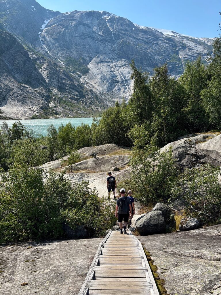 La randonnée pour atteindre le pied du Nigardsbreen fait 5,2 km aller-retour. Le sentier est assez glissant car on marche la plupart du temps sur de grandes dalles de pierre. Ce n’est pas une rando à entreprendre par temps humide ! Des escaliers en bois et des cordes aident à franchir les endroits les plus critiques.