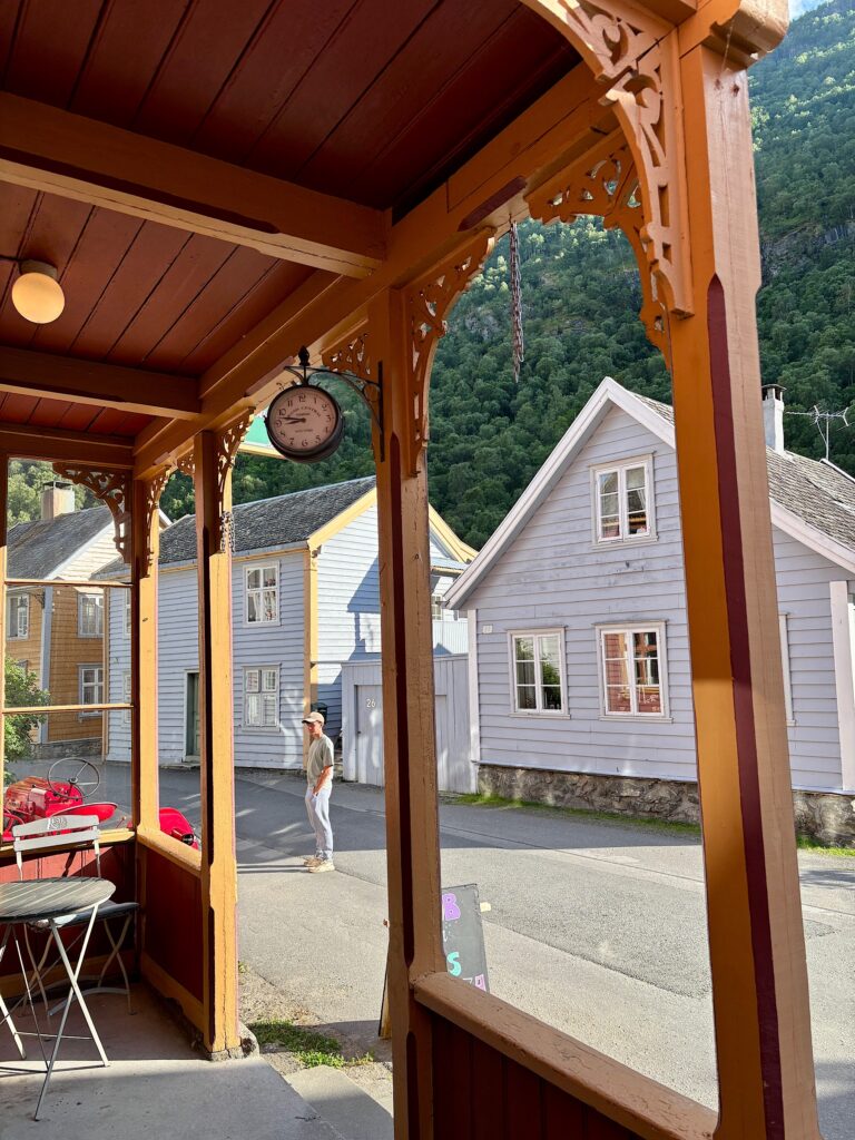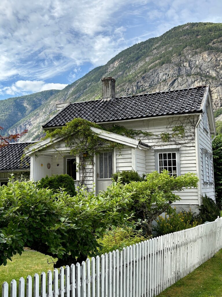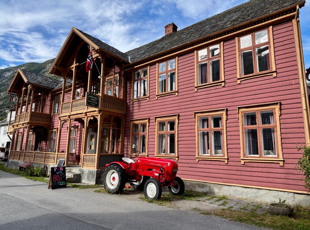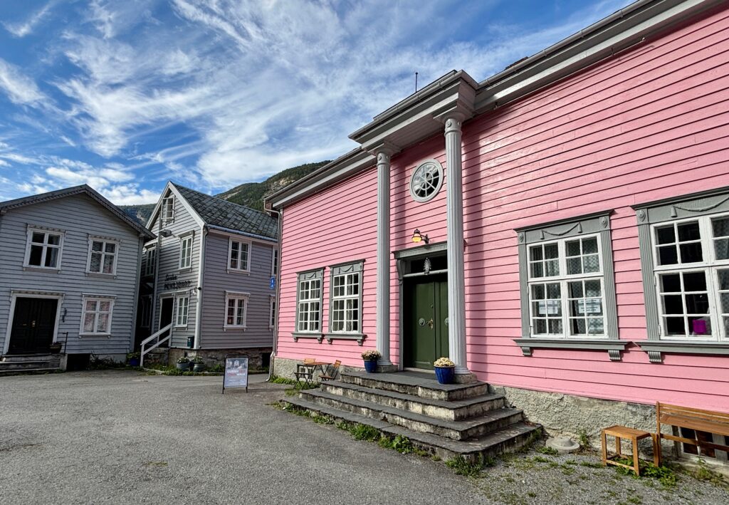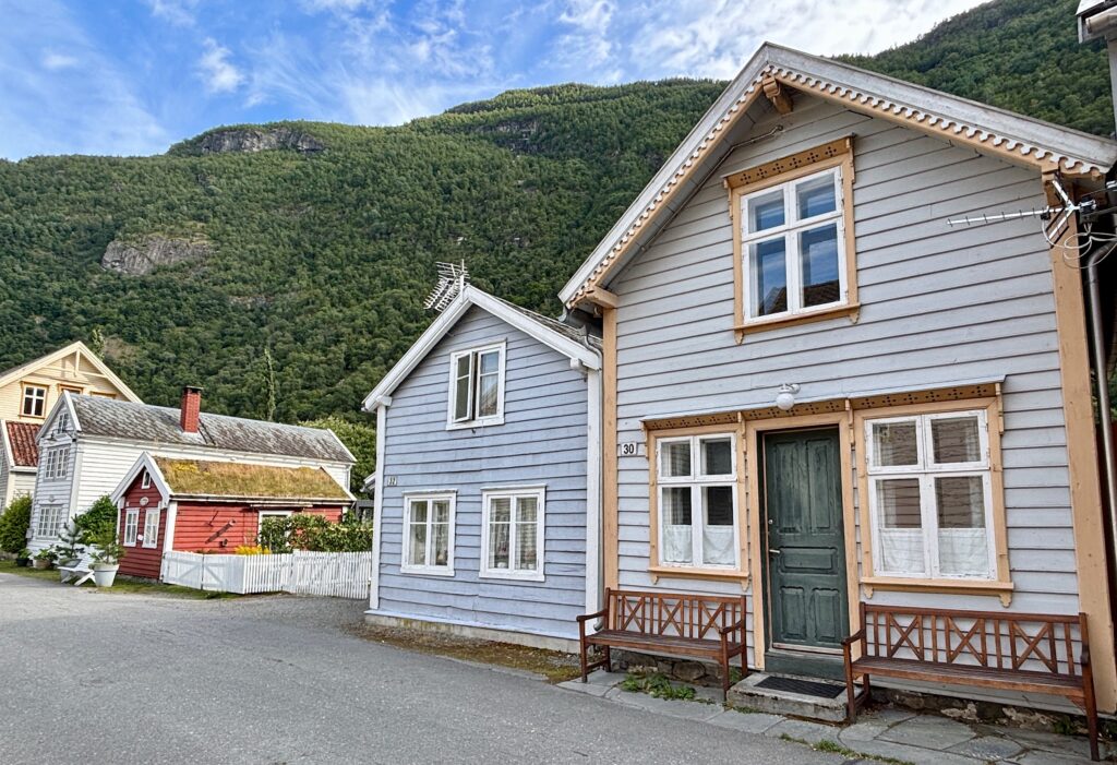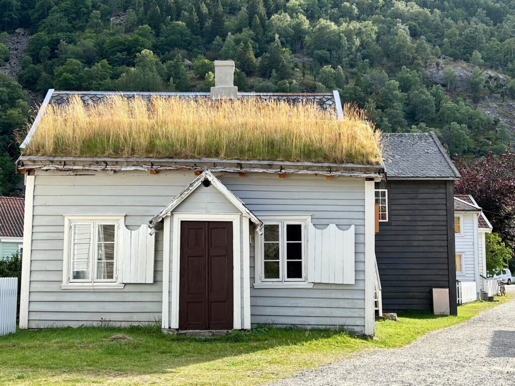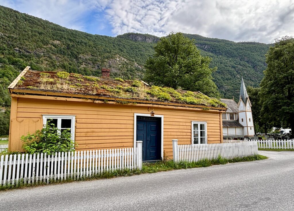 Après le gros village de Øvre Årdal, nous arrivons à Laerdalsoyri où se trouve notre logement. La maison est top et le village est magnifique. Comme nous n’avons pas beaucoup marché aujourd’hui, nous partons à pied pour visiter. Les maisons anciennes en bois ont été sauvegardées, créant un ensemble historique très intéressant. Il y a environ 160 maisons en bois qui datent du 18ème siècle.