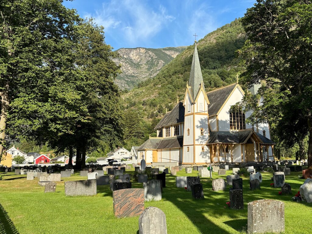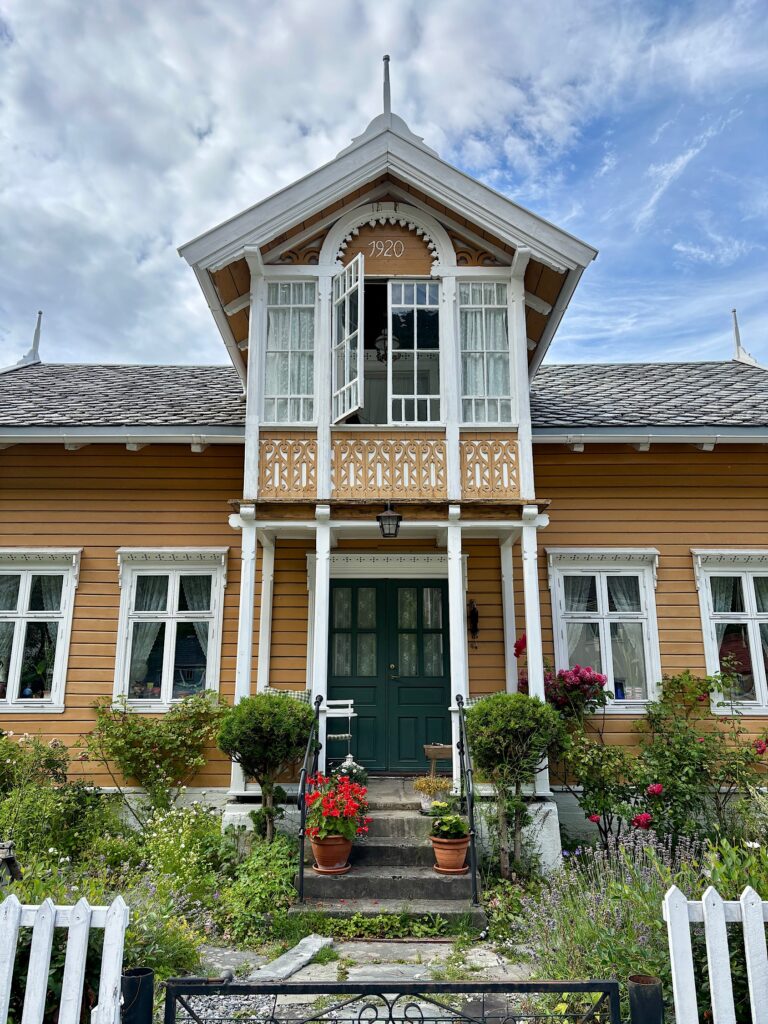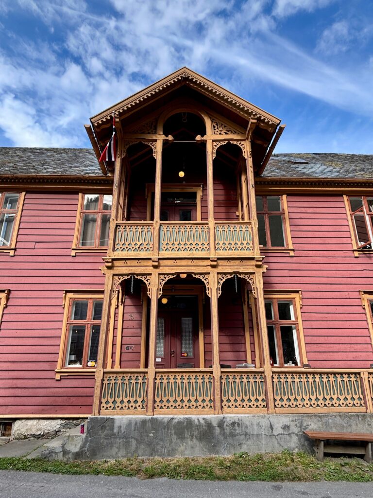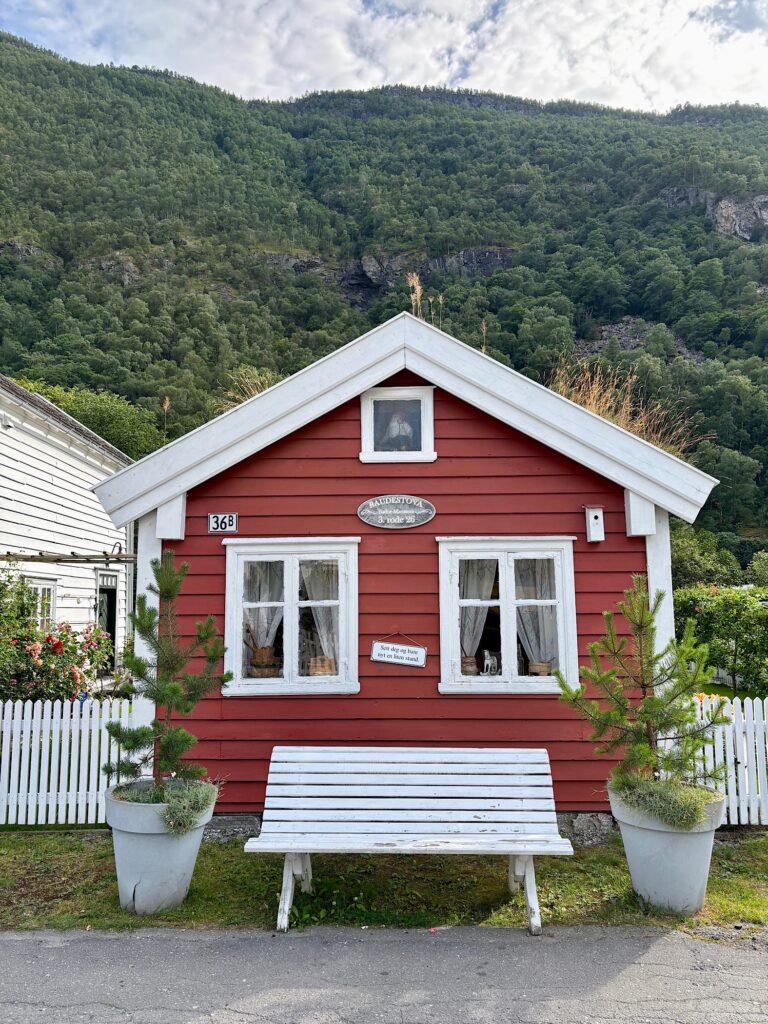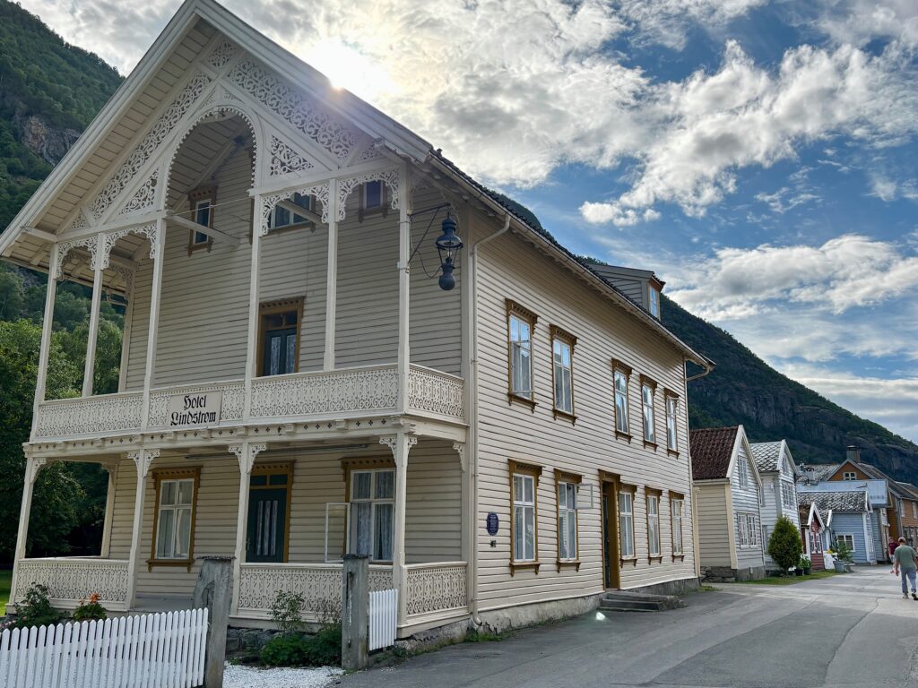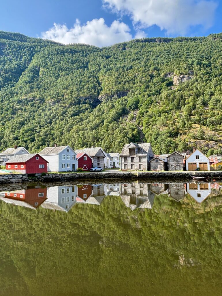 Après le gros village de Øvre Årdal, nous arrivons à Laerdalsoyri où se trouve notre logement. La maison est top et le village est magnifique. Comme nous n’avons pas beaucoup marché aujourd’hui, nous partons à pied pour visiter. Les maisons anciennes en bois ont été sauvegardées, créant un ensemble historique très intéressant. Il y a environ 160 maisons en bois qui datent du 18ème siècle.